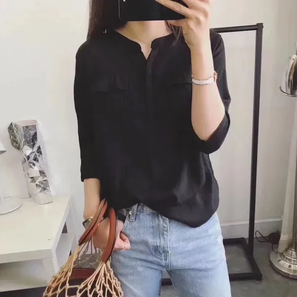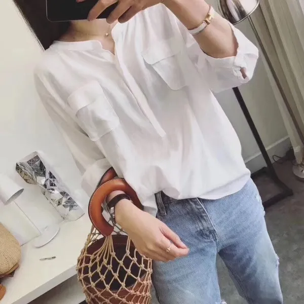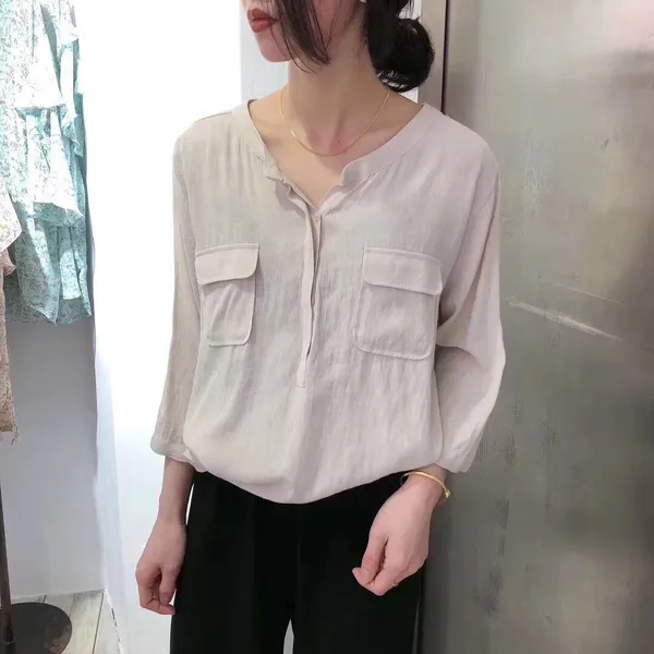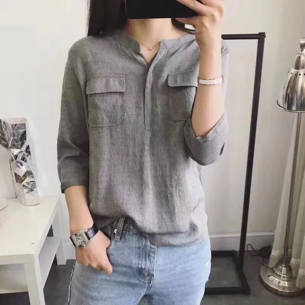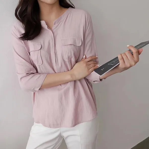 韓 雙口袋棉麻上衣 (白/灰/黑/粉/藍/杏)