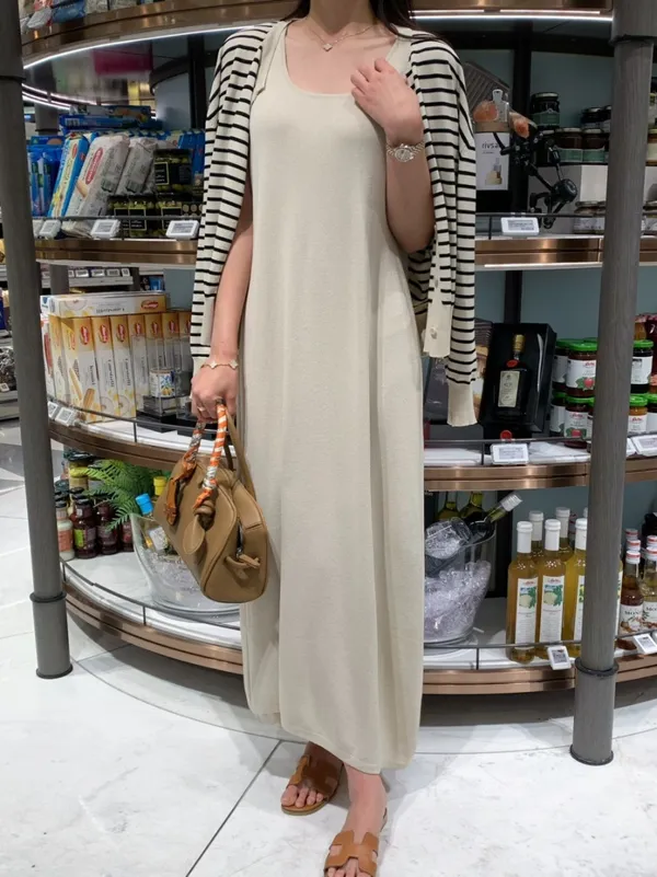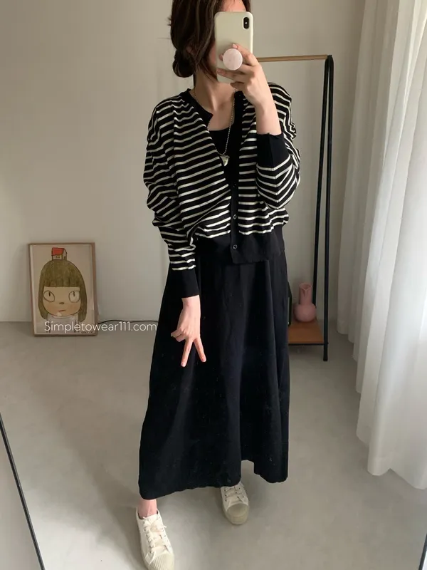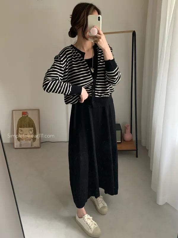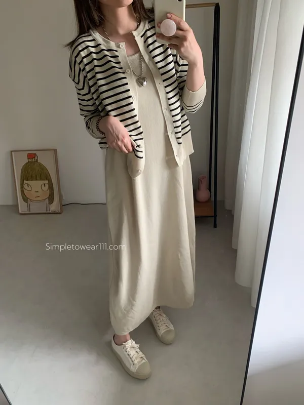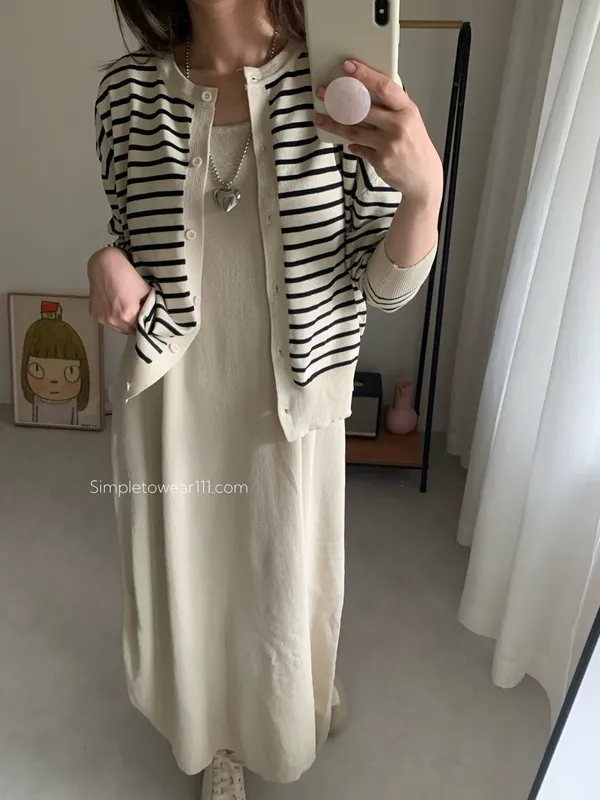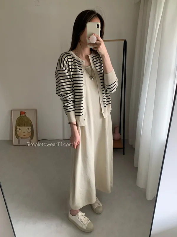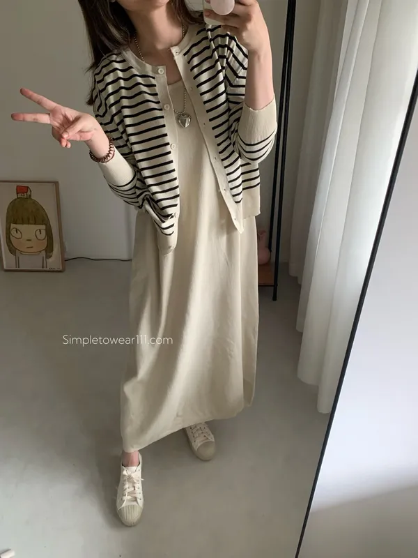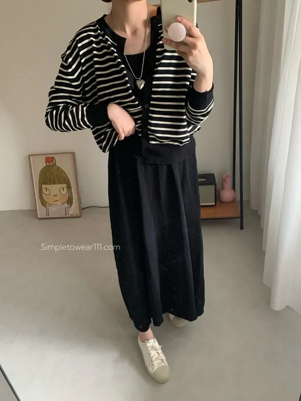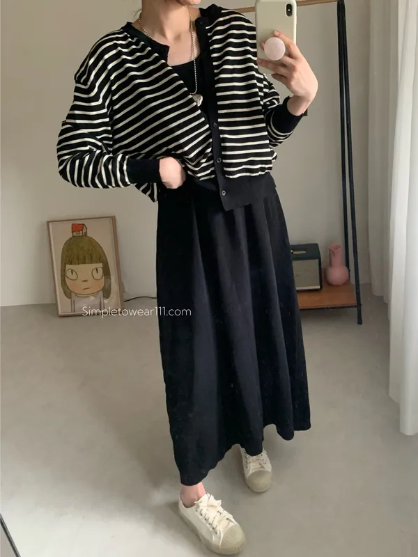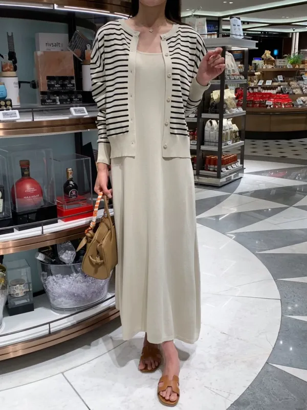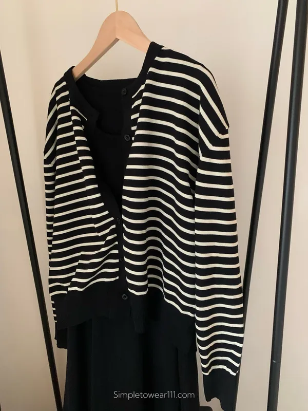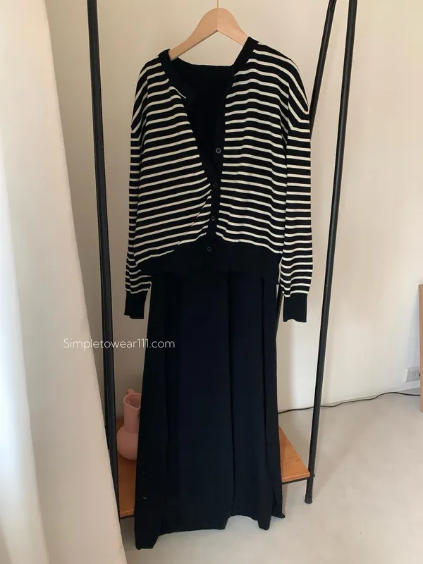 韓 氣質針織洋裝配條紋罩衫 (黑/杏)