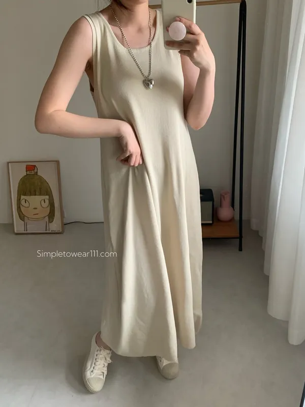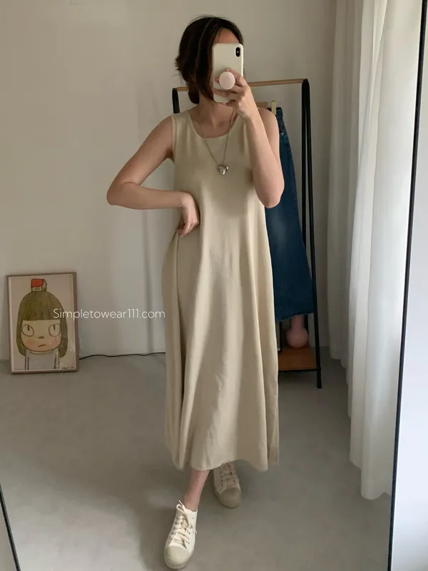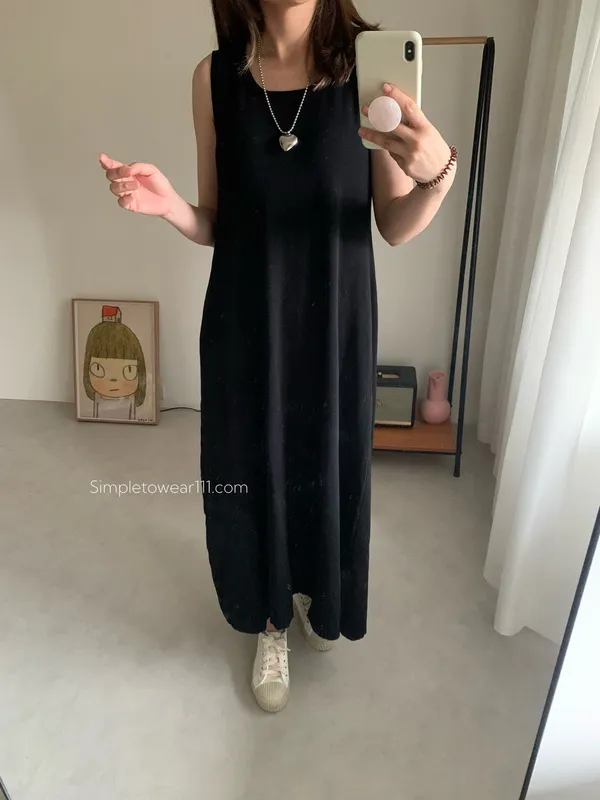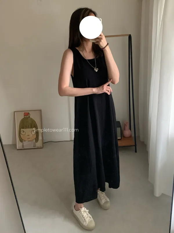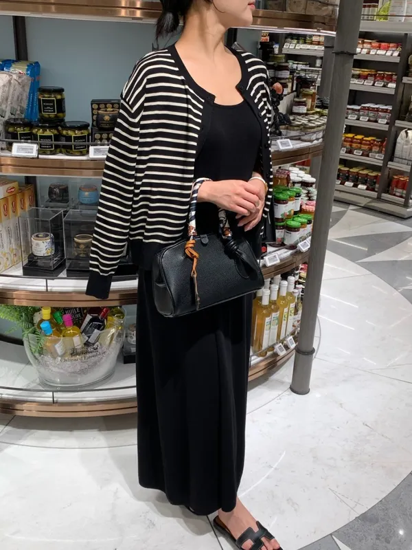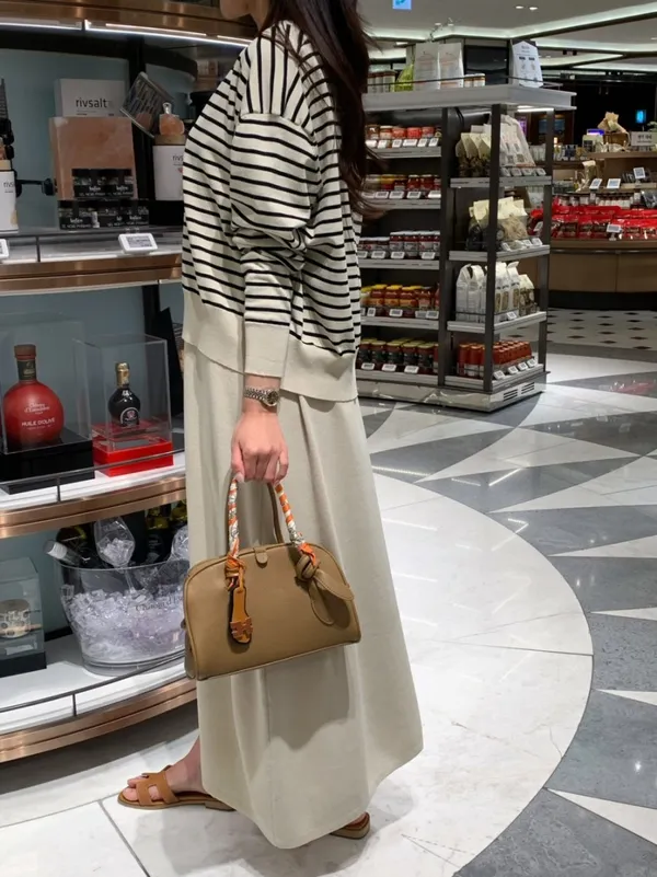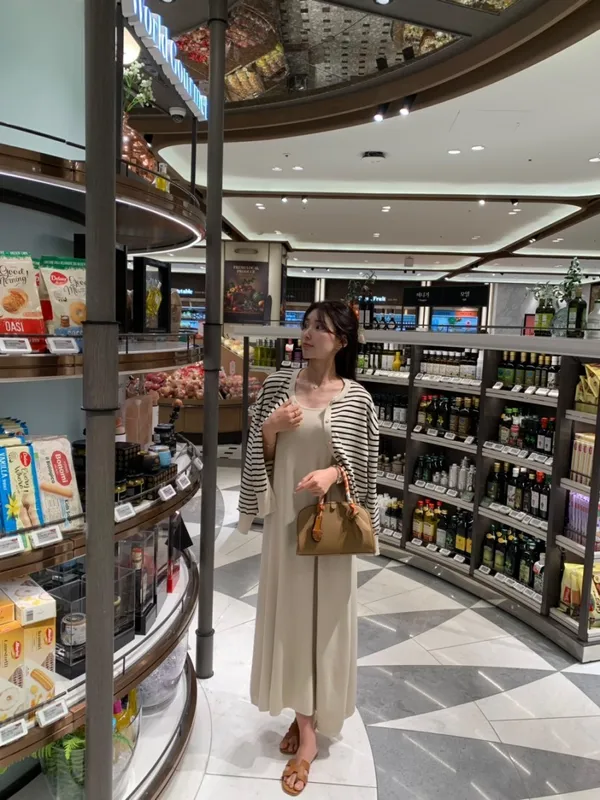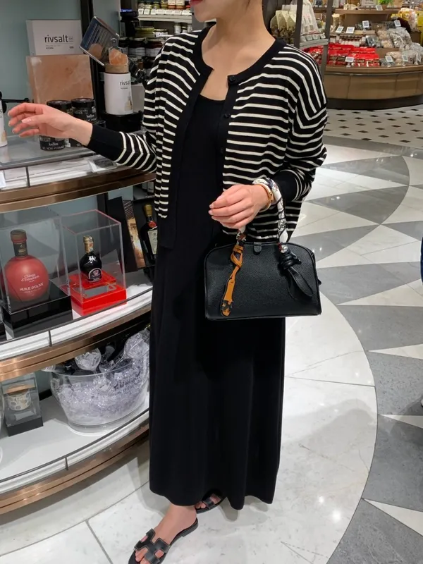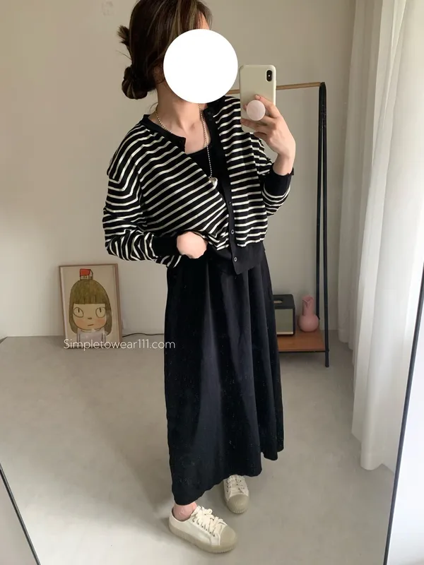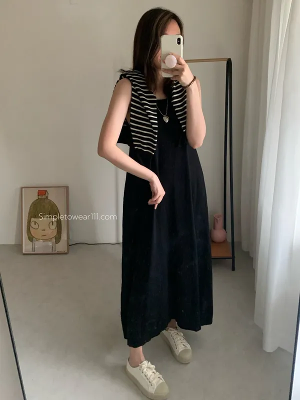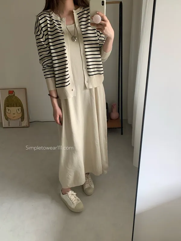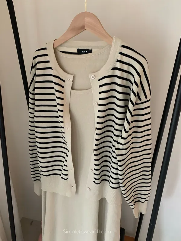 韓 氣質針織洋裝配條紋罩衫 (黑/杏)