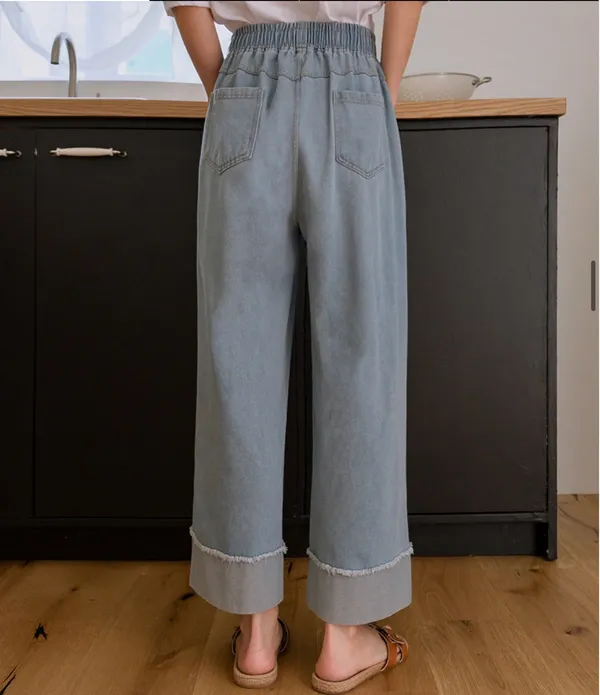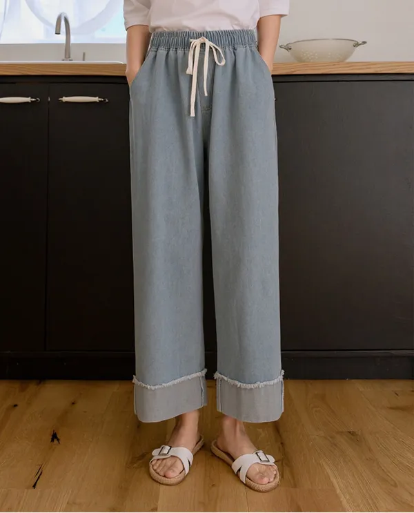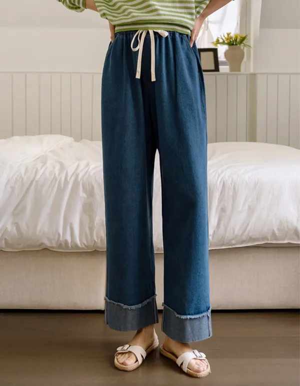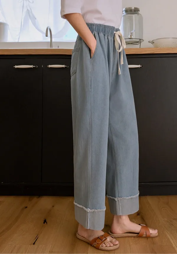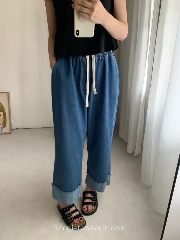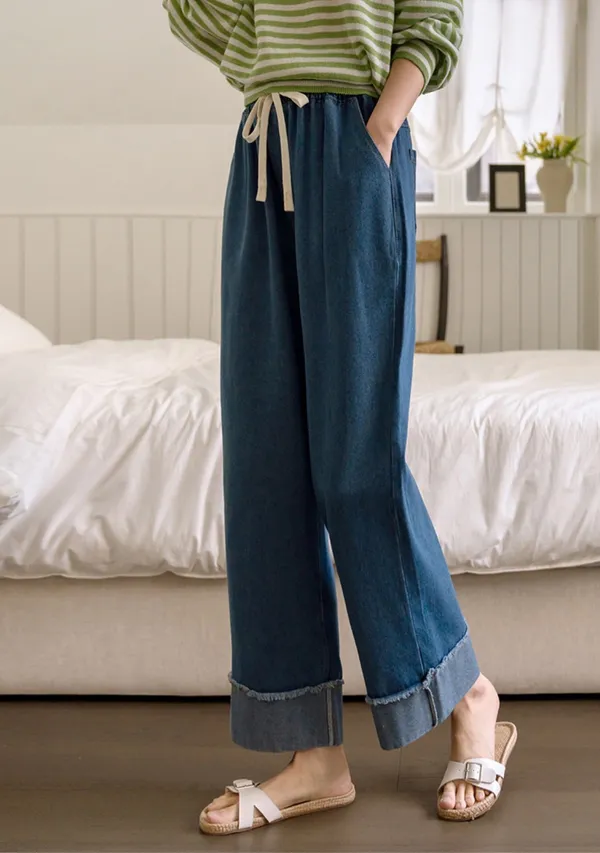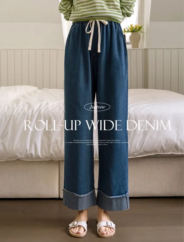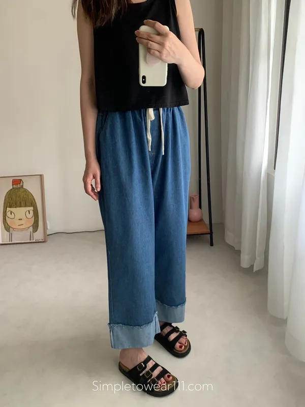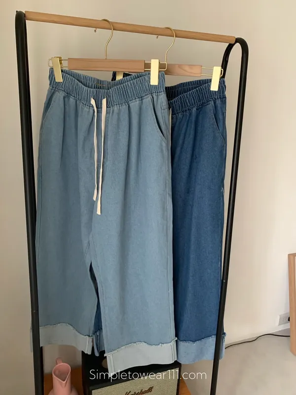 韓 反摺設計牛仔直筒寬褲 (深藍/淺藍)