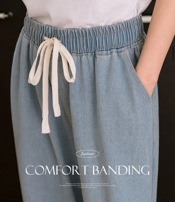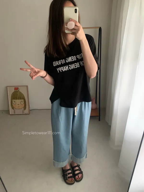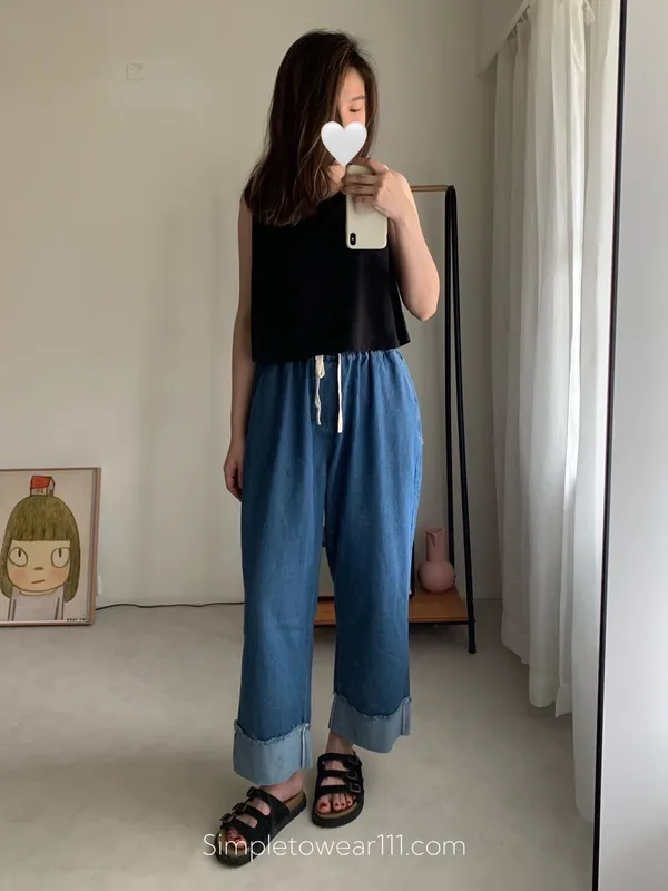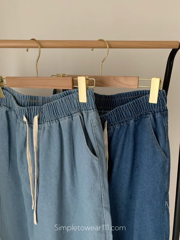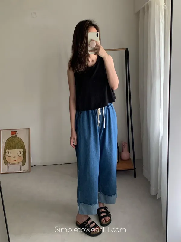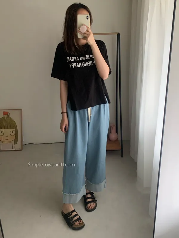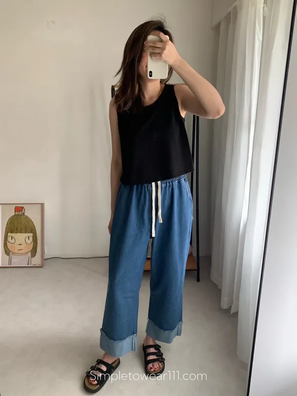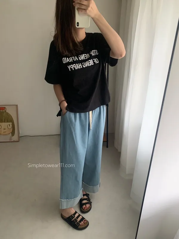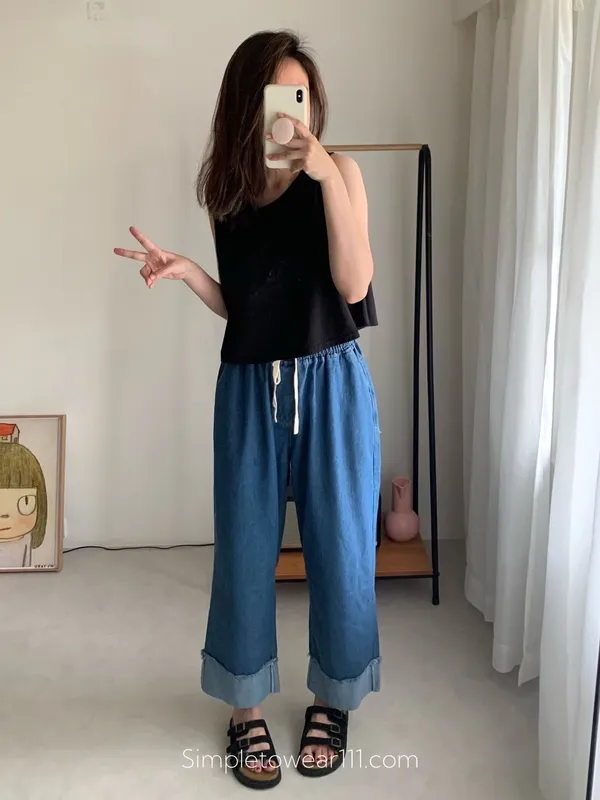 韓 反摺設計牛仔直筒寬褲 (深藍/淺藍)