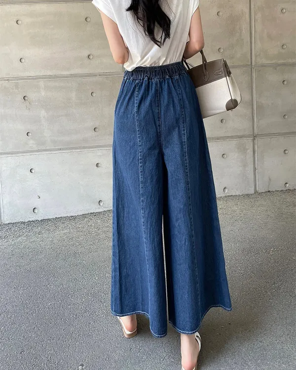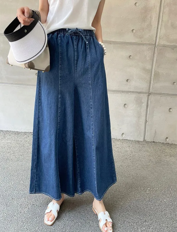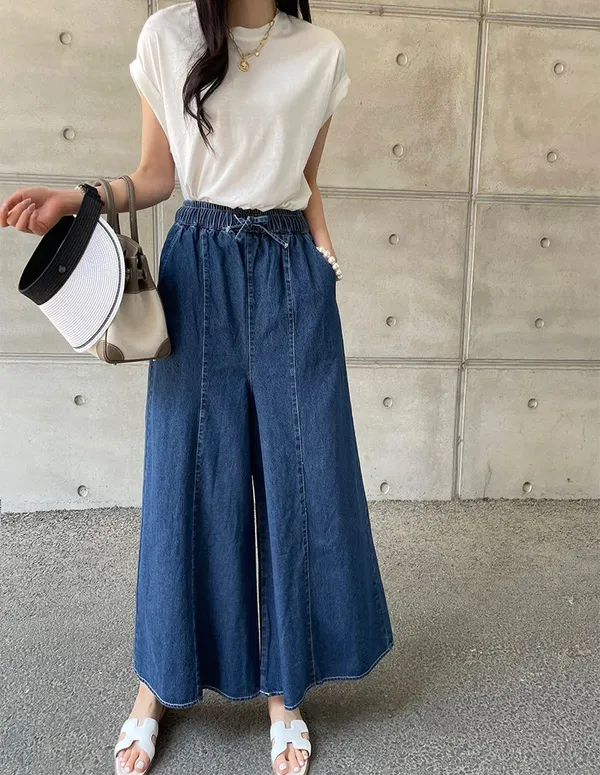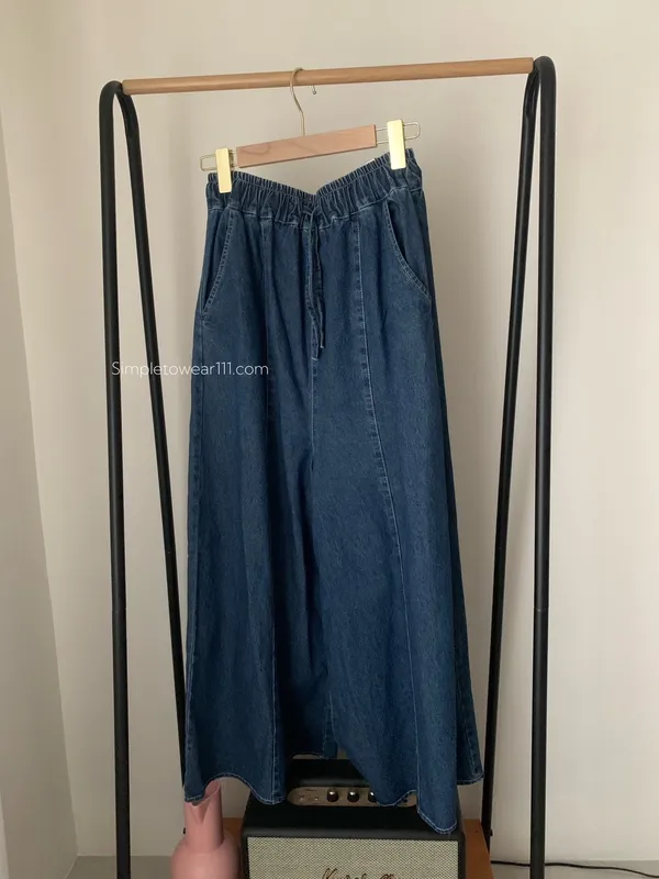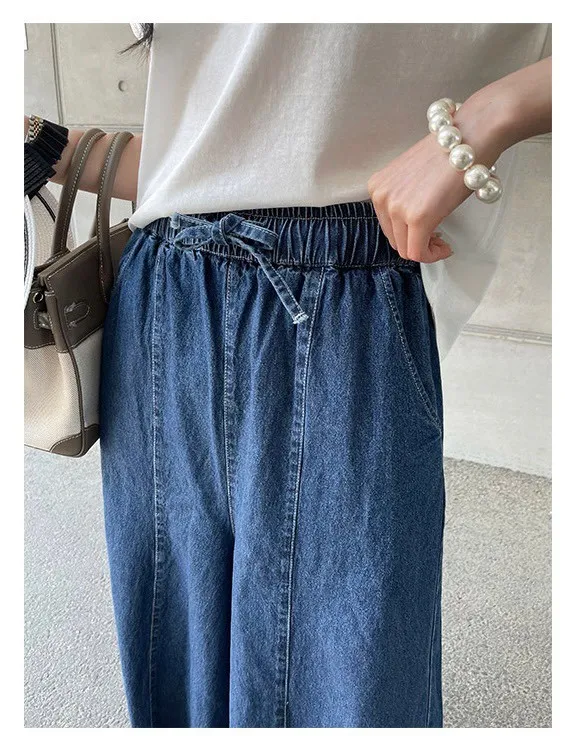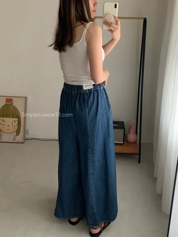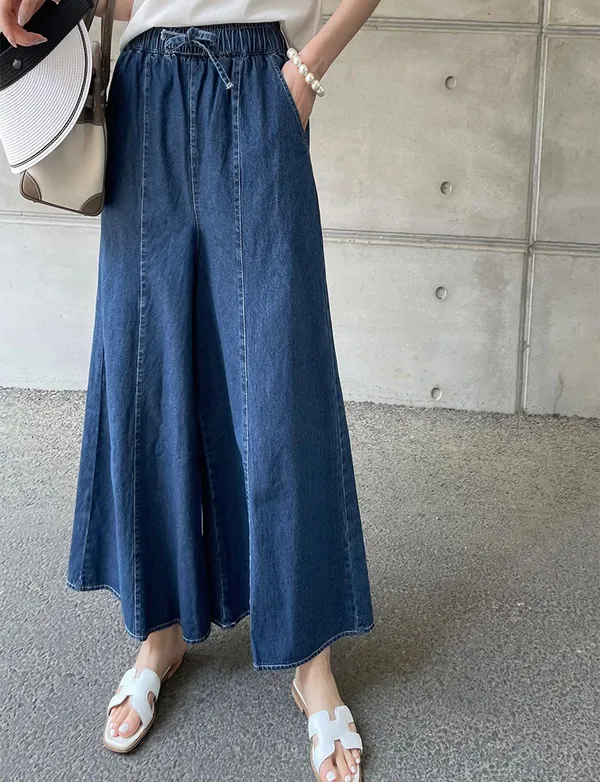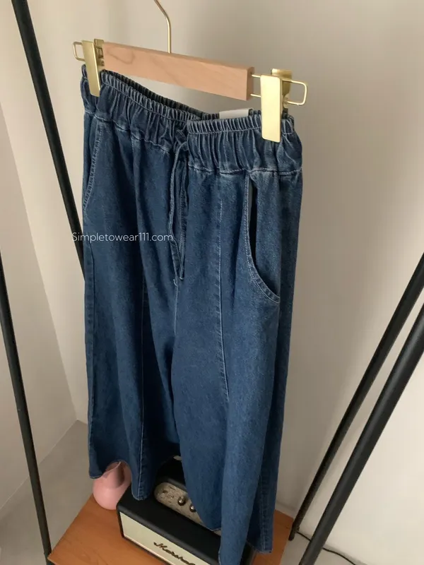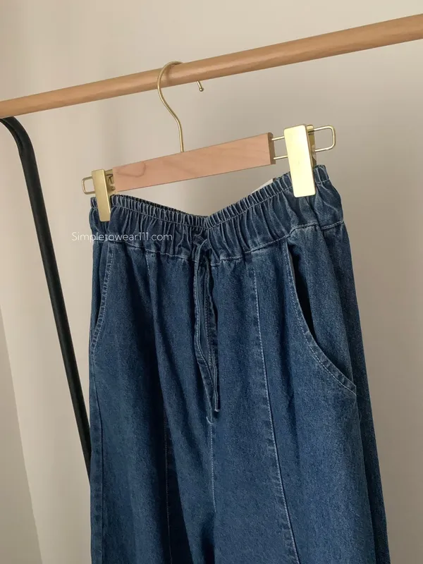 韓 舒服鬆緊腰抽繩單寧牛仔寬褲
