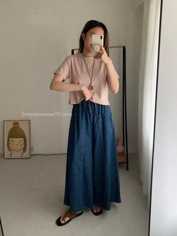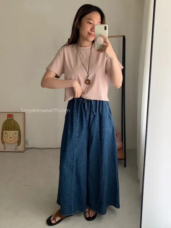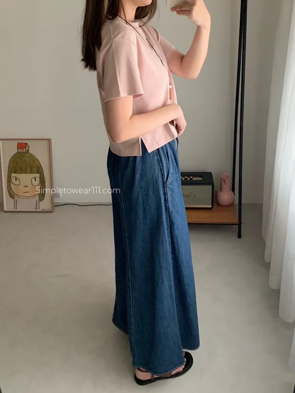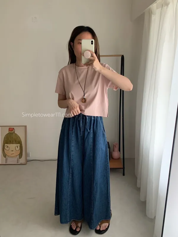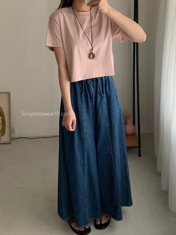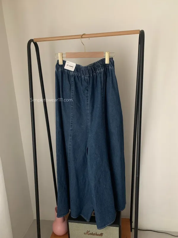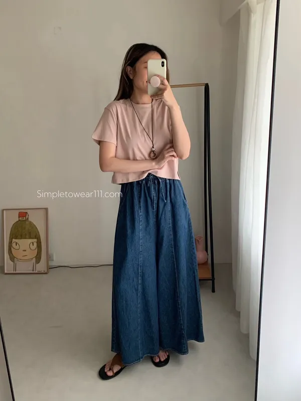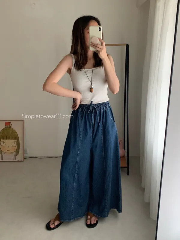 韓 舒服鬆緊腰抽繩單寧牛仔寬褲