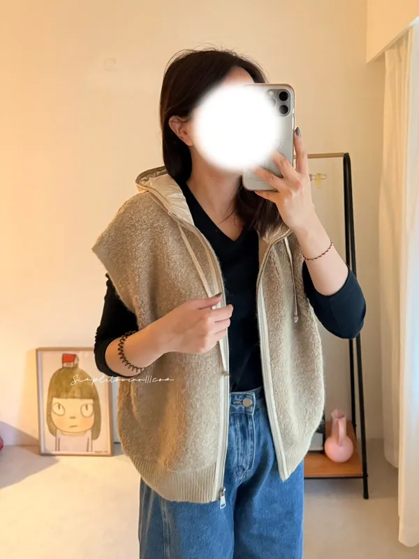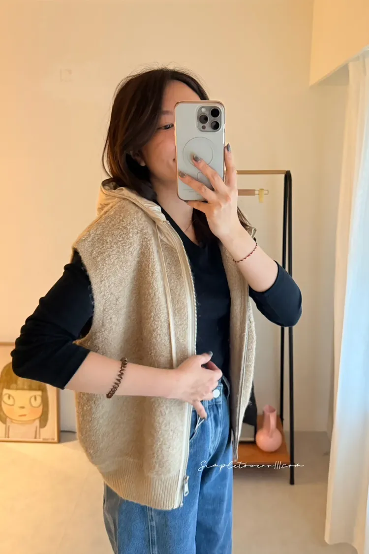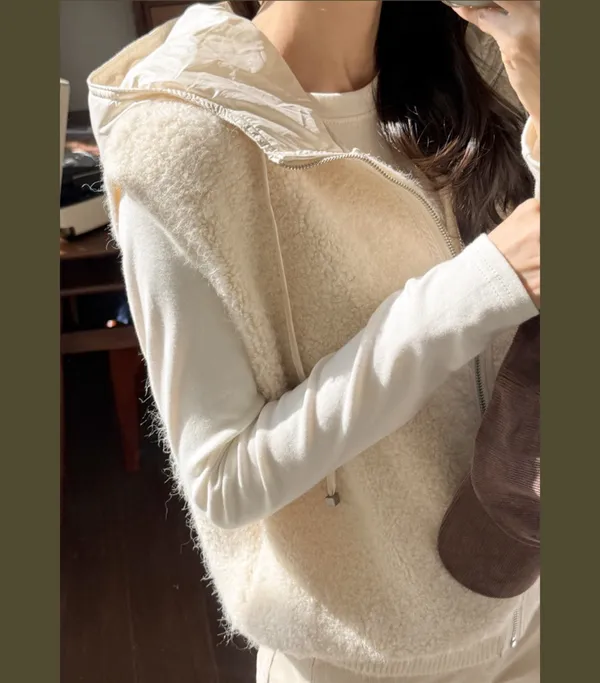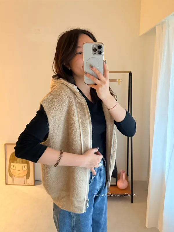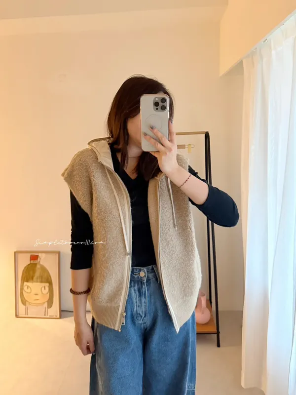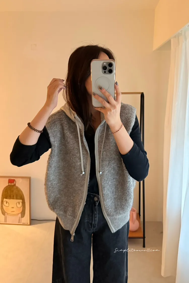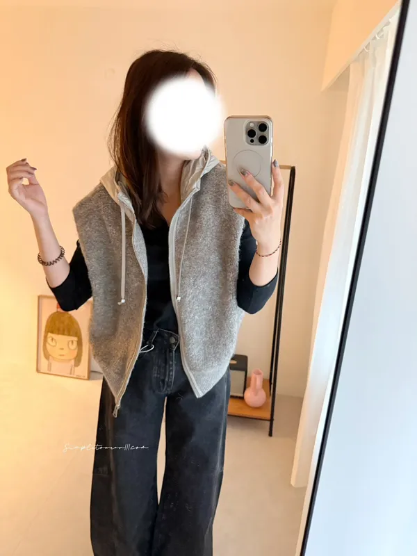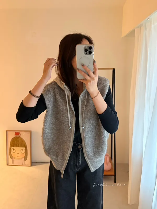 【雙11特賣】圓圓圈圈拼接帽背心 (杏/卡/灰/黑)