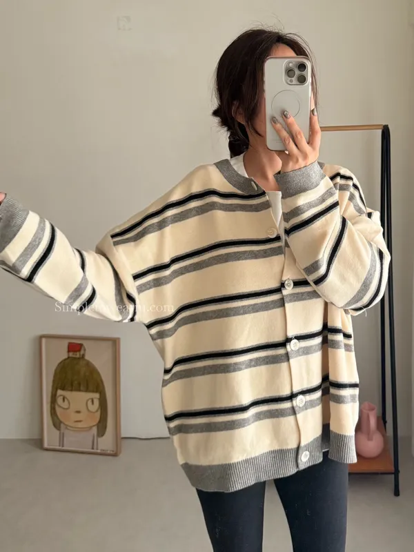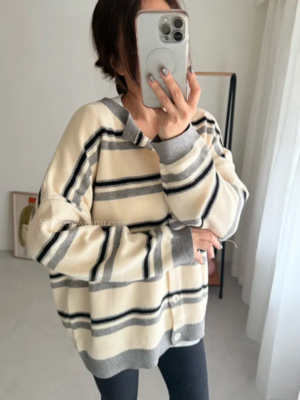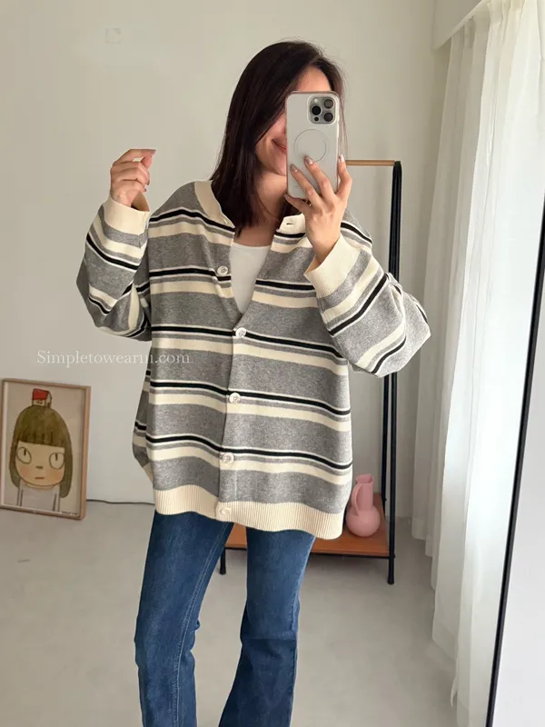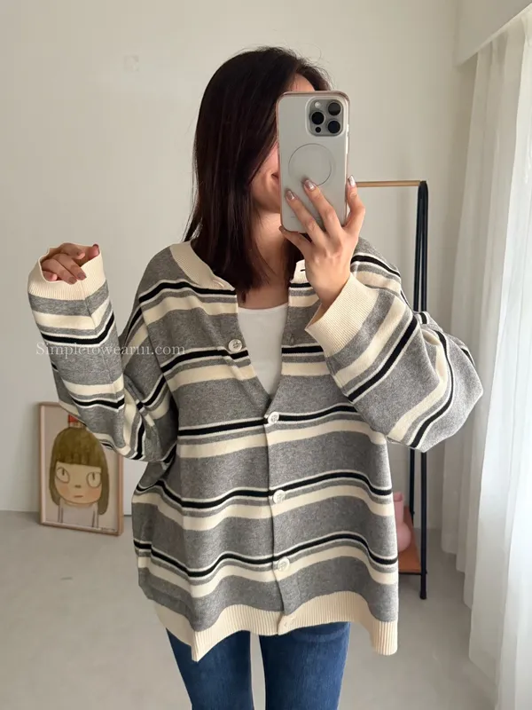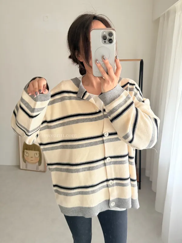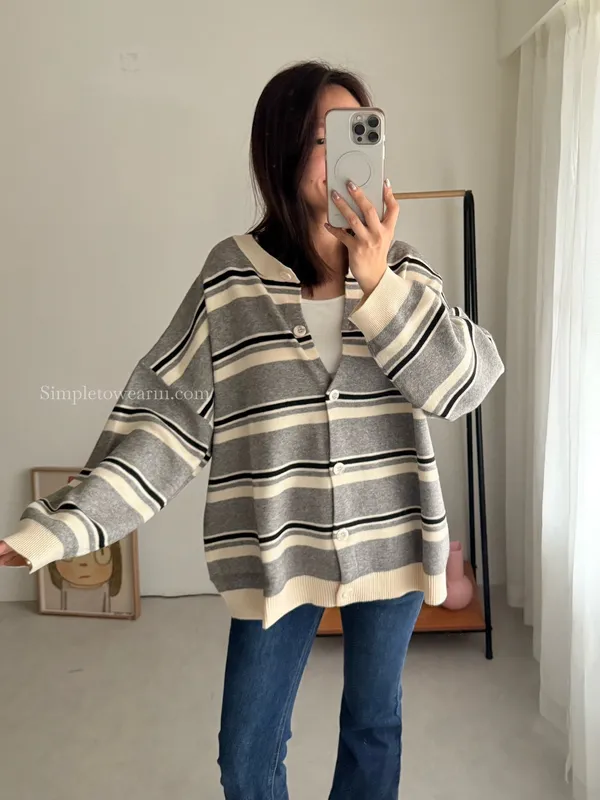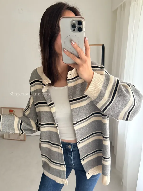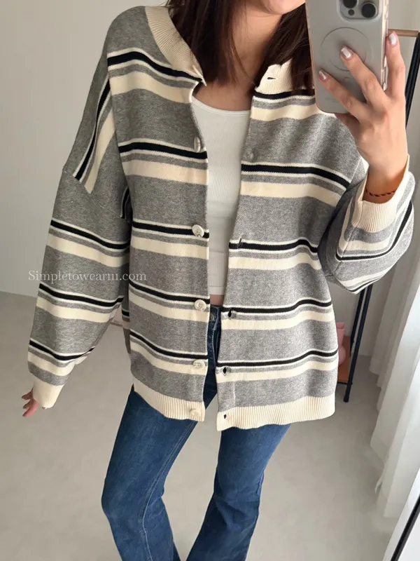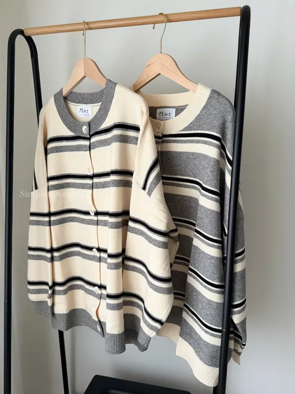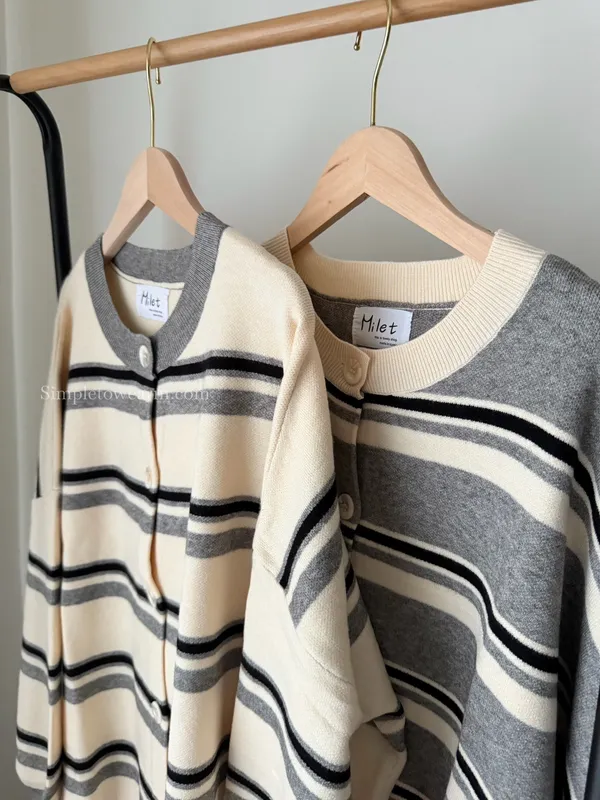 韓 條紋跳色針織外套 (灰/杏)