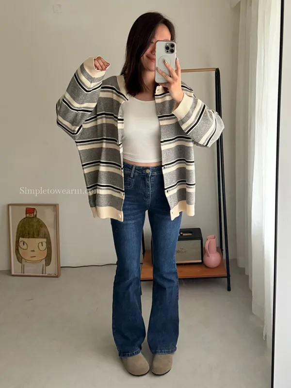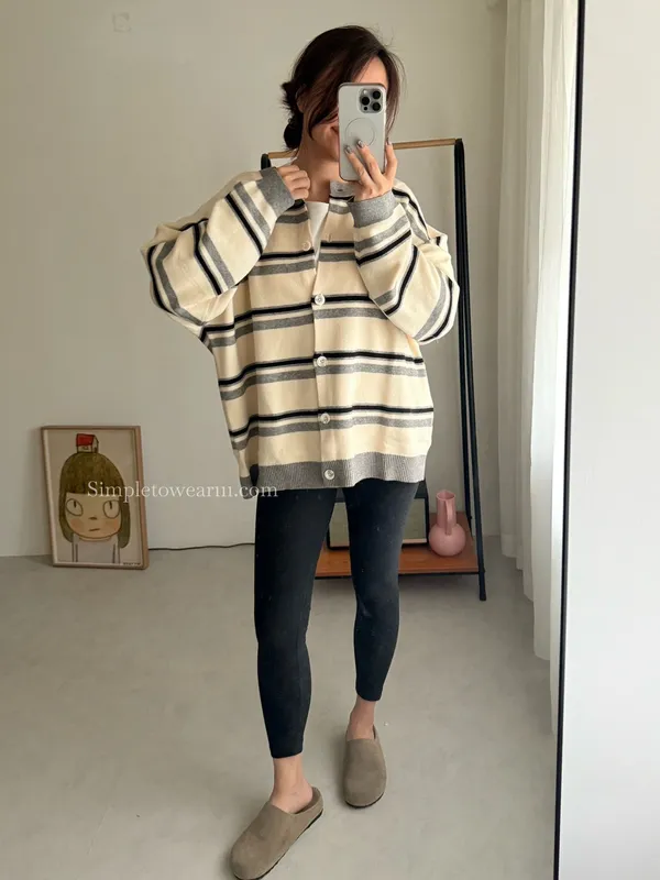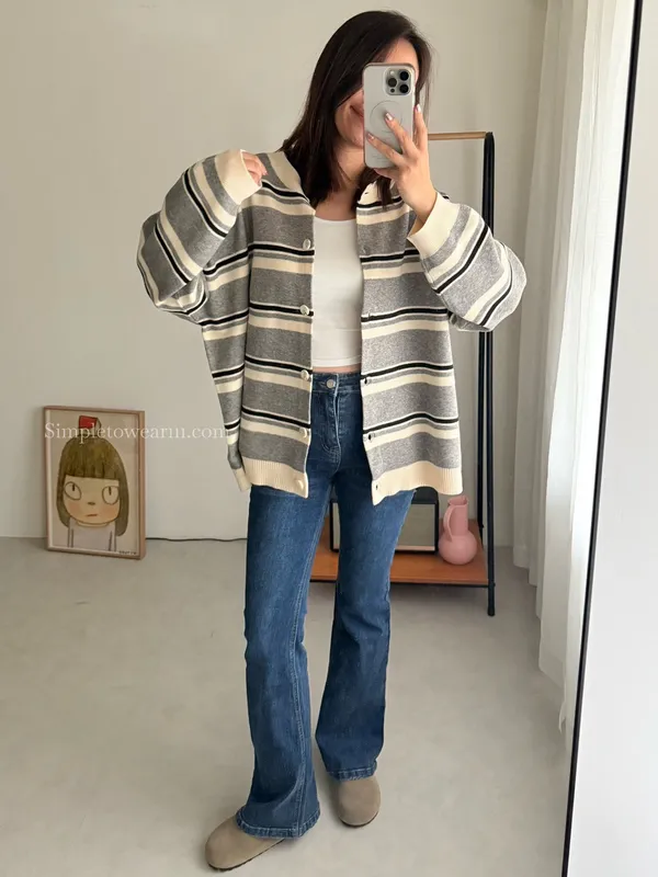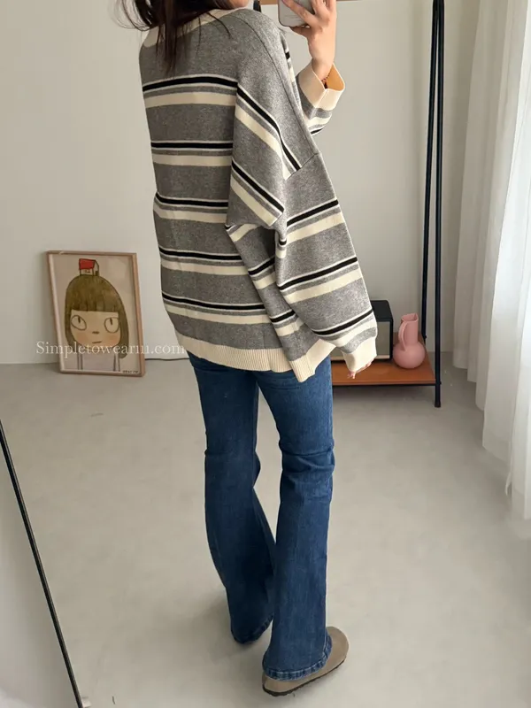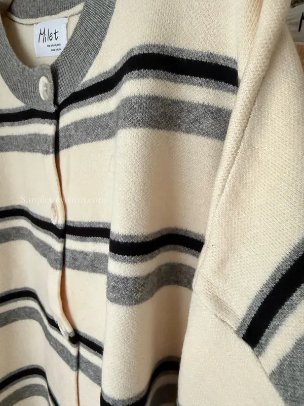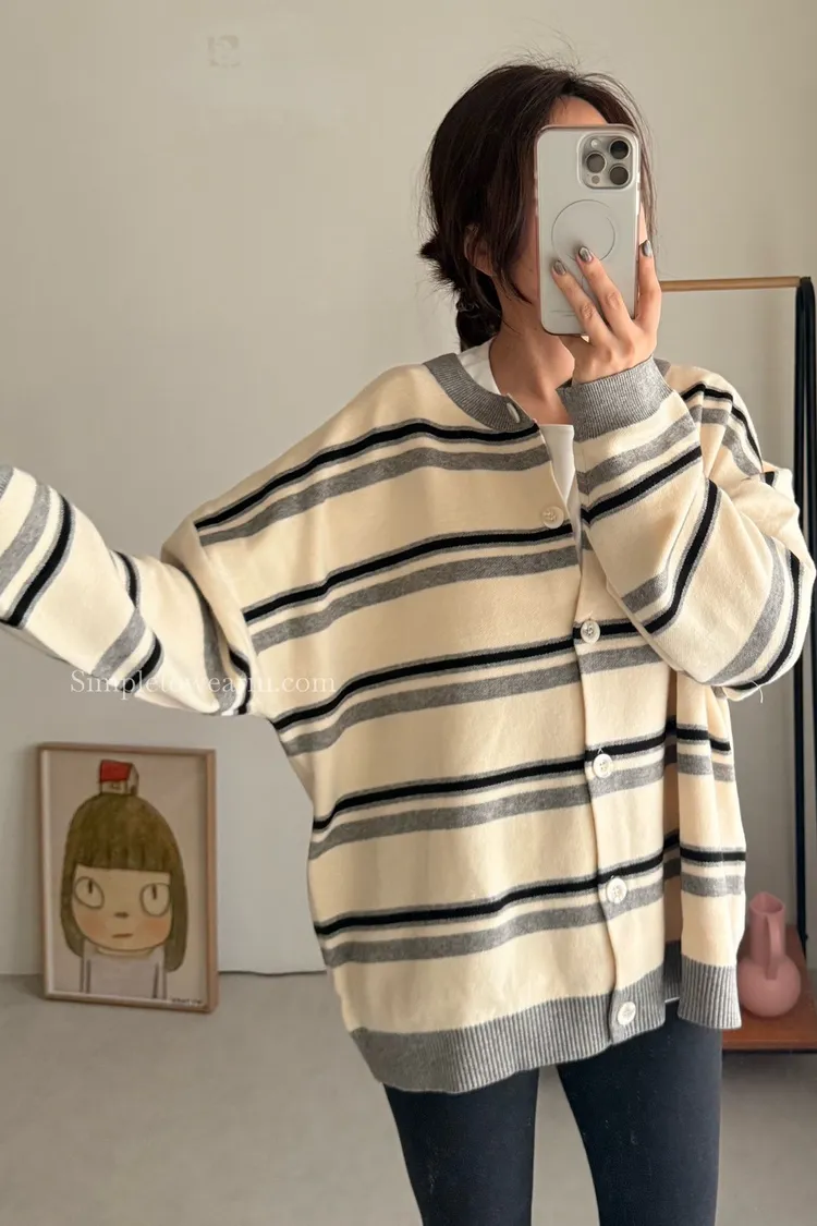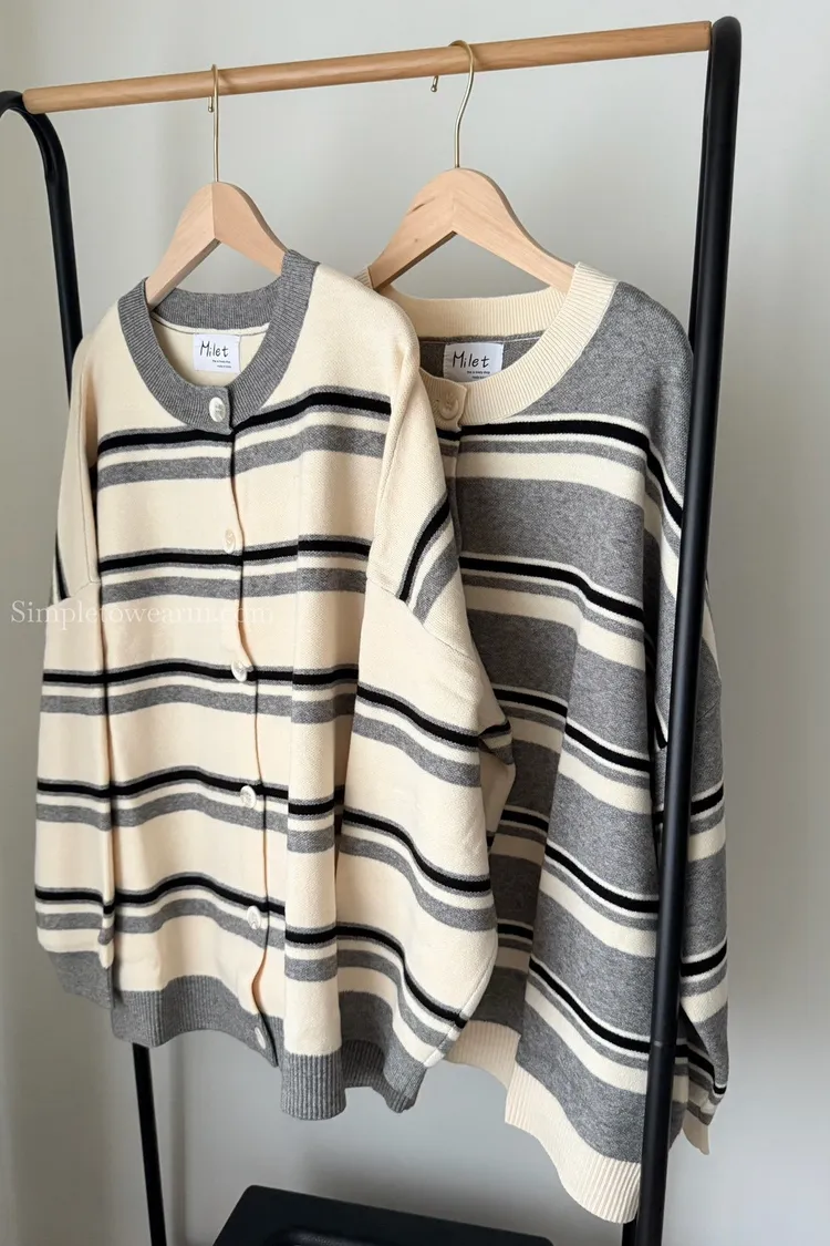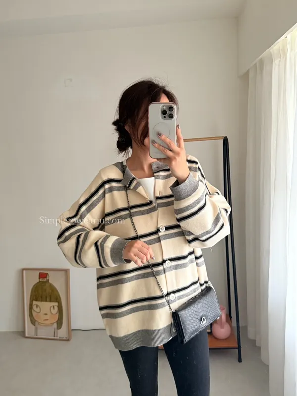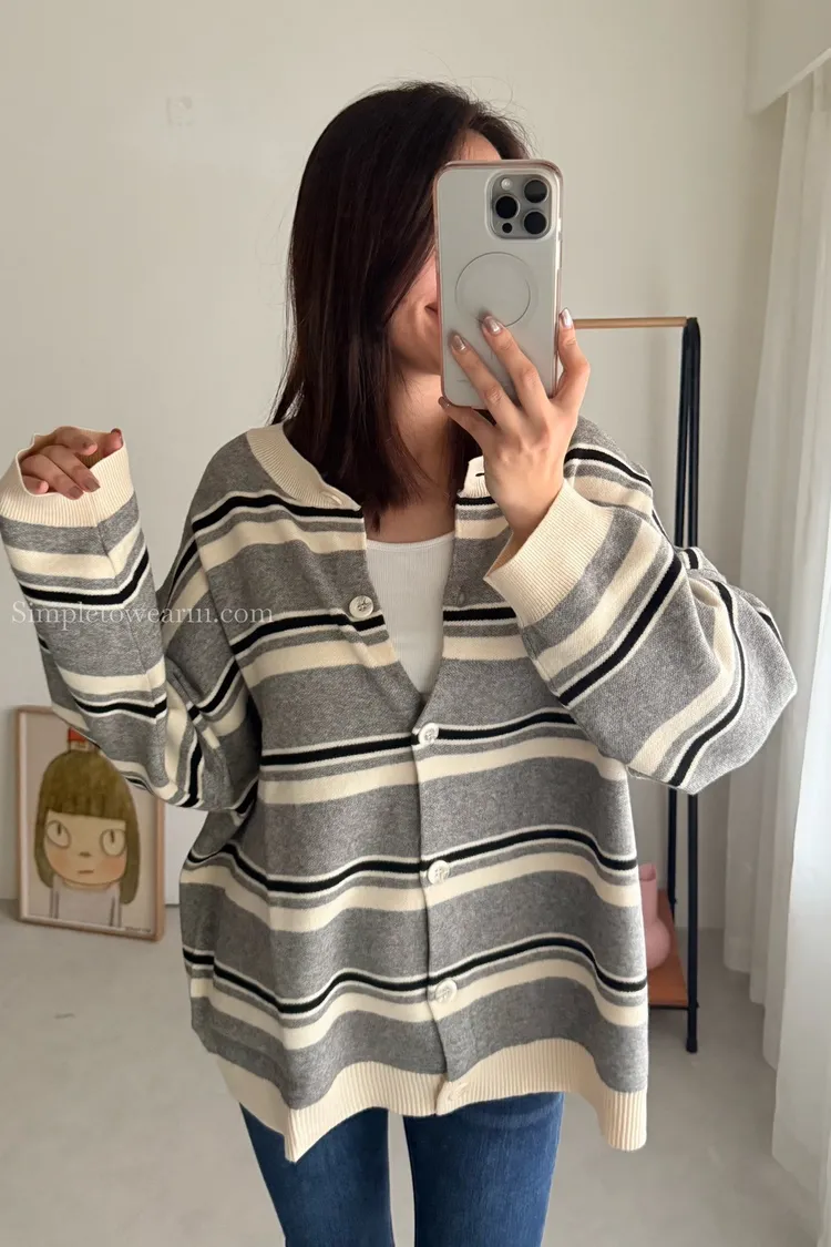 韓 條紋跳色針織外套 (灰/杏)
