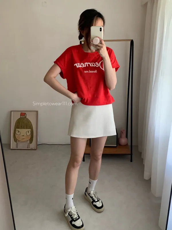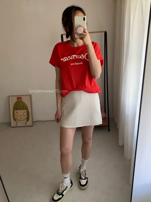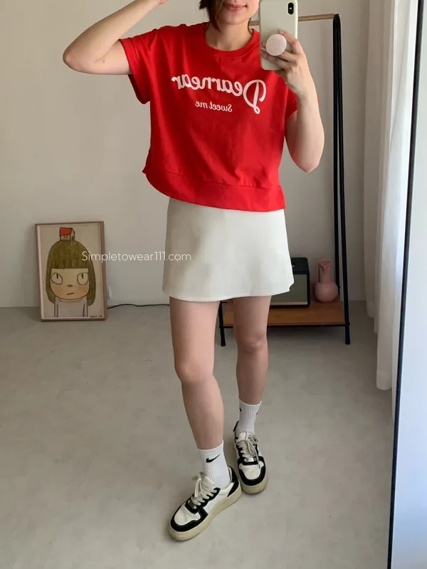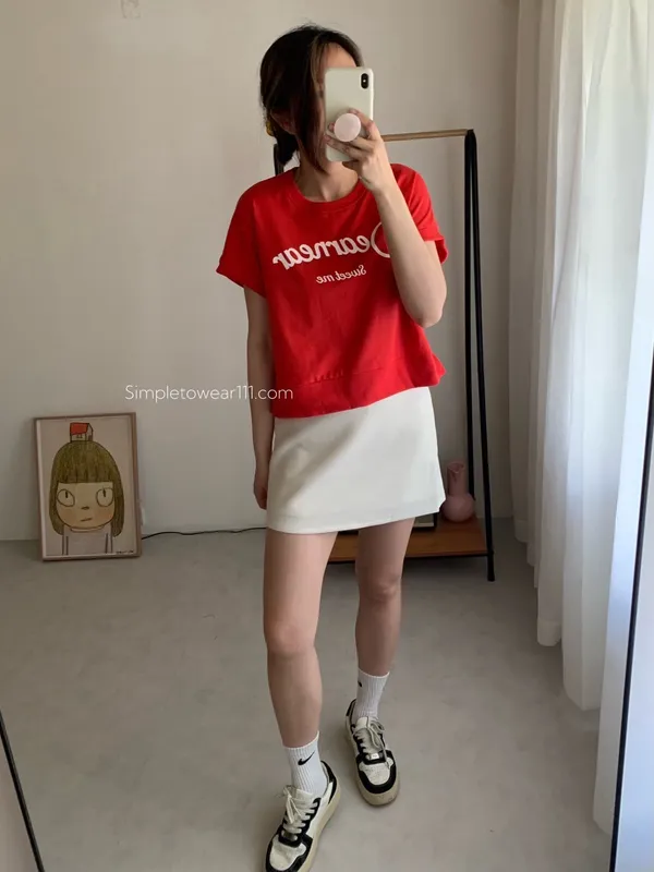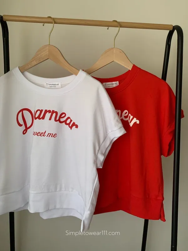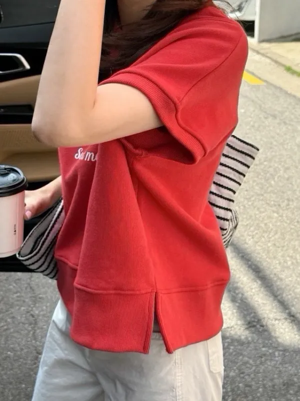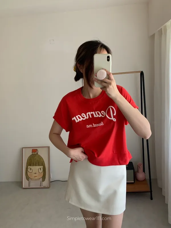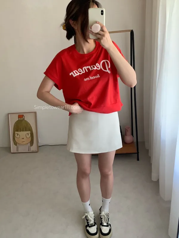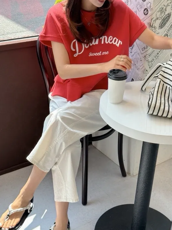 韓 字母撞色印花側開叉棉Tee (白/紅)