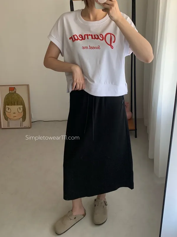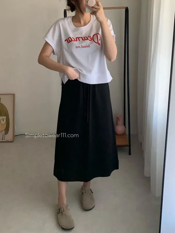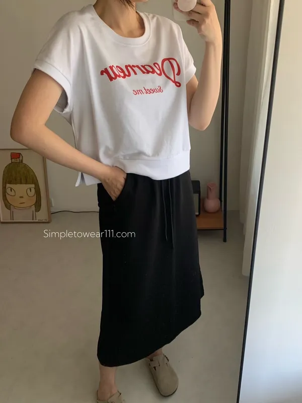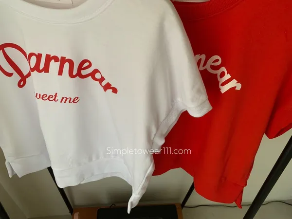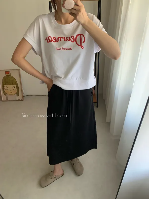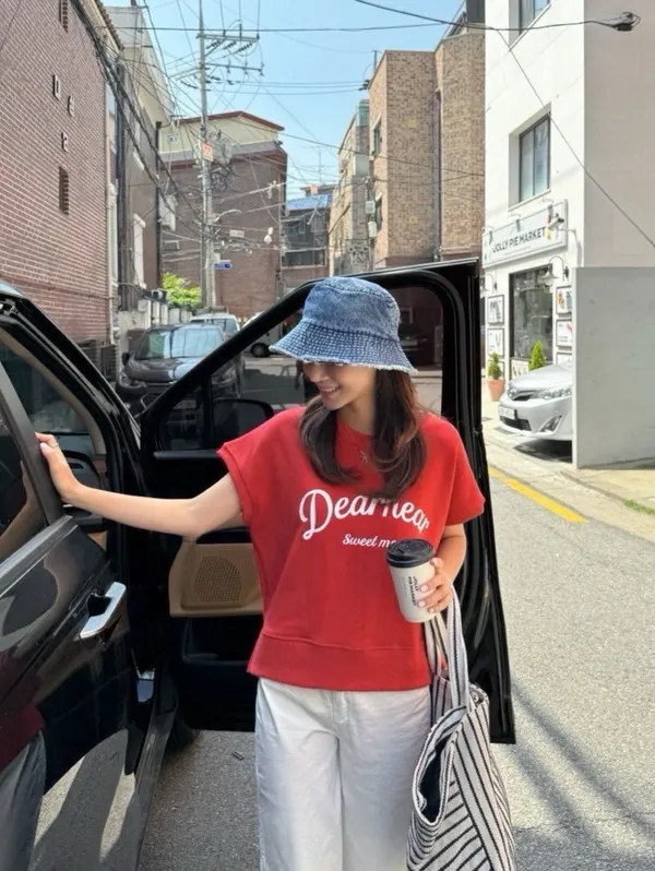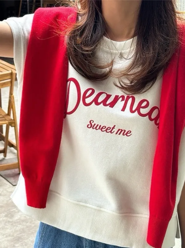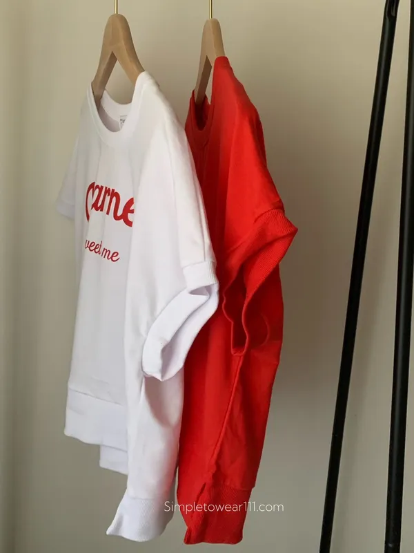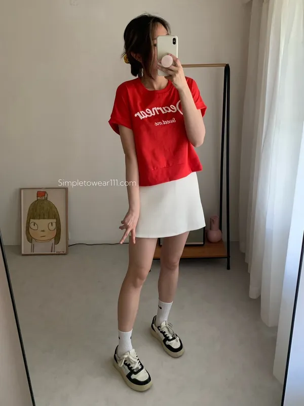韓 字母撞色印花側開叉棉Tee (白/紅)