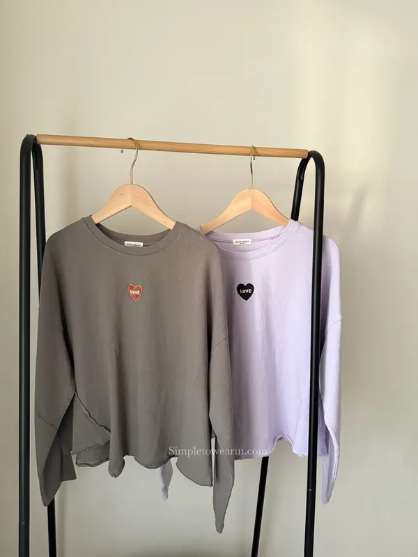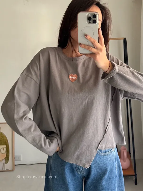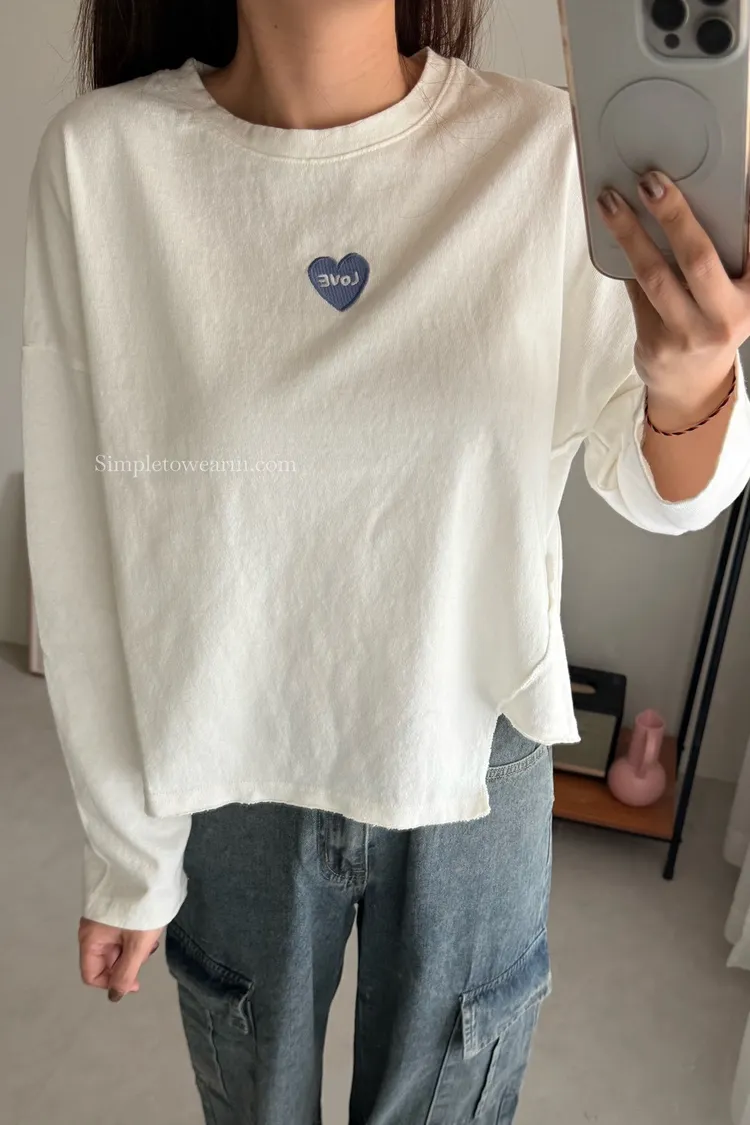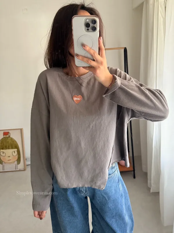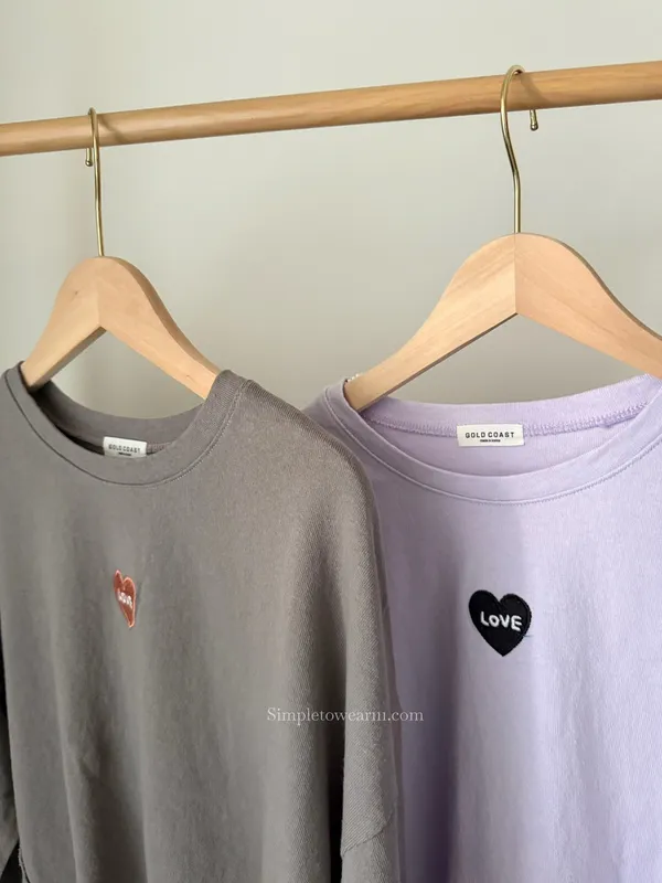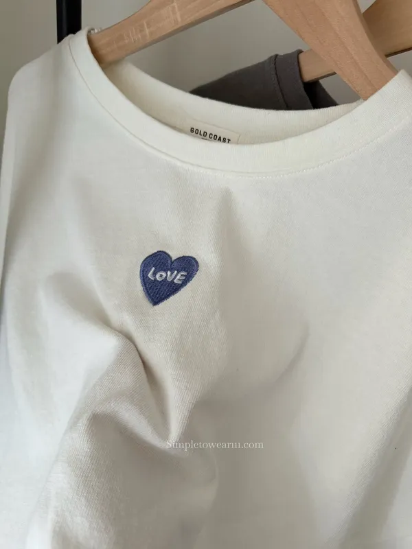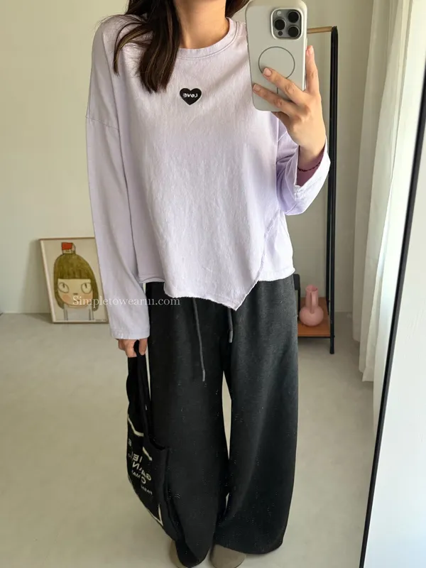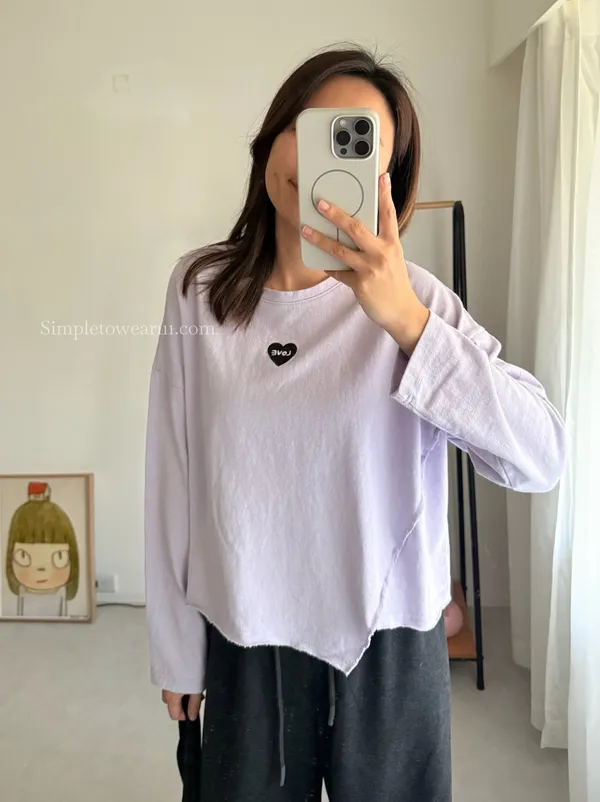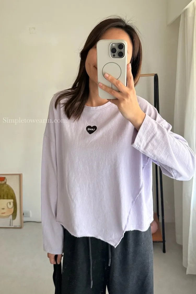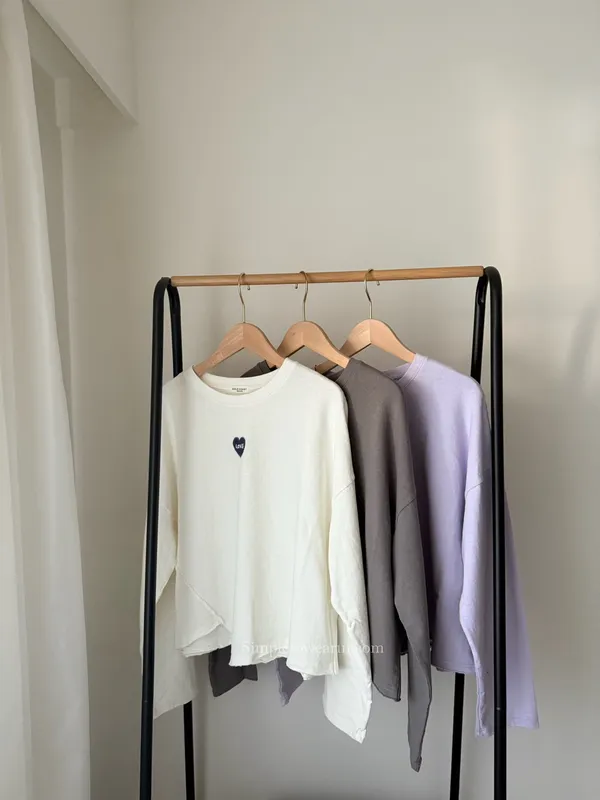 韓 斜剪接刺繡小愛心TEE (白/深灰/紫)
