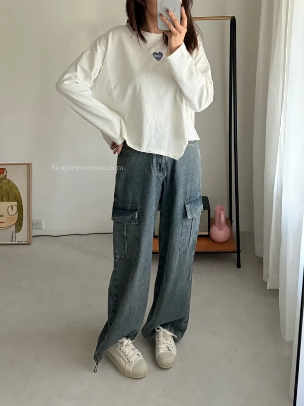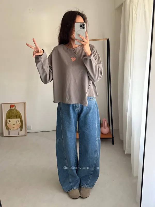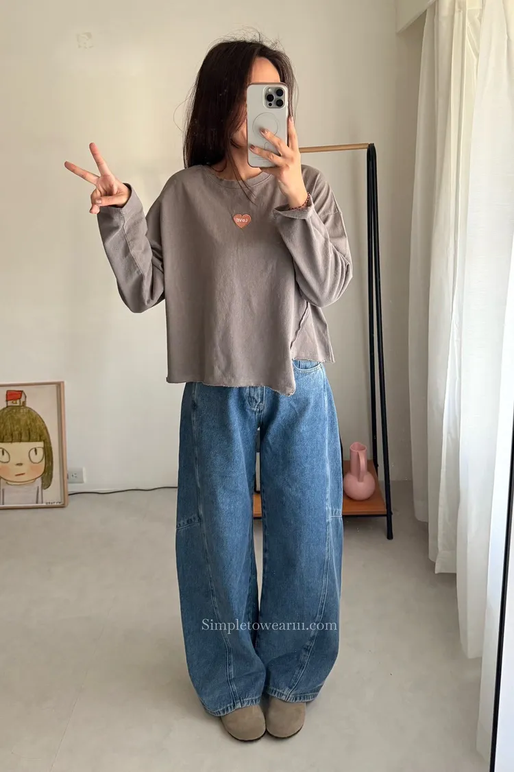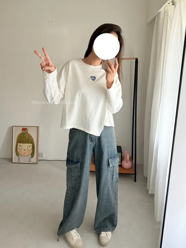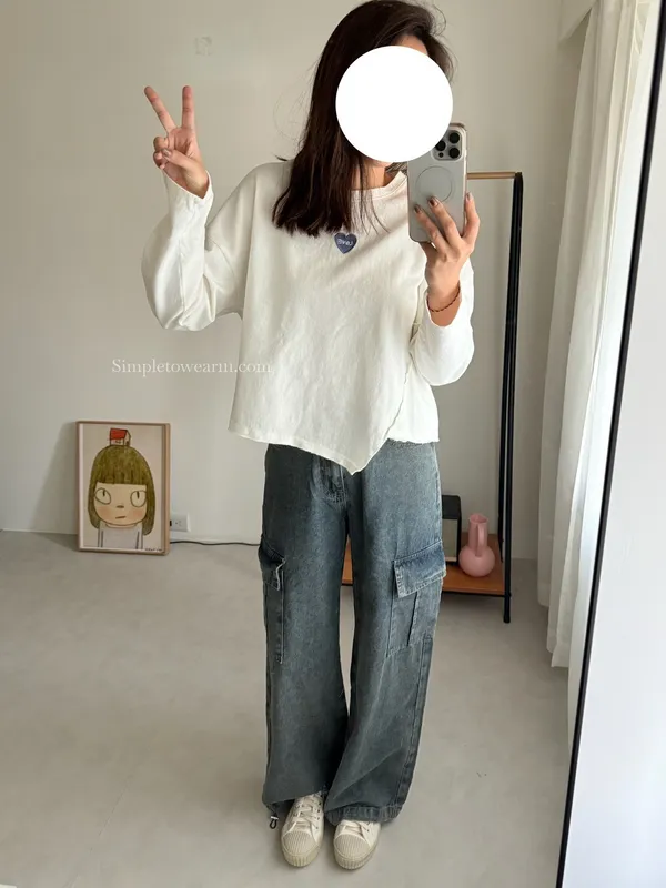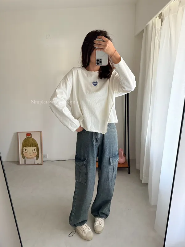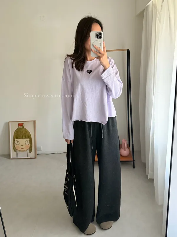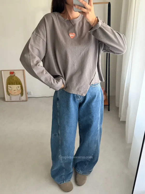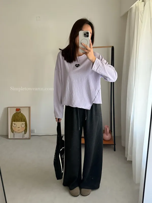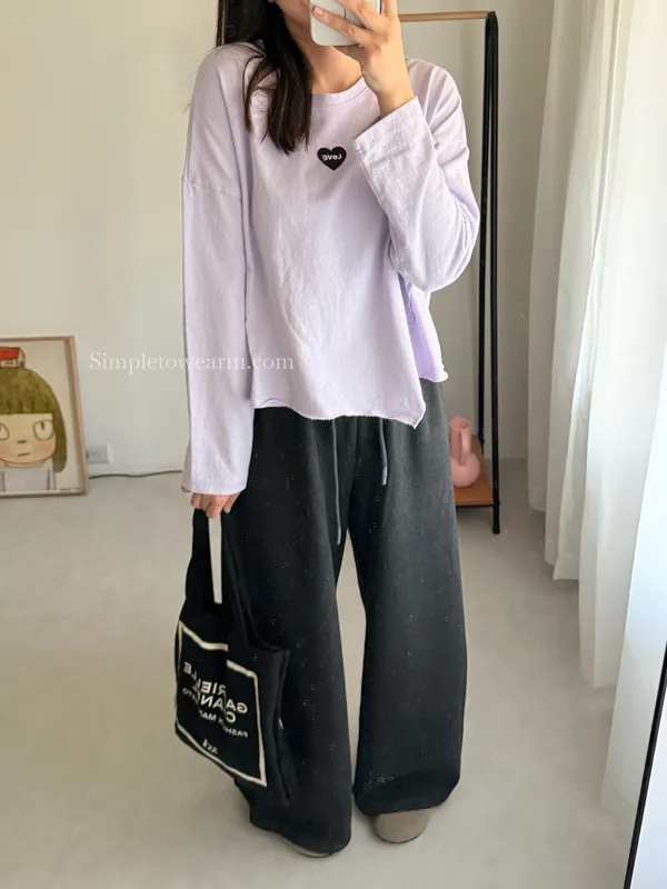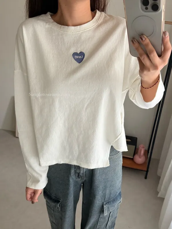韓 斜剪接刺繡小愛心TEE (白/深灰/紫)