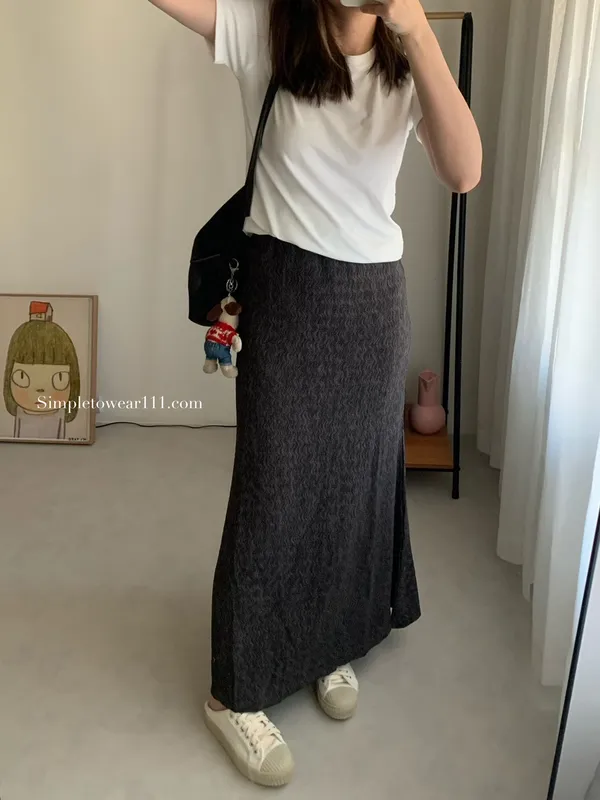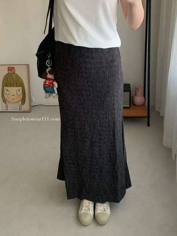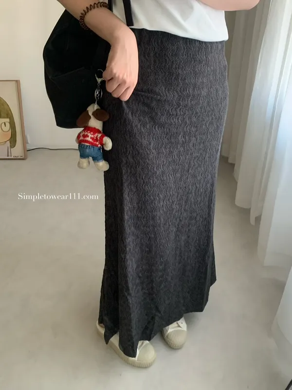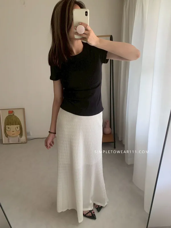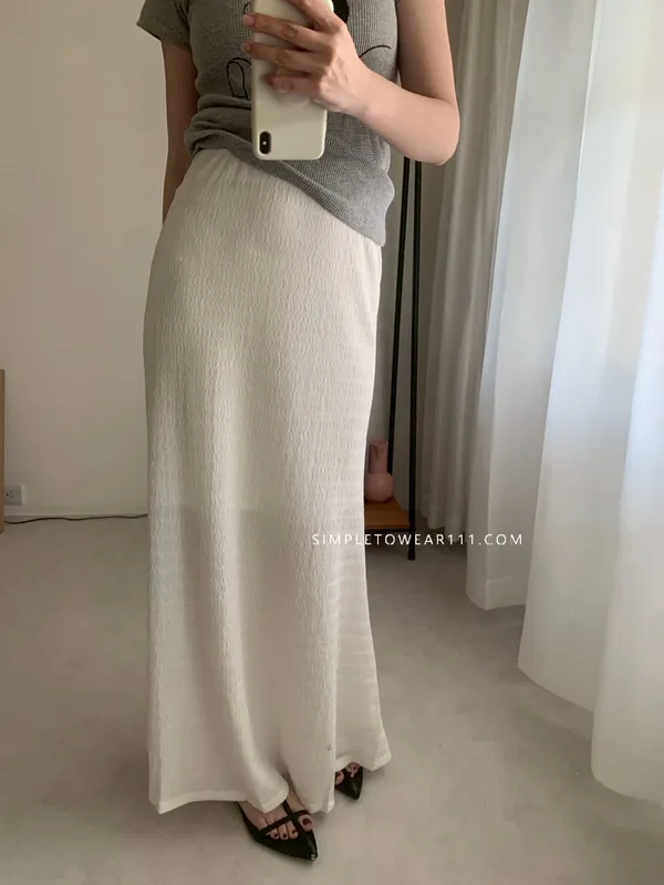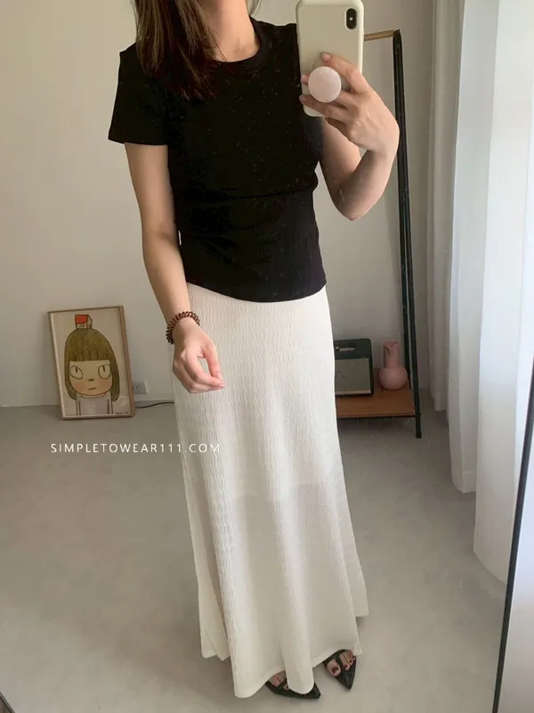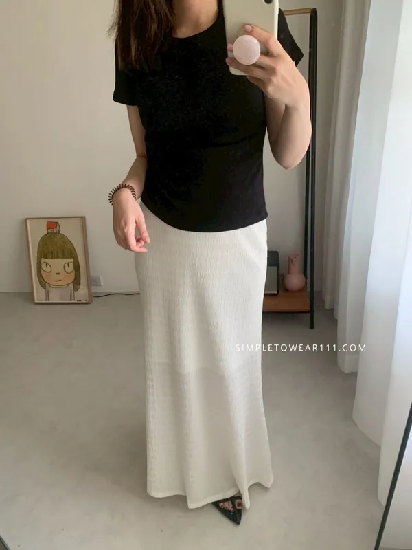 超顯瘦 鬆緊腰波浪紋魚尾裙 (米白/黑)