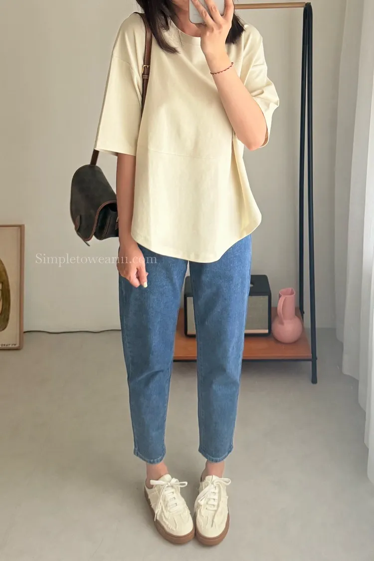 韓 正涼感下弧形五分袖上衣 (白/杏/黑)