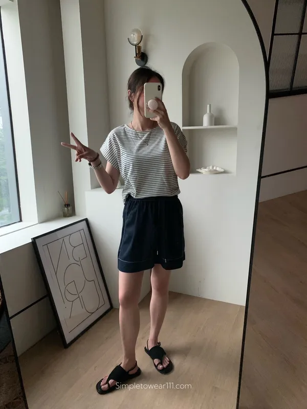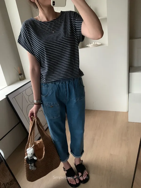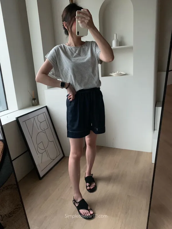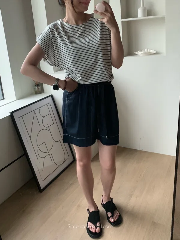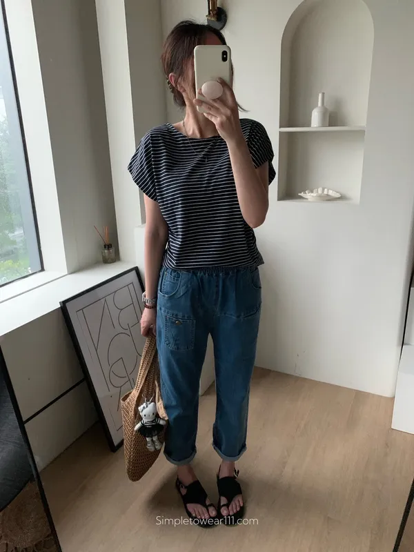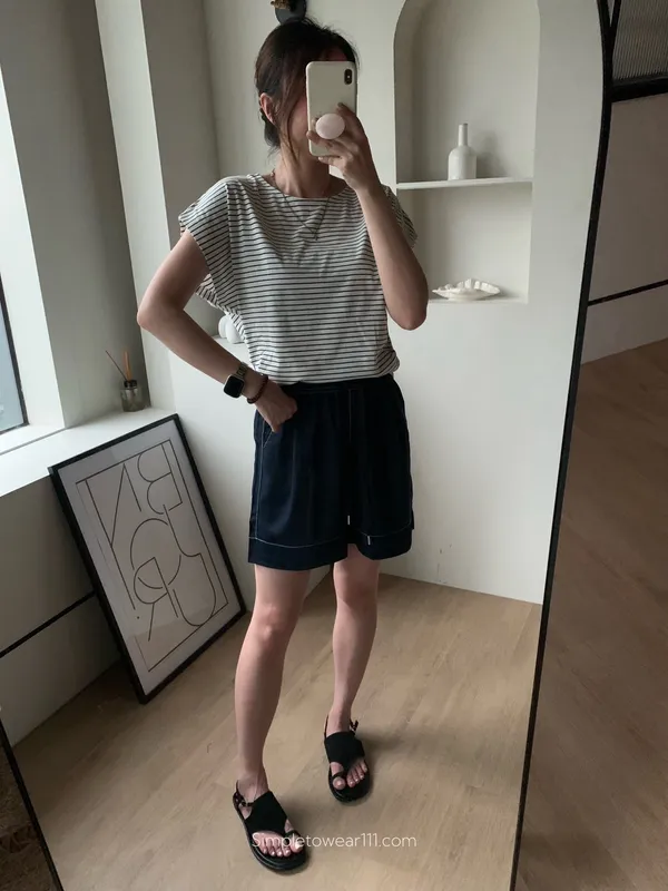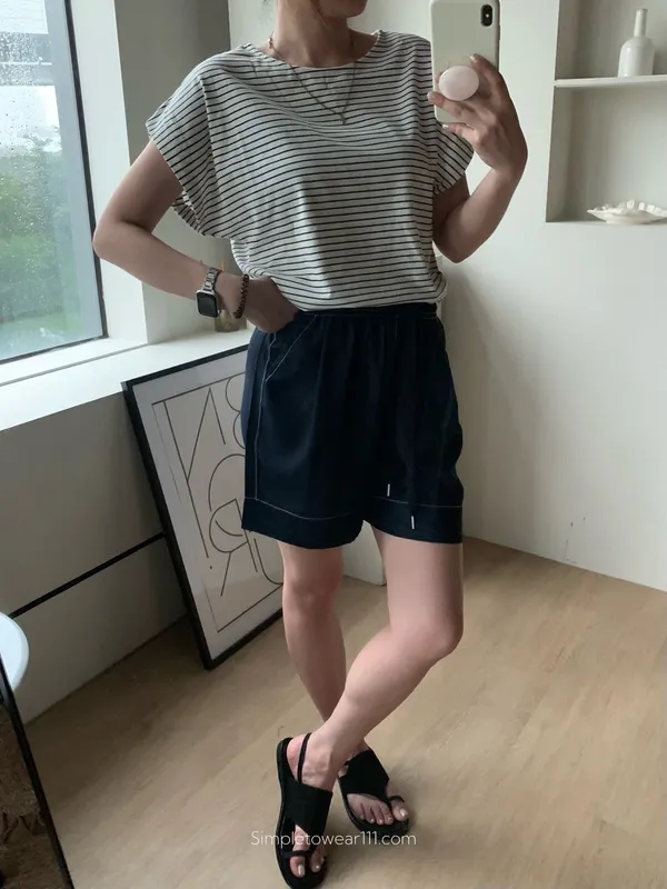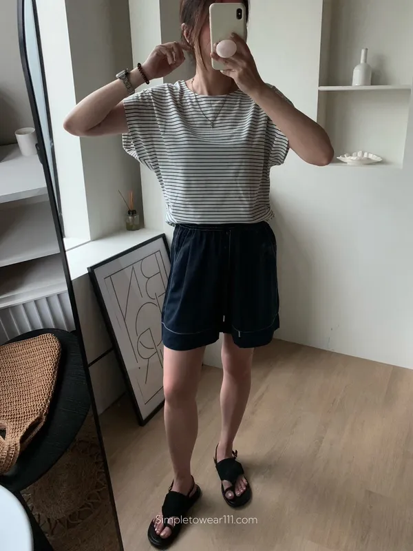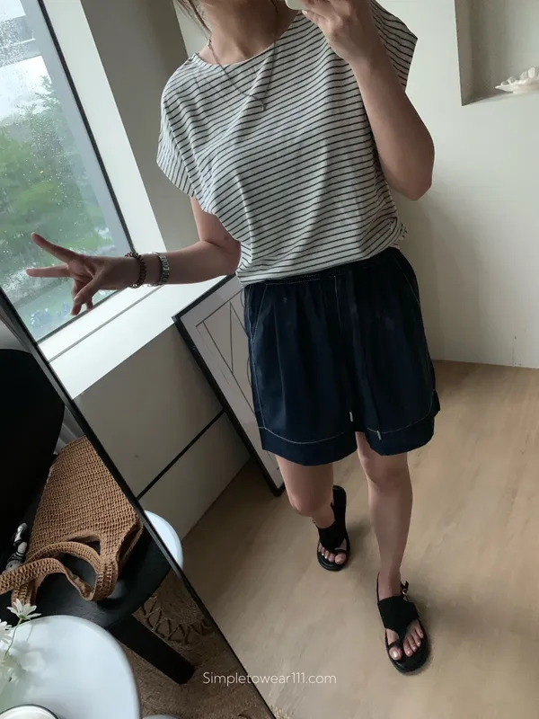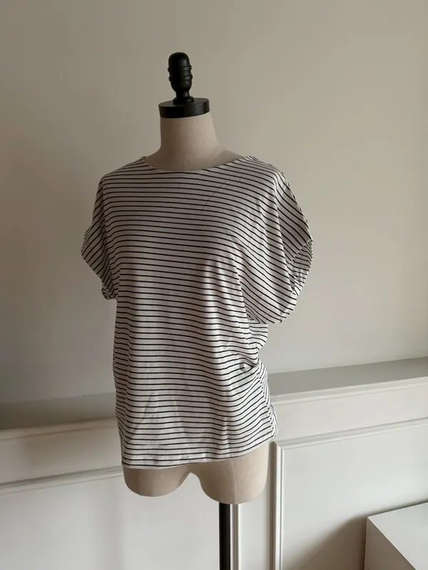 韓 側邊抓皺條紋短TEE (白條/藍條)