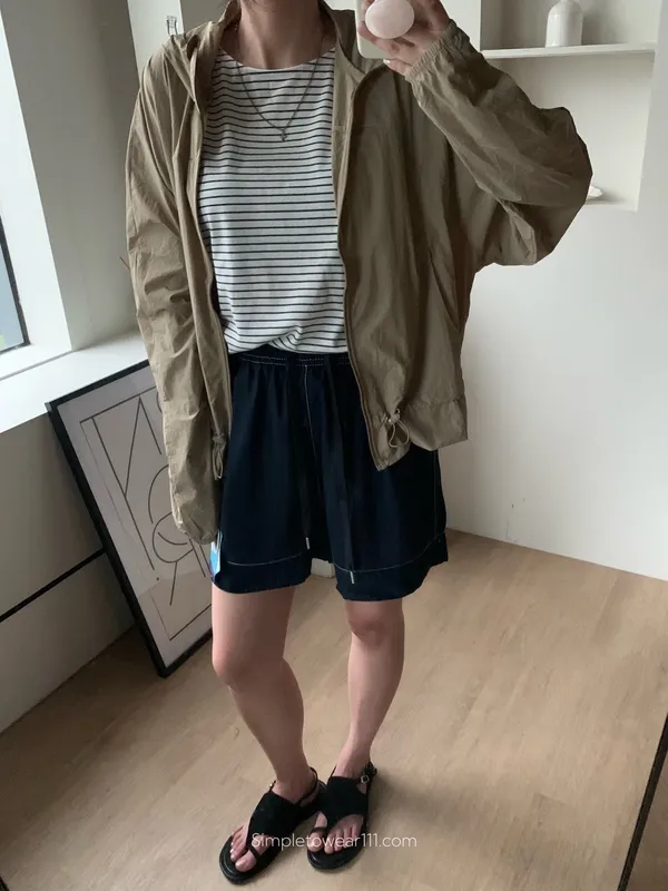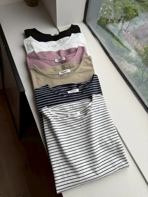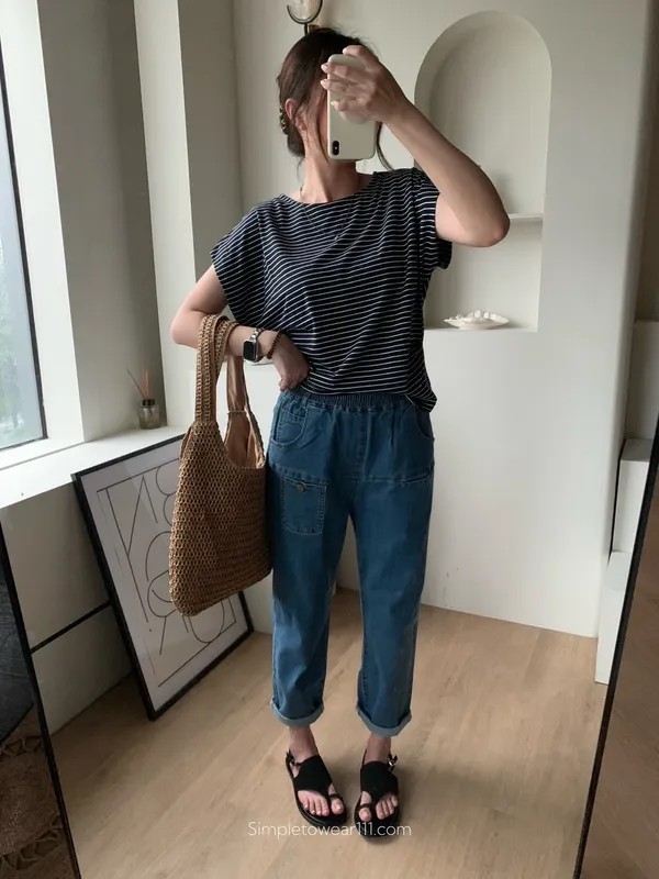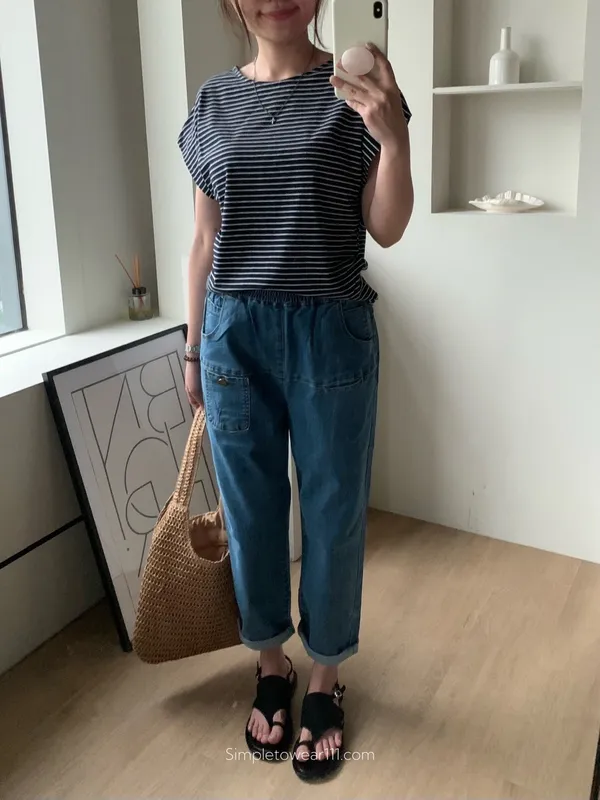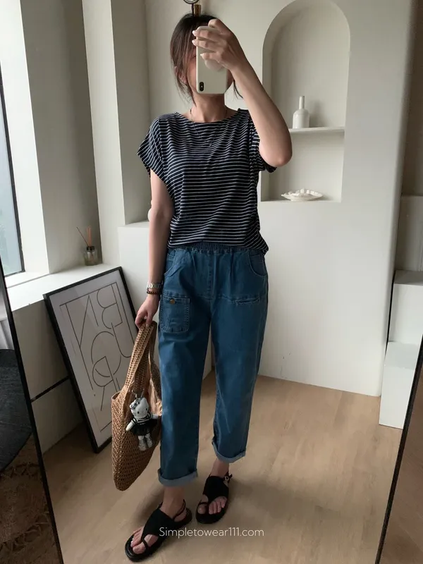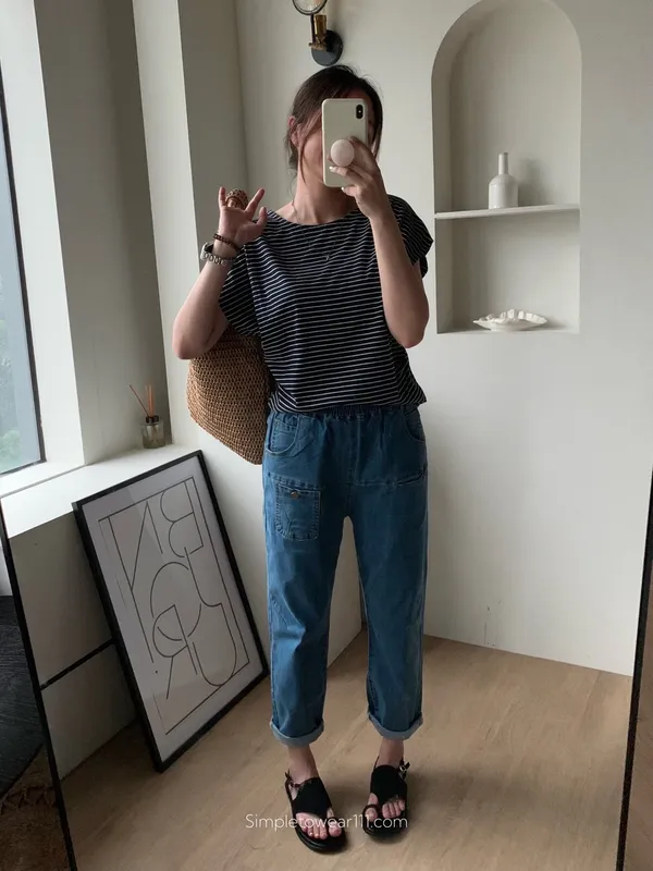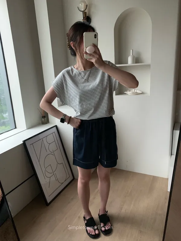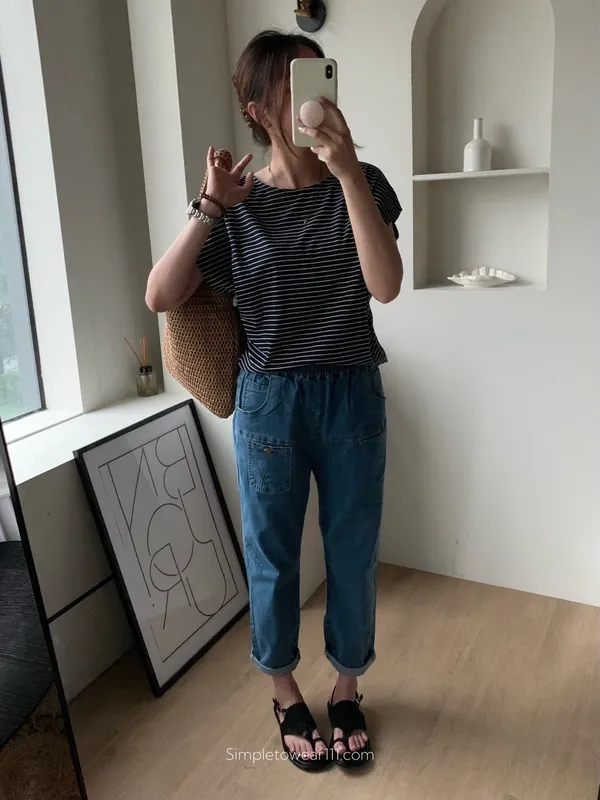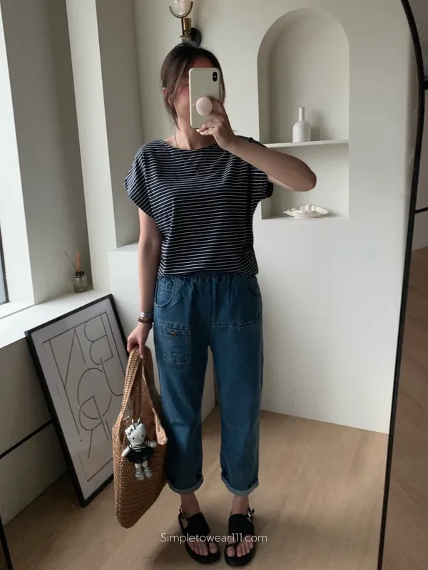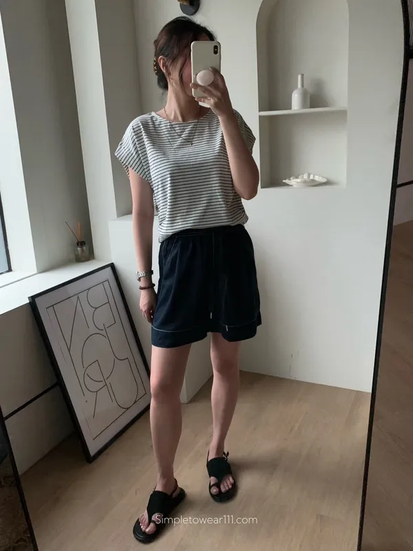 韓 側邊抓皺條紋短TEE (白條/藍條)
