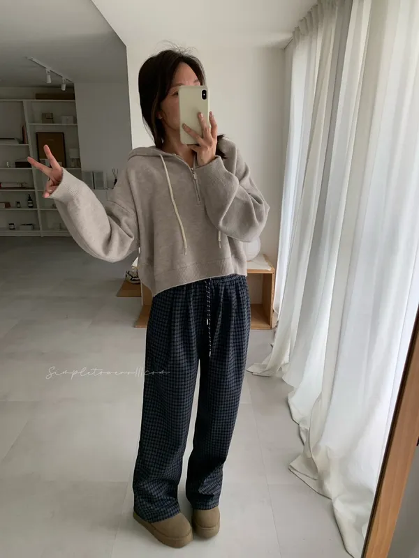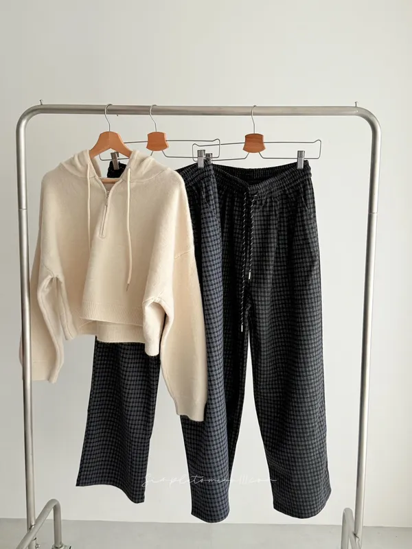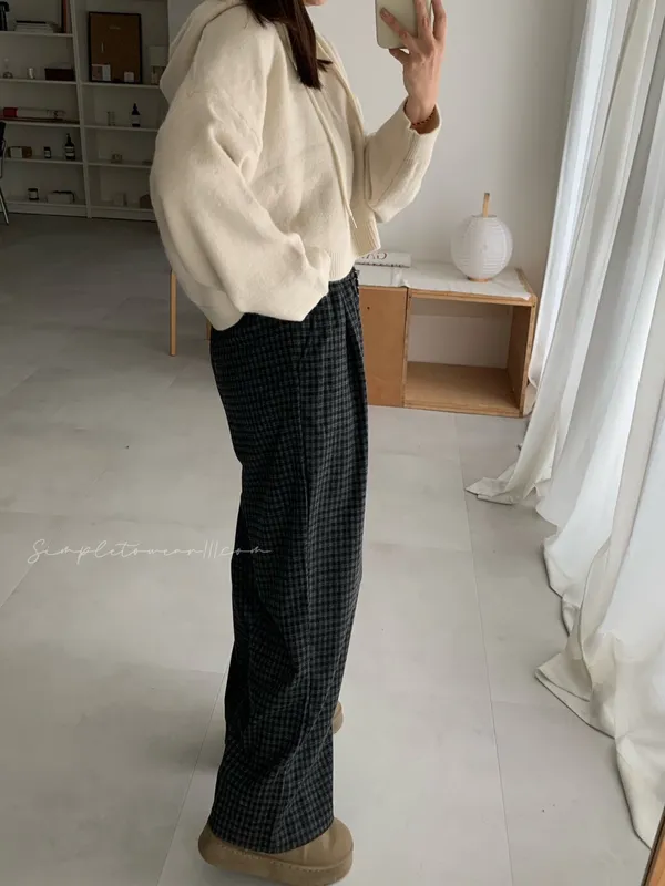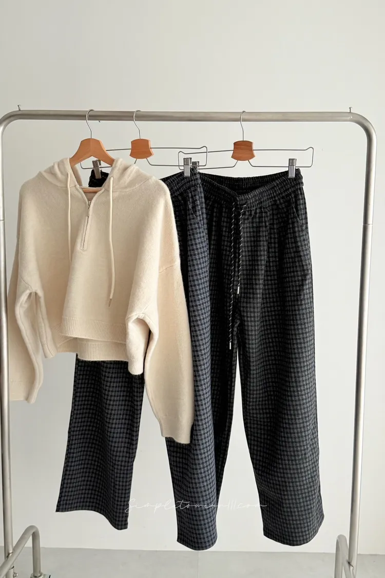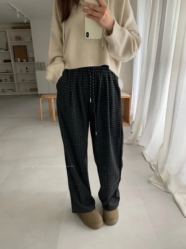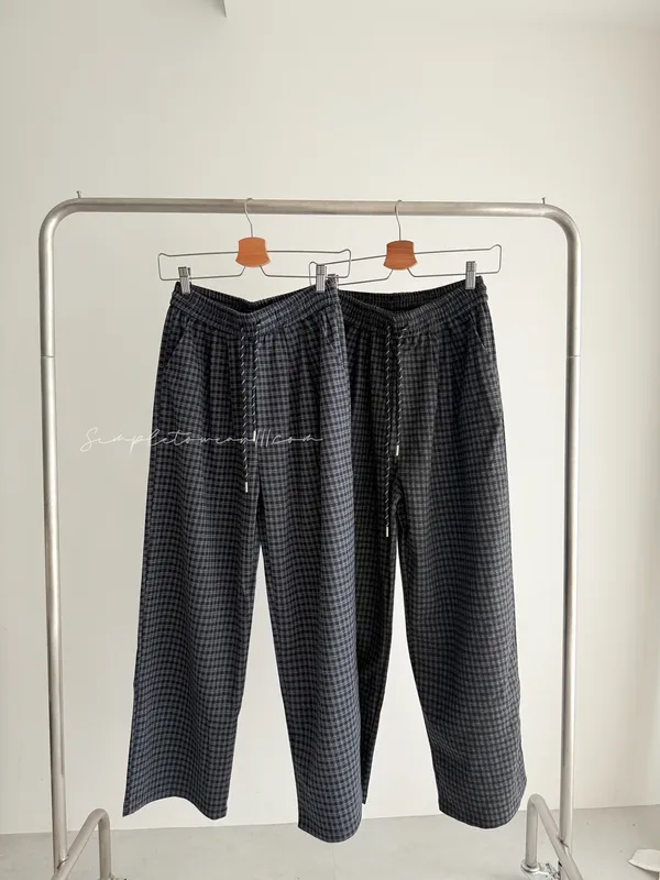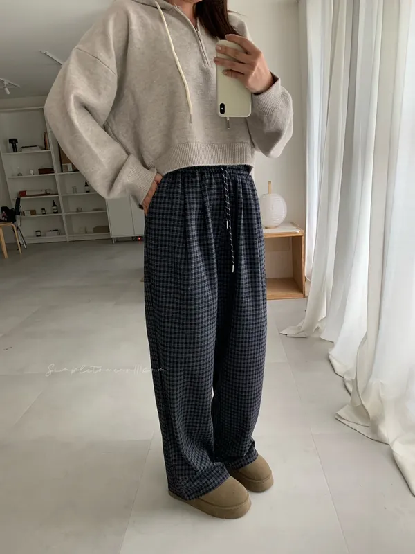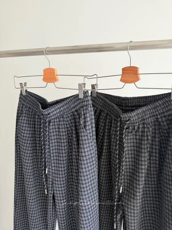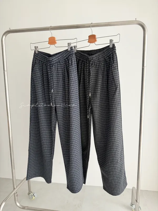 N10 磨毛抽繩格紋寬褲 (藍/黑)