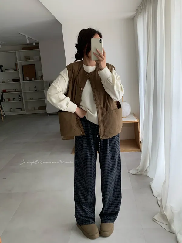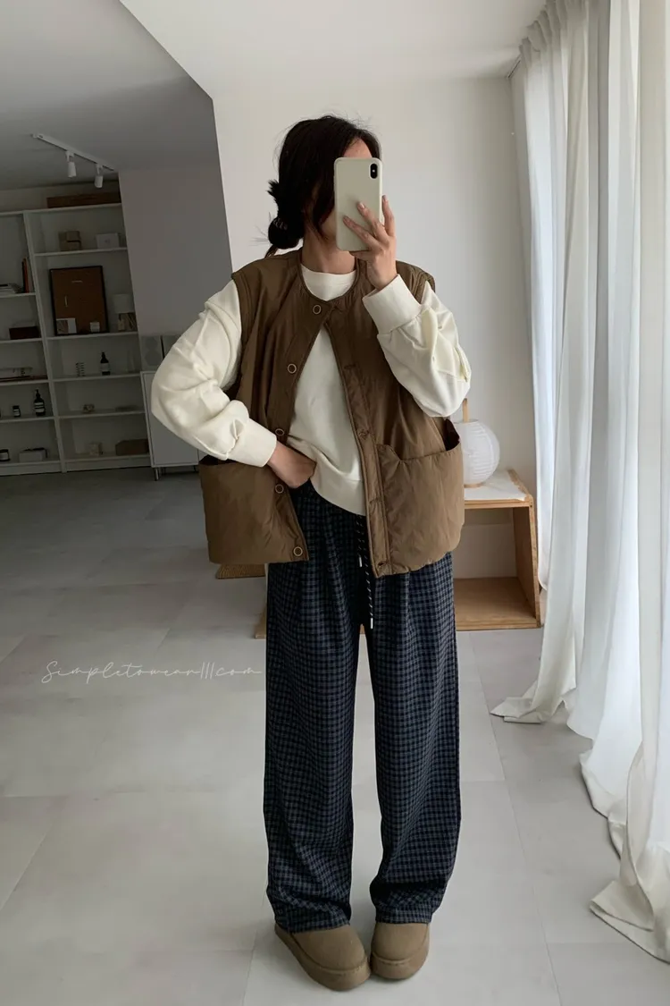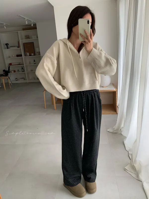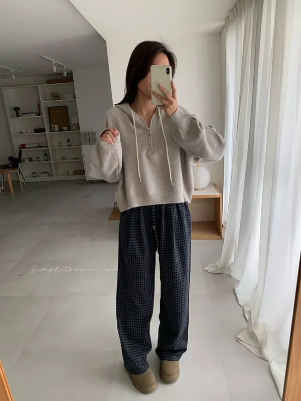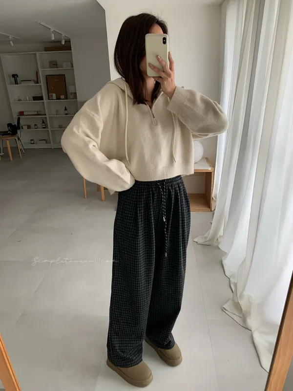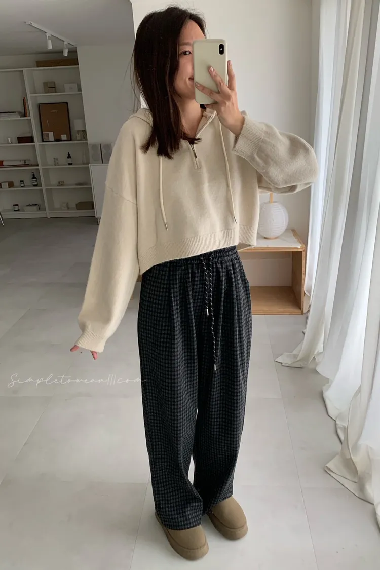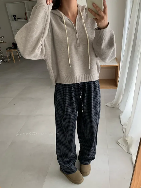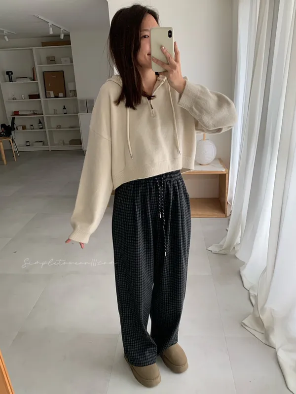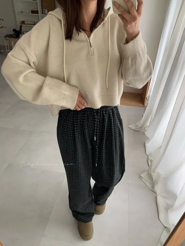 N10 磨毛抽繩格紋寬褲 (藍/黑)