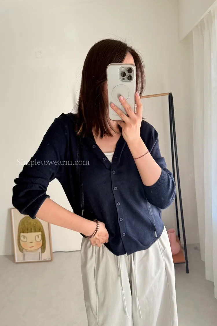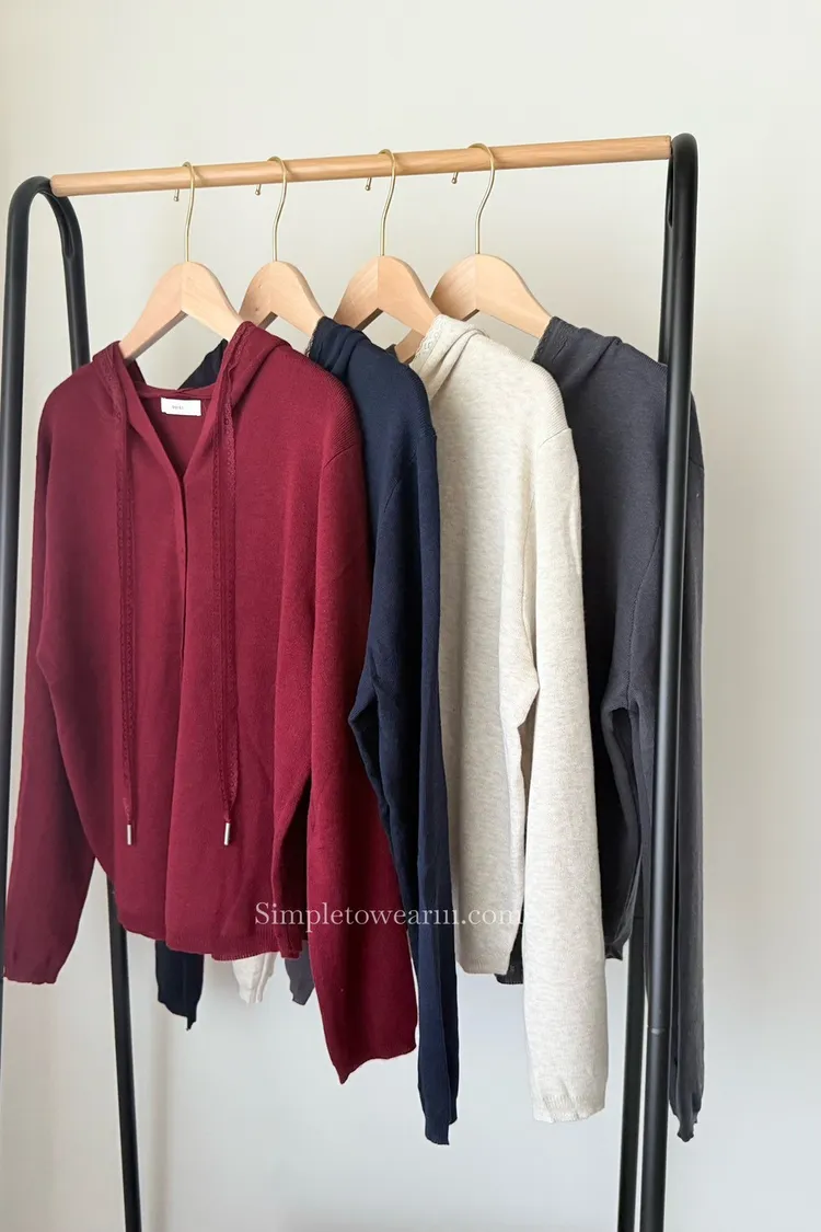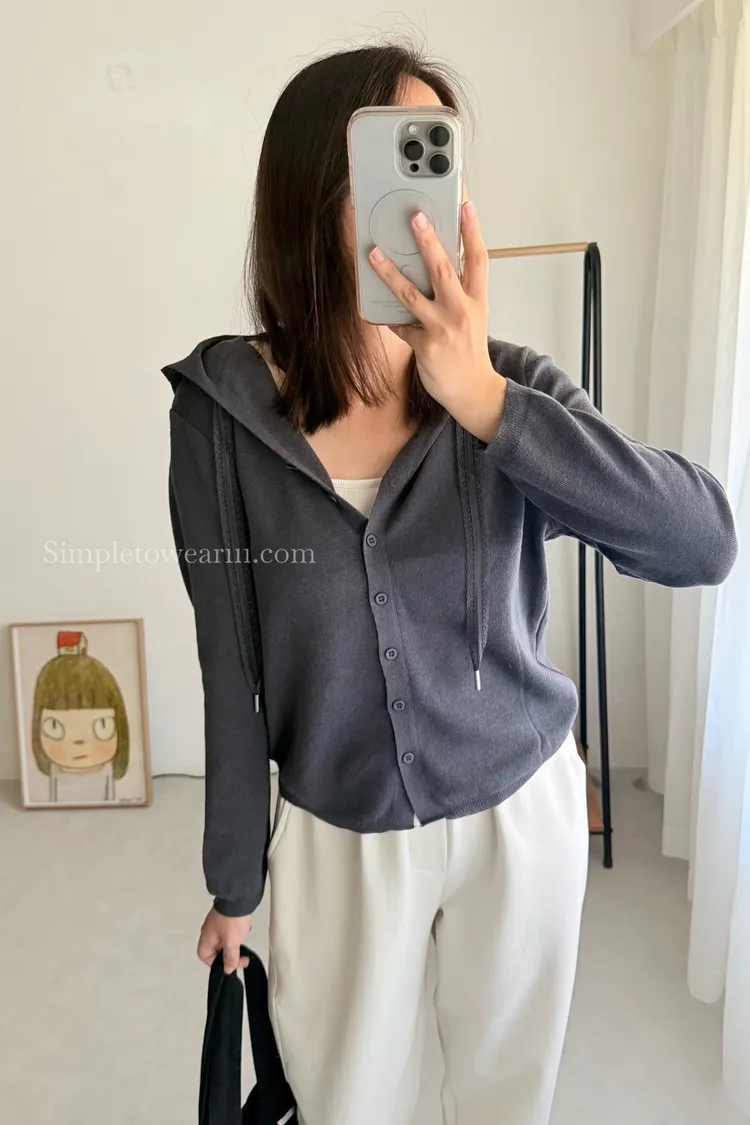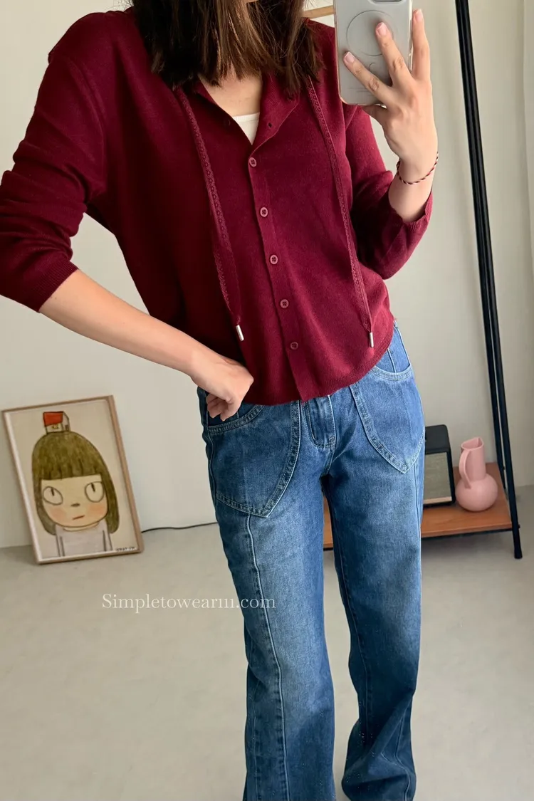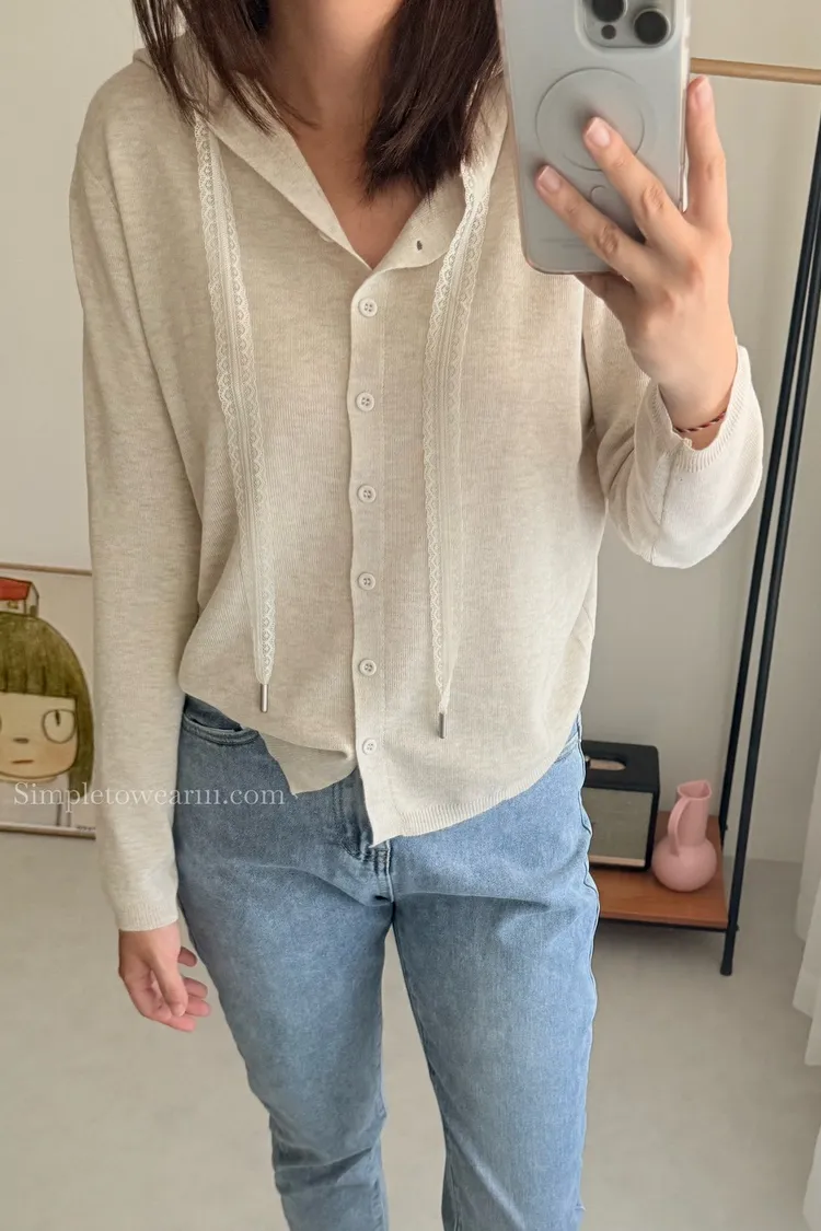 蕾絲綁帶鈕扣連帽針織外套 (酒紅/深藍/燕麥/深灰)