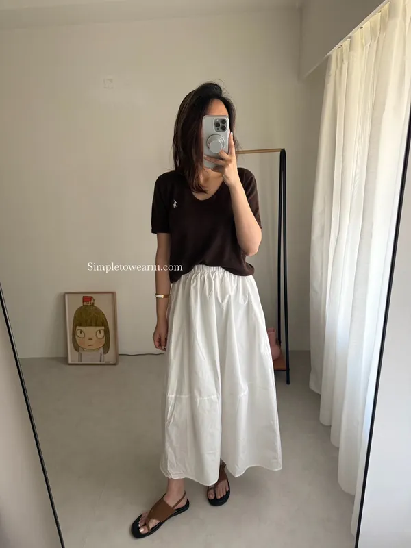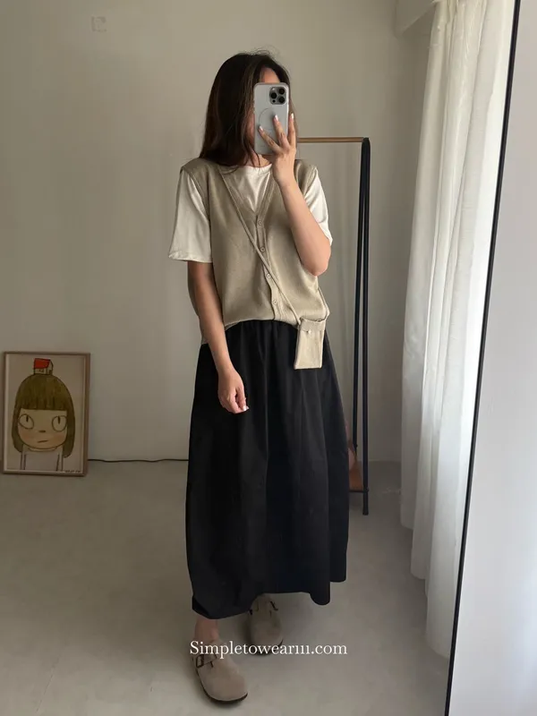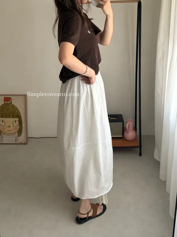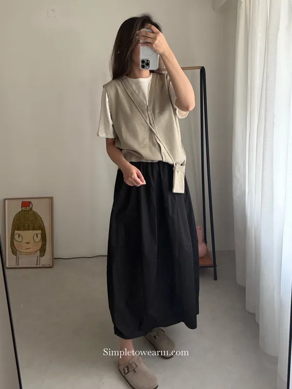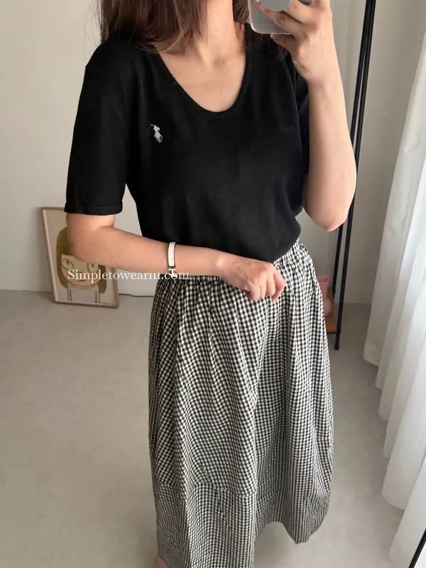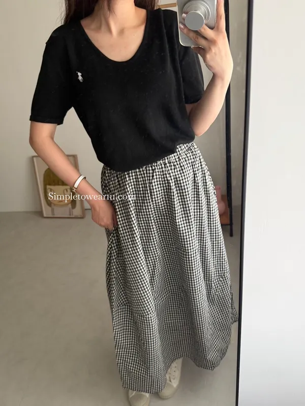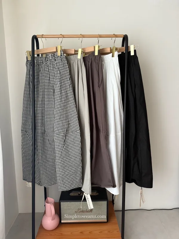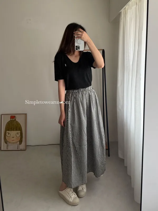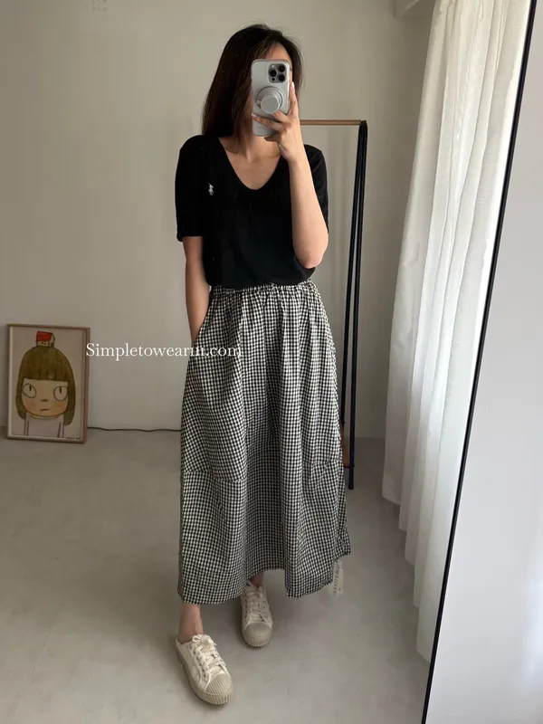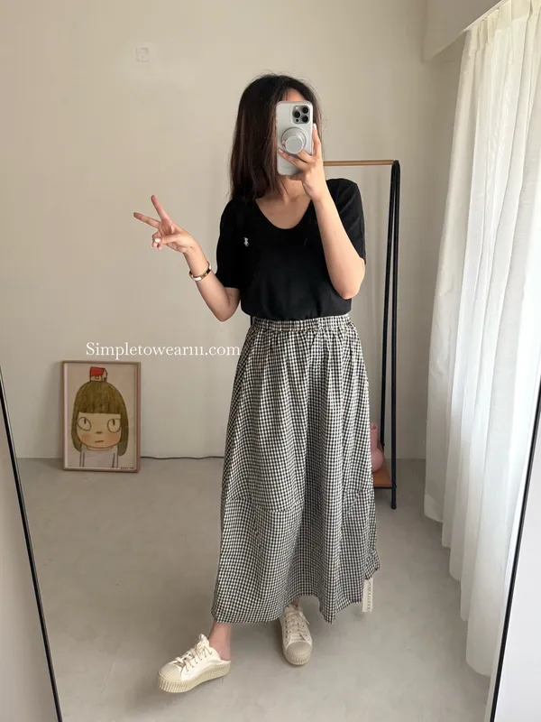 韓系簡約百搭顯瘦花苞裙 (咖灰/豆綠/黑格/白/黑)