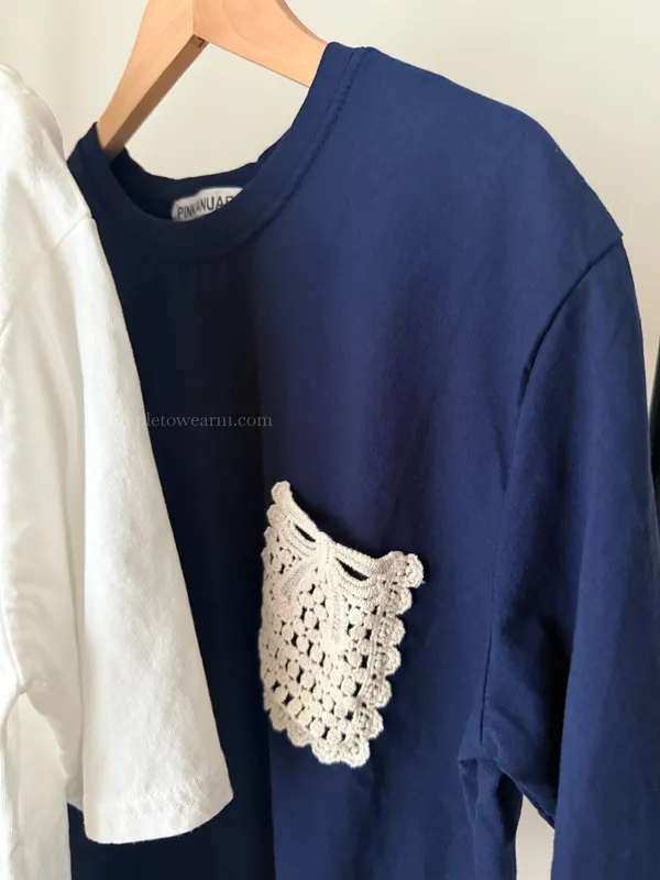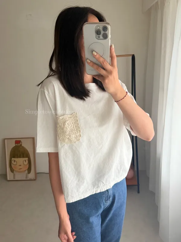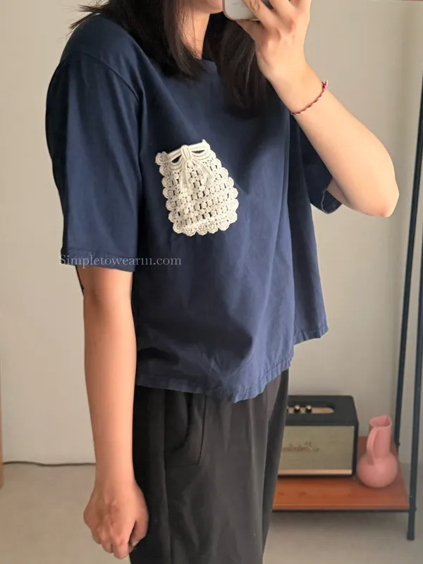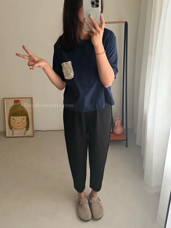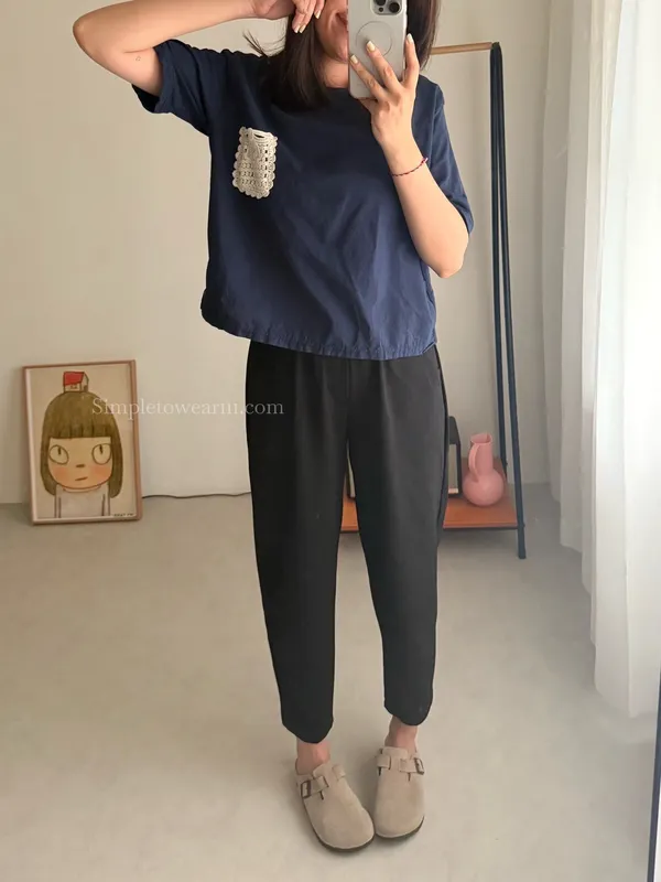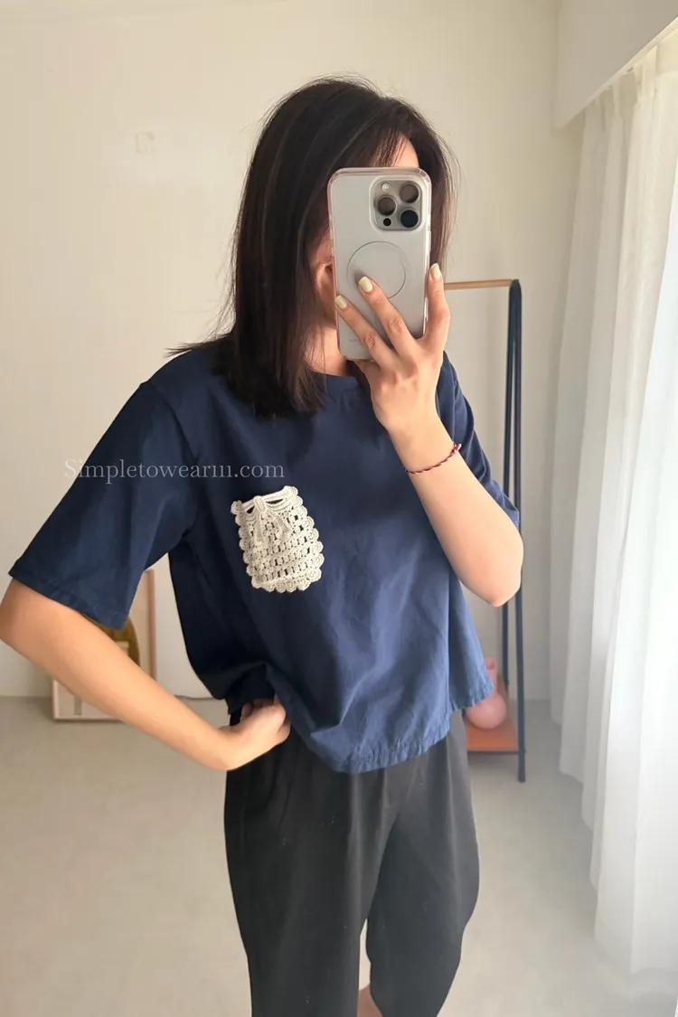 韓 日系感 蕾絲口袋棉麻短TEE (深藍/白)