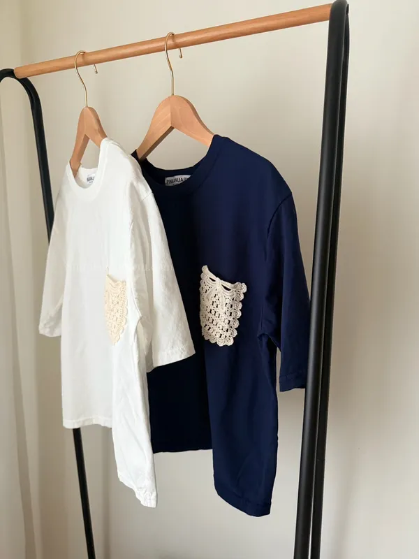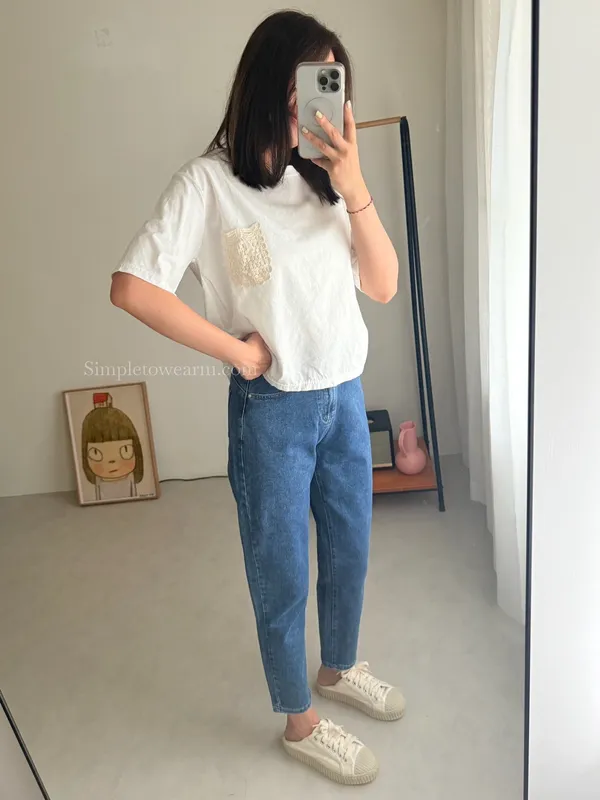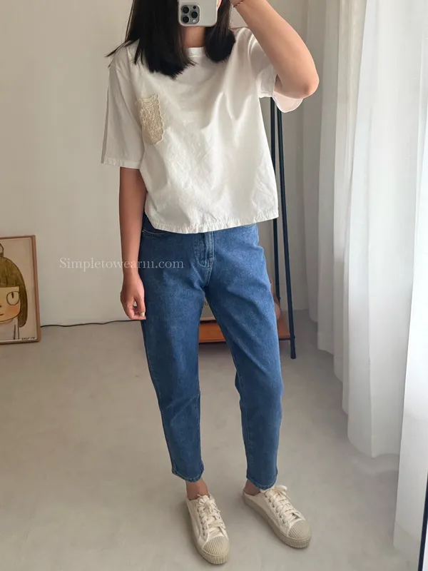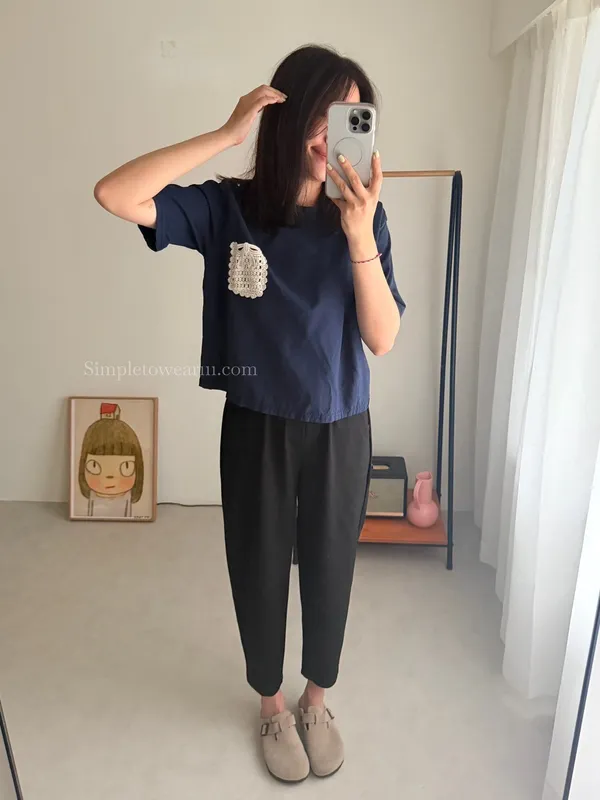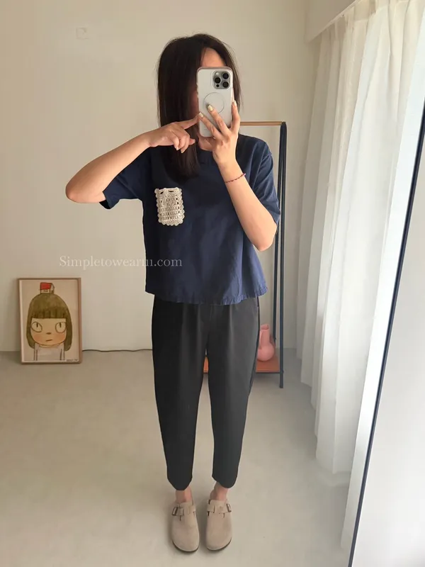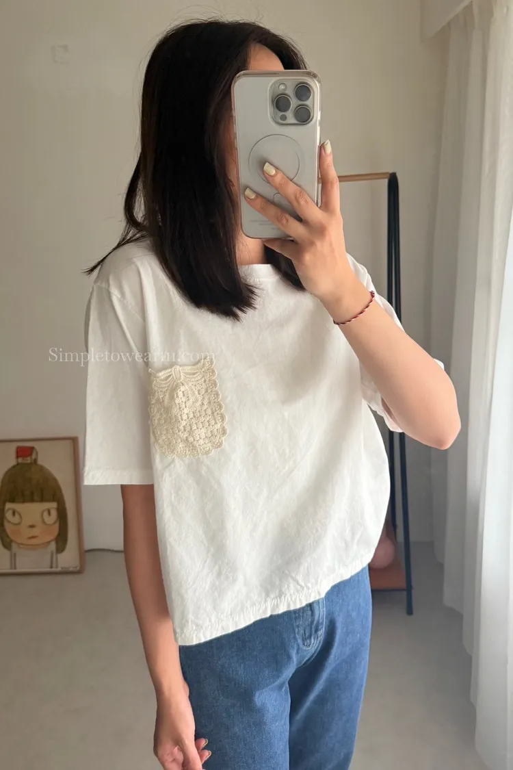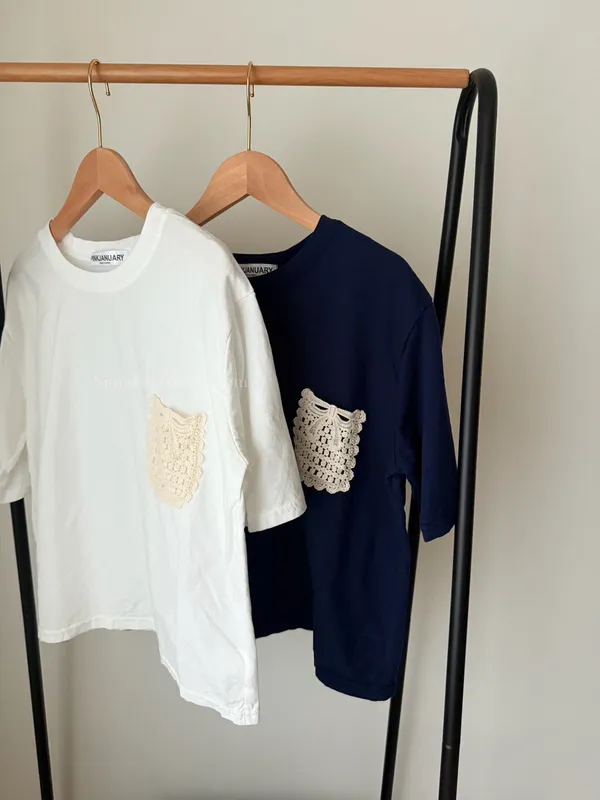 韓 日系感 蕾絲口袋棉麻短TEE (深藍/白)