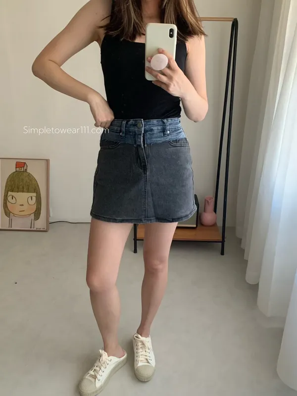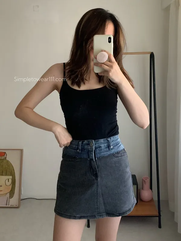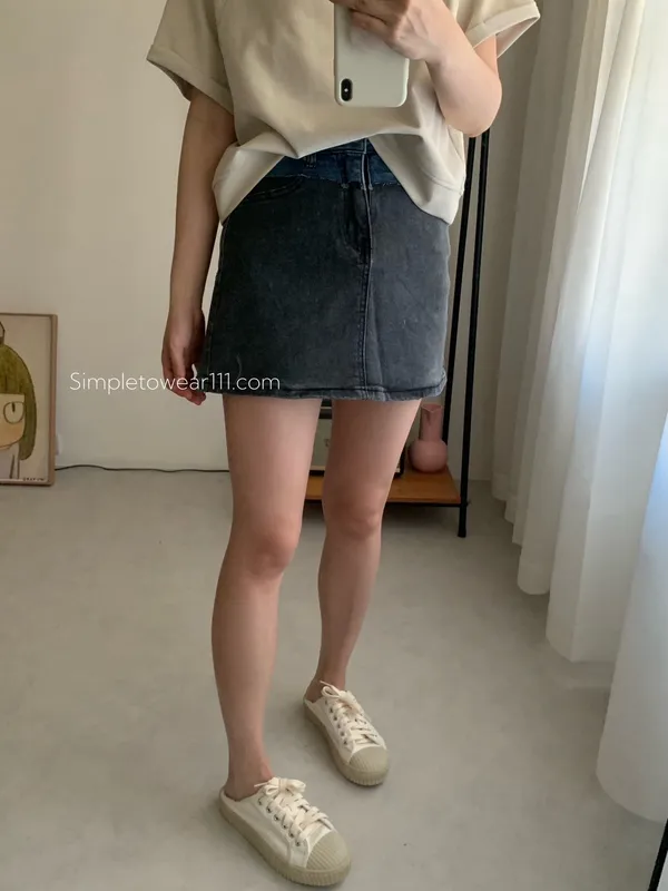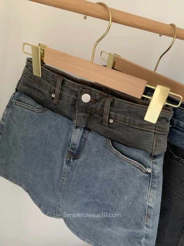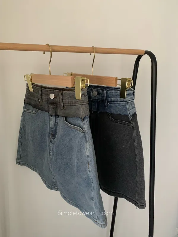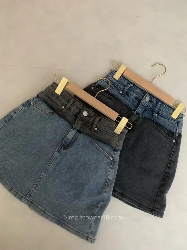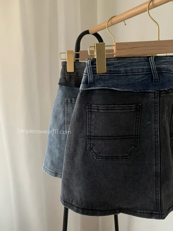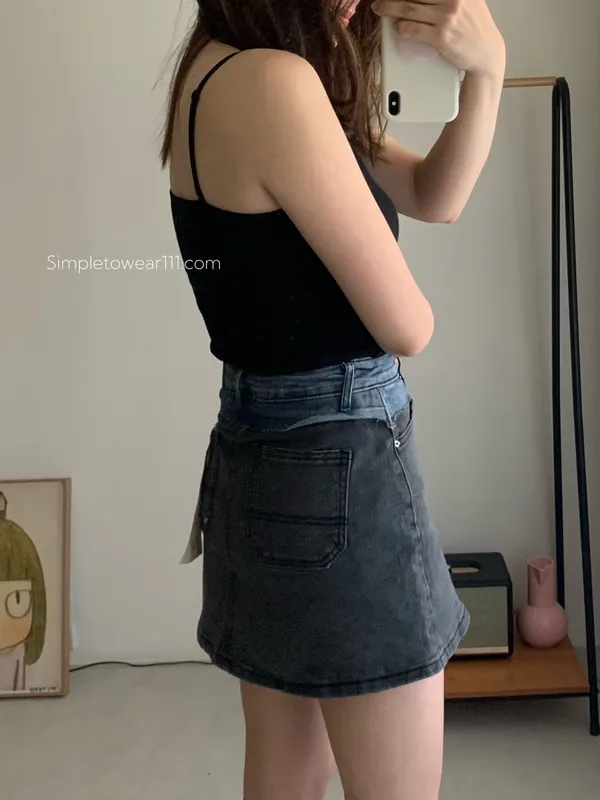 韓 撞色剪接牛仔短裙 (藍/黑) S~XL