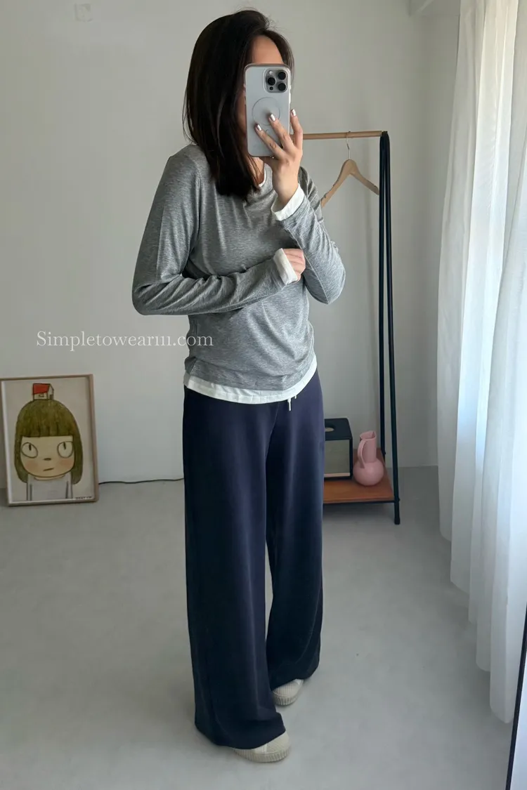 質料好舒服~ ALO刺繡寬版腰落地褲 (藍/深灰) M/L