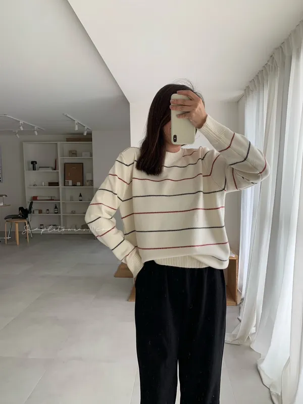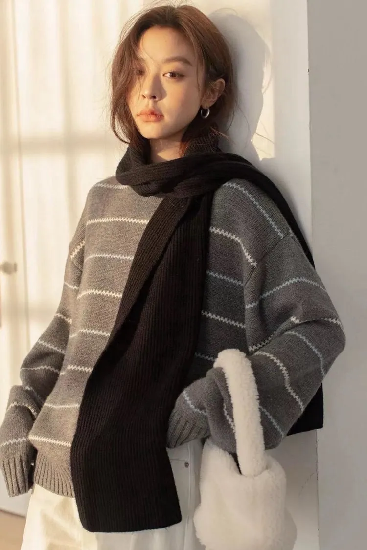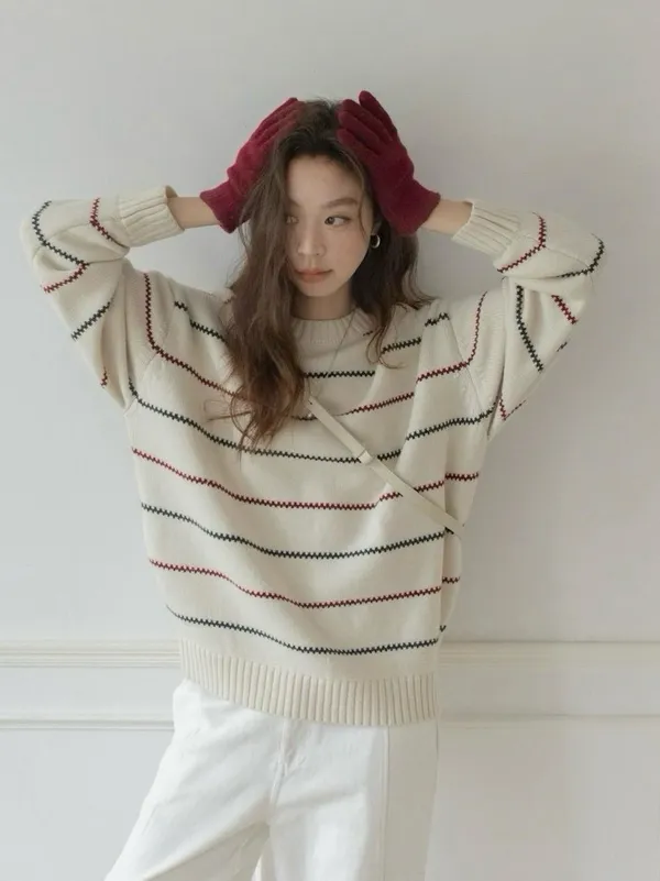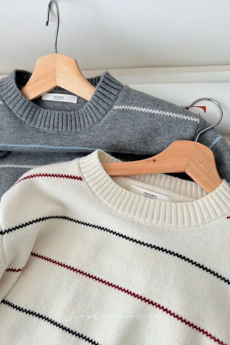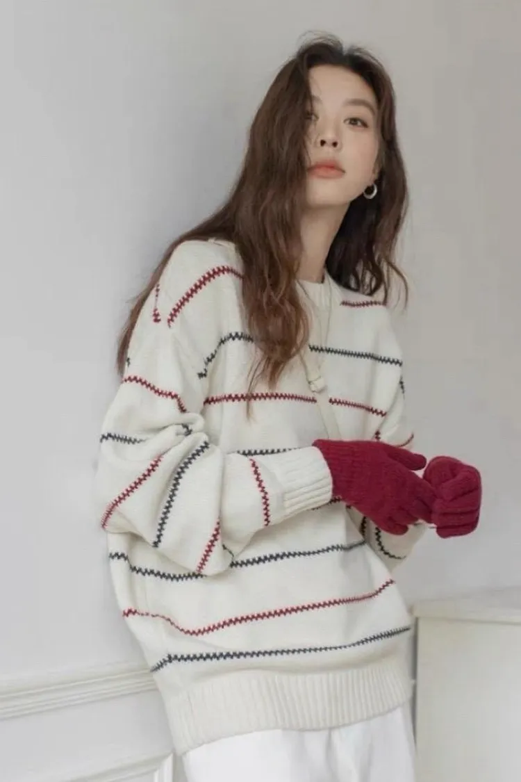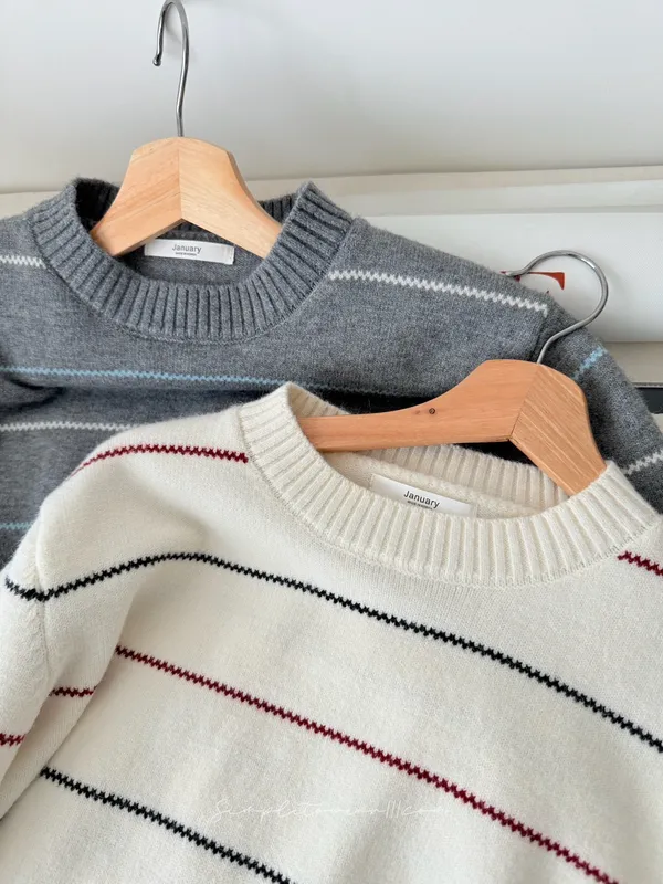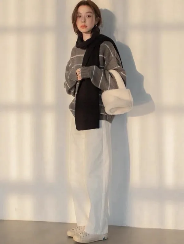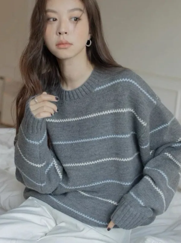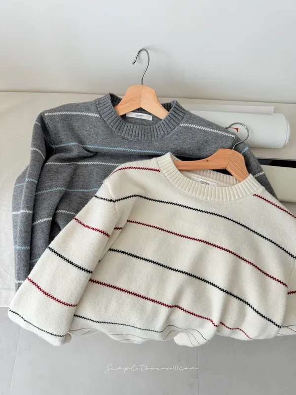N14 韓 暖呼呼條紋針織上衣 (米白/灰)