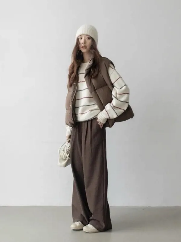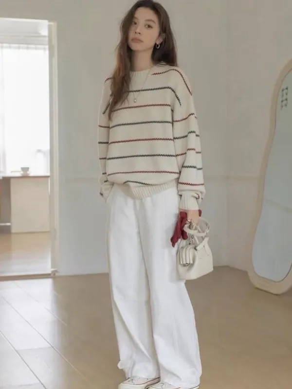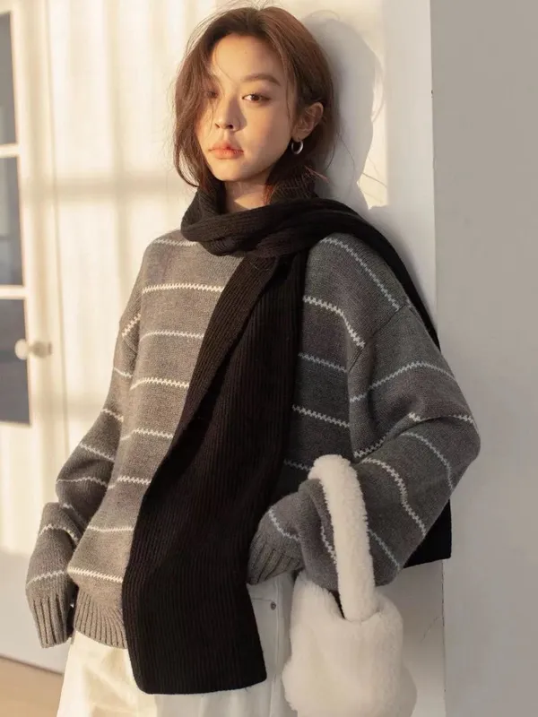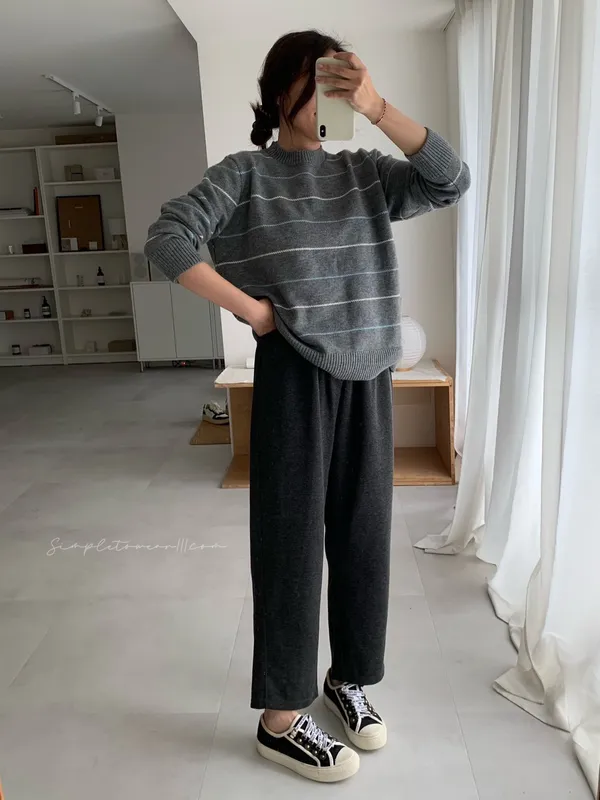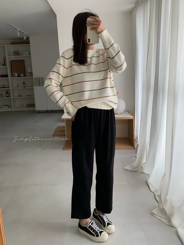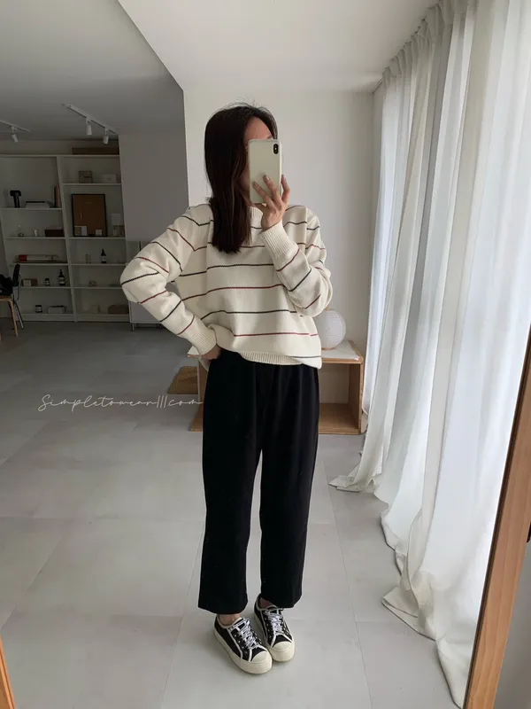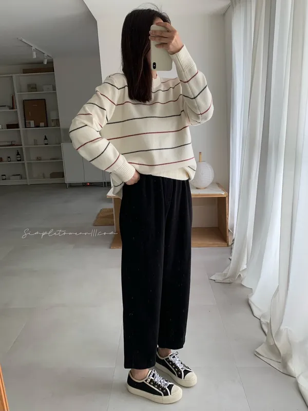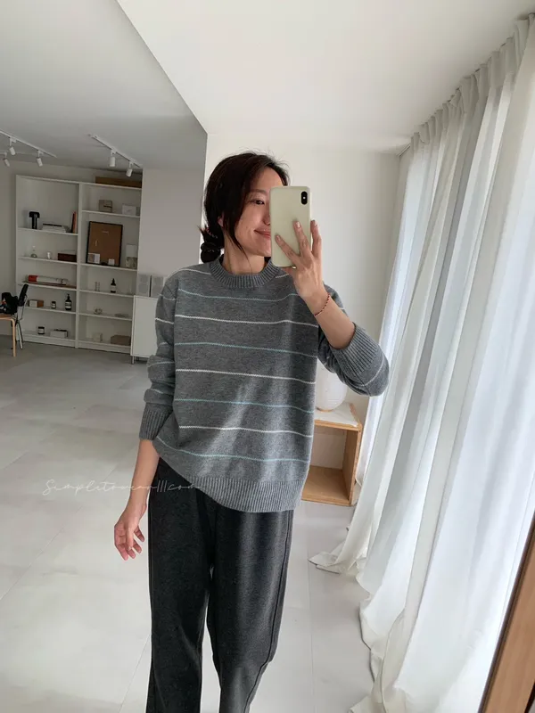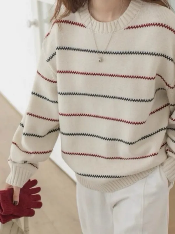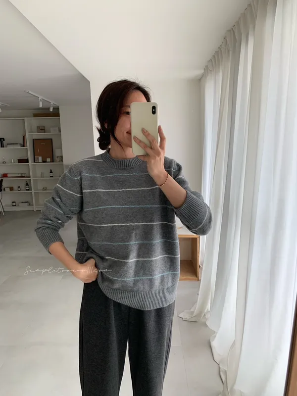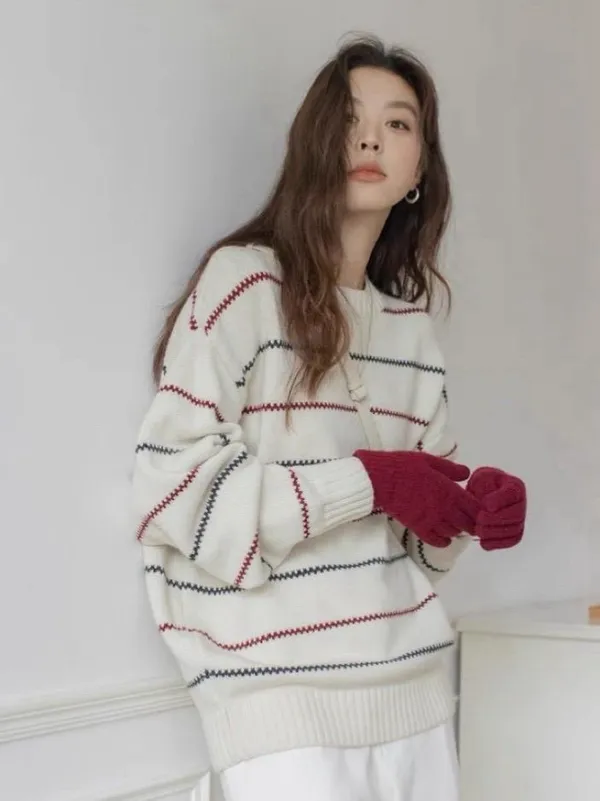 N14 韓 暖呼呼條紋針織上衣 (米白/灰)