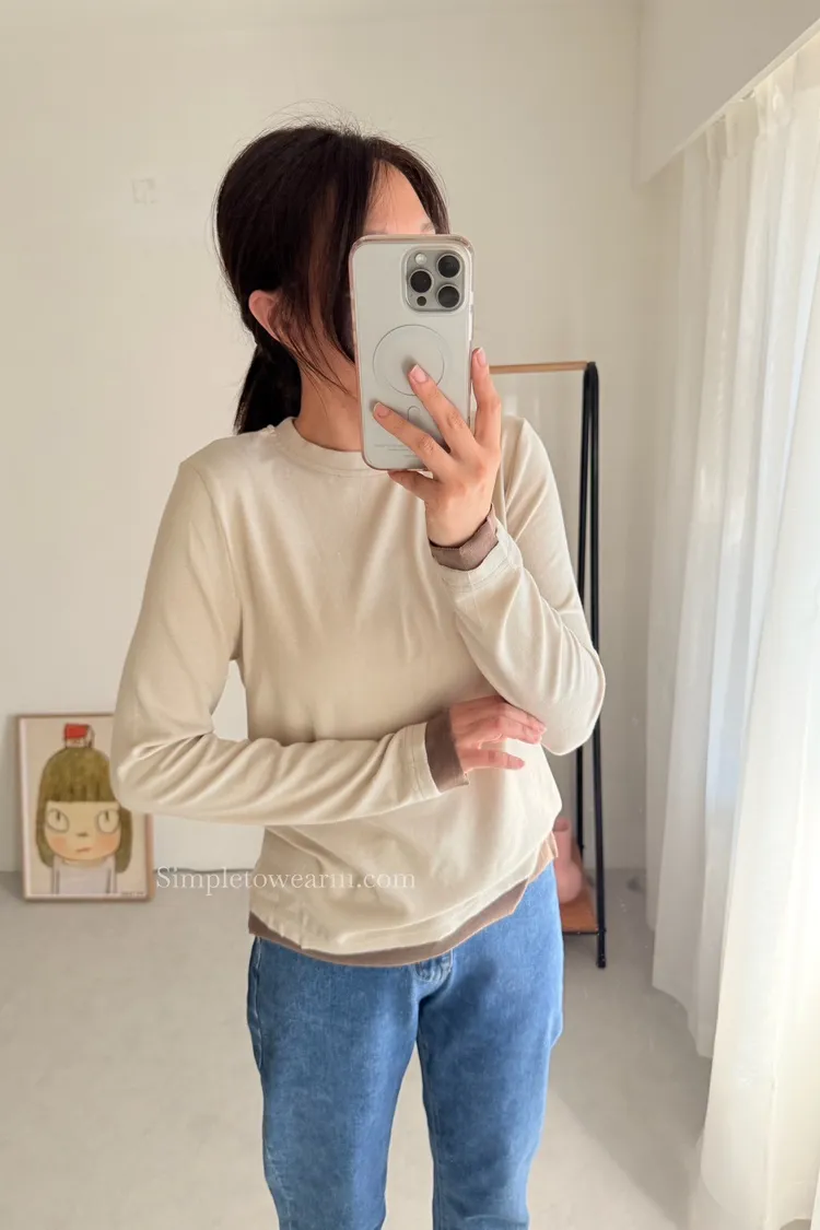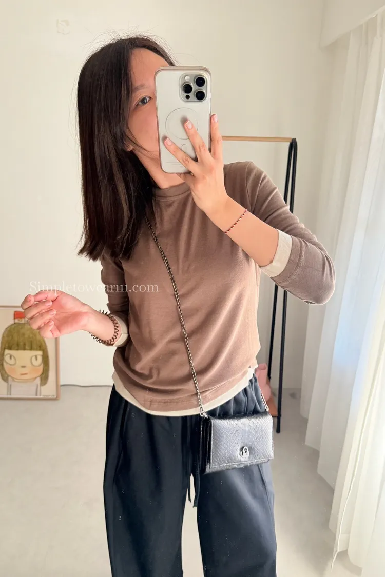 (現貨) 撞色舒服圓領棉質長袖TEE (杏/咖)