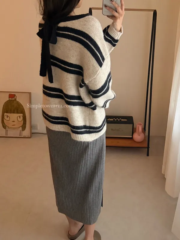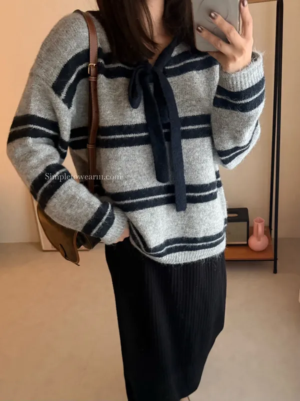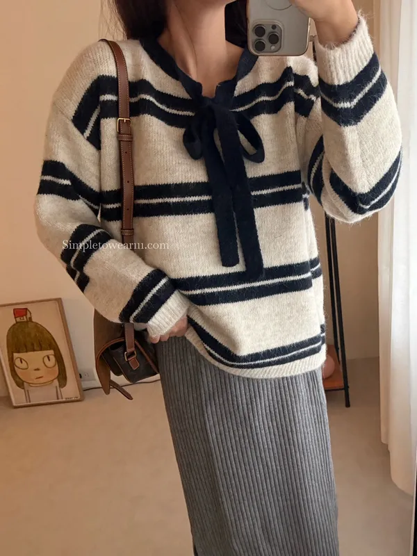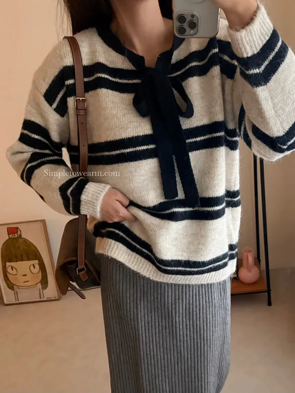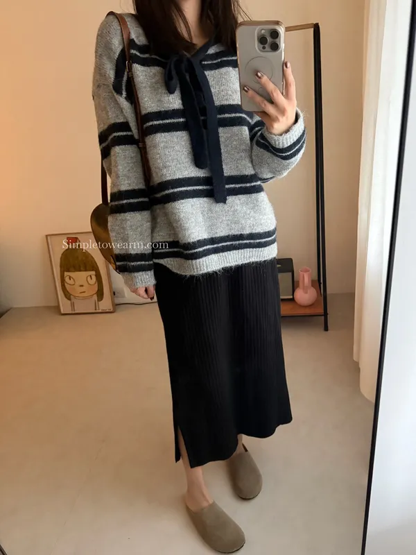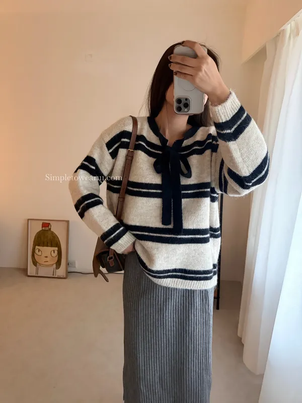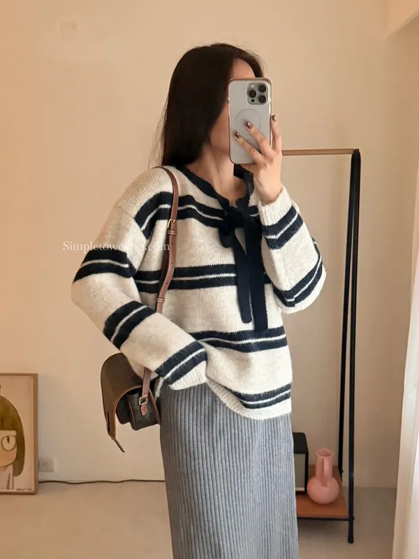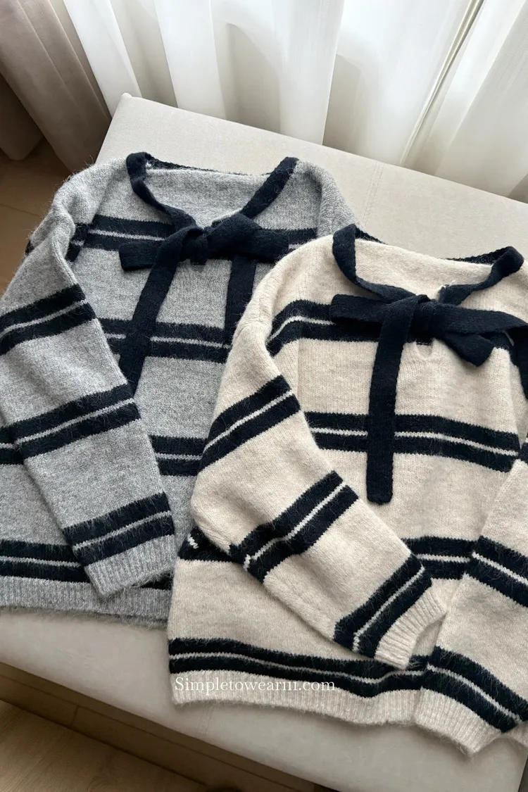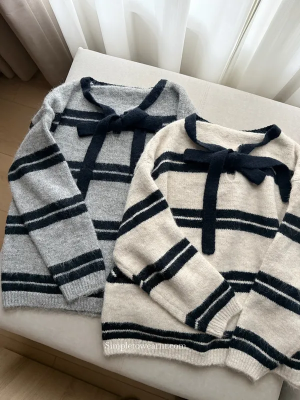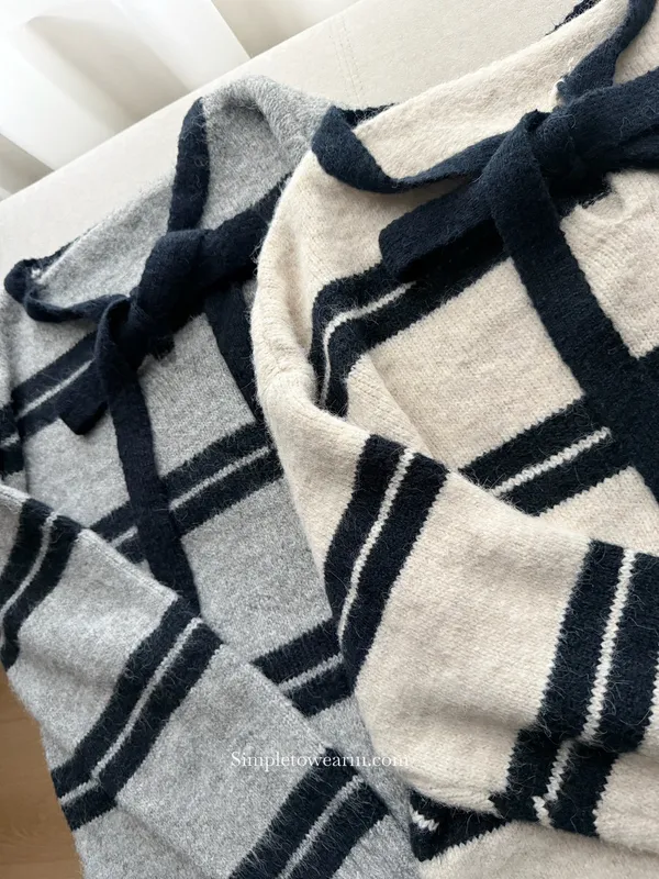 蝴蝶結綁帶針織上衣 (深灰/米杏)