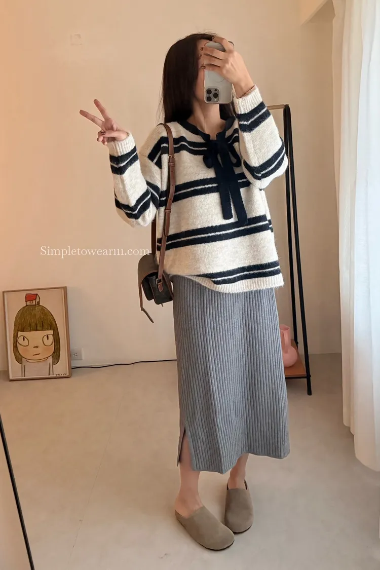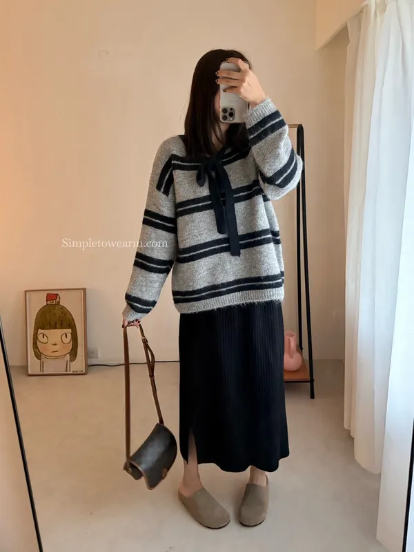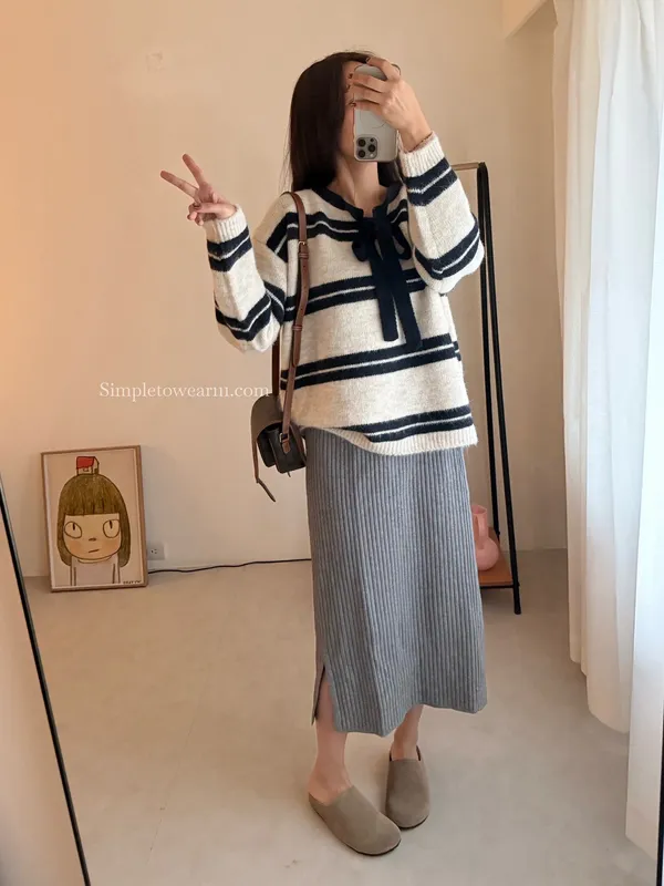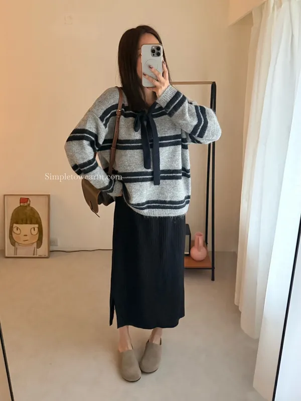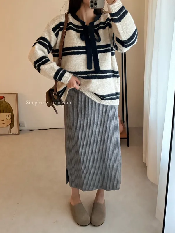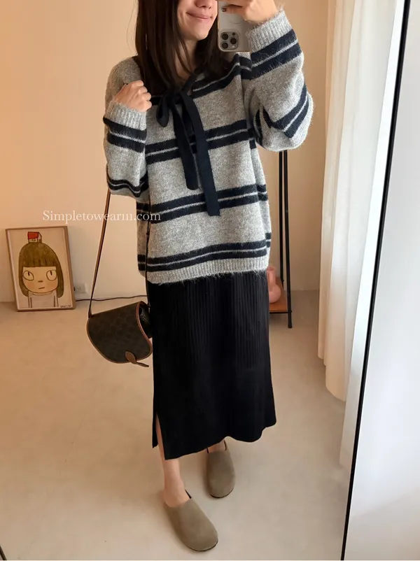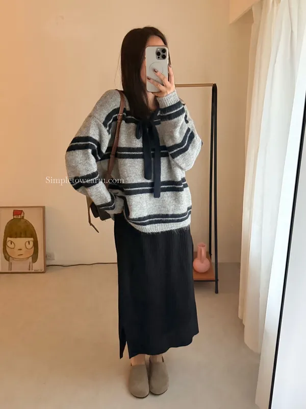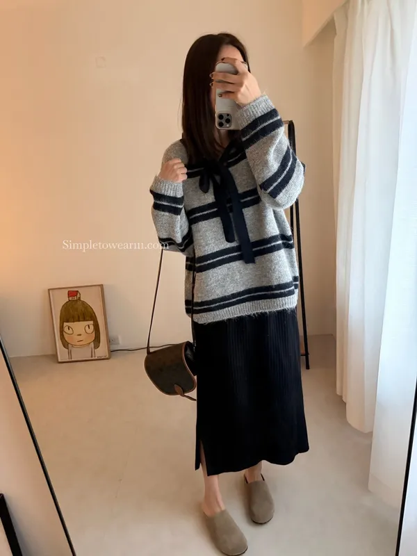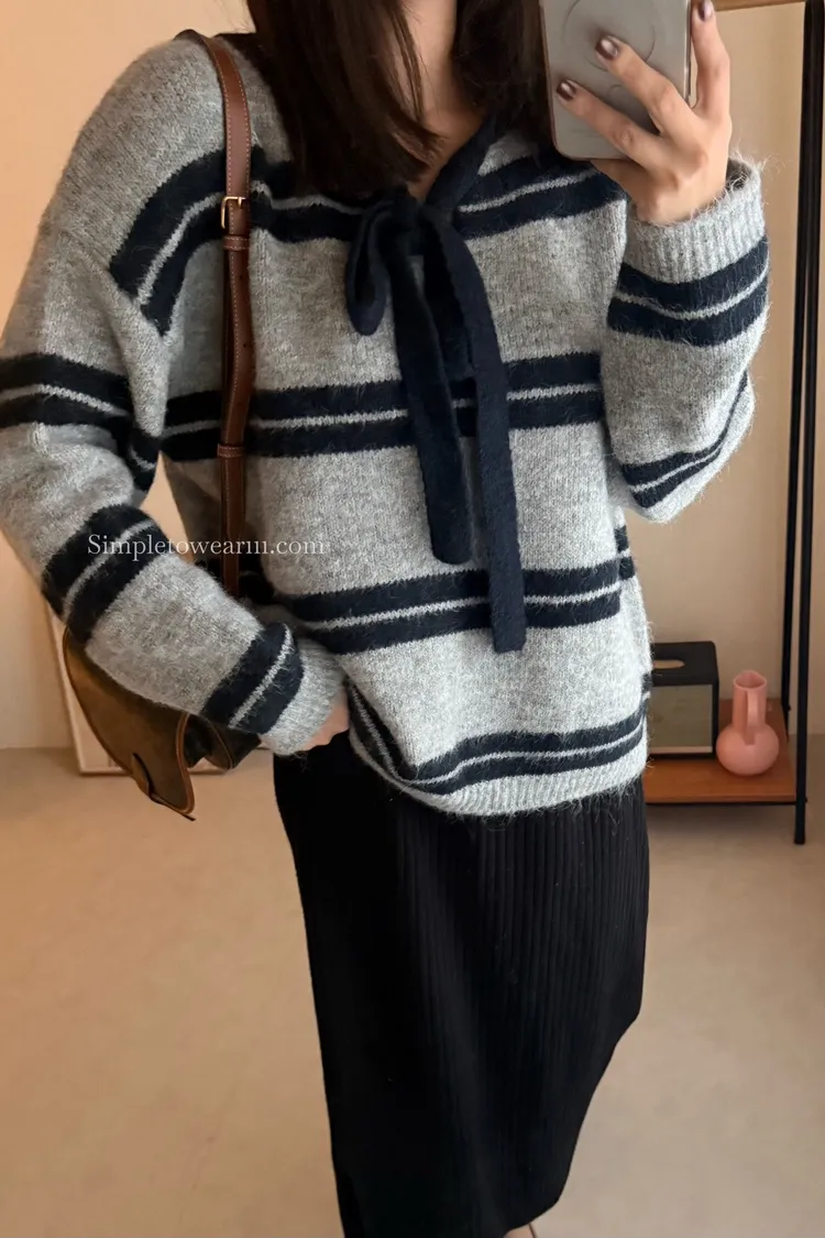 蝴蝶結綁帶針織上衣 (深灰/米杏)