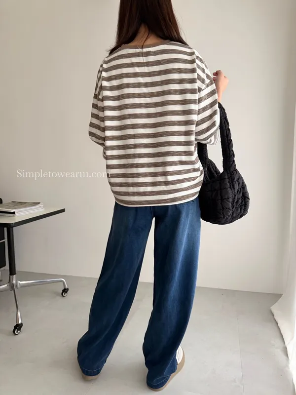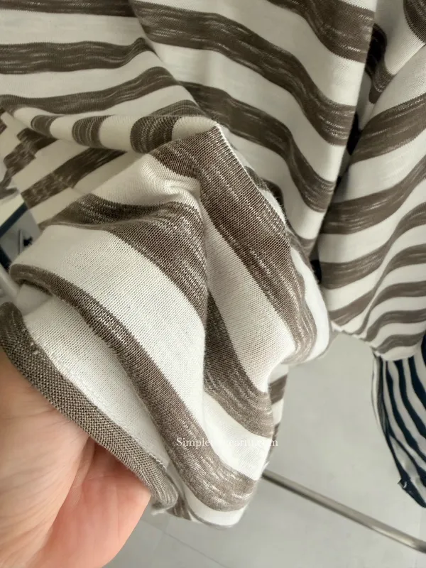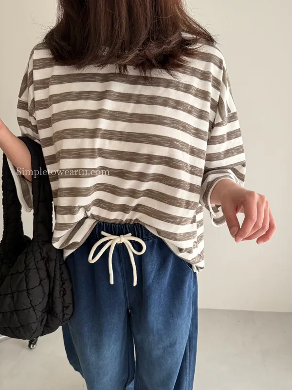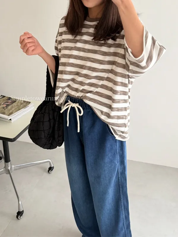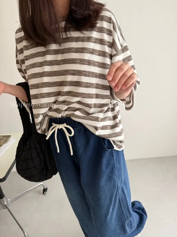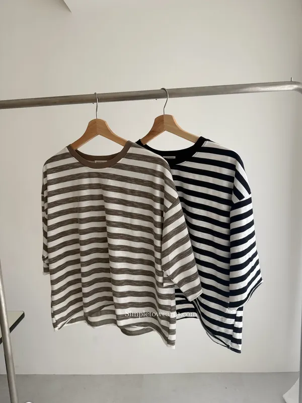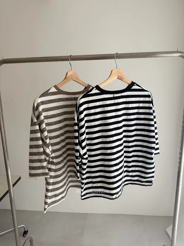 韓 粗節條紋五分袖TEE (卡其/黑)