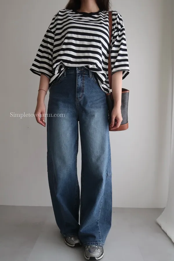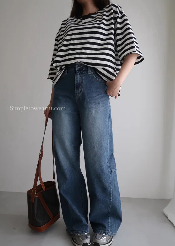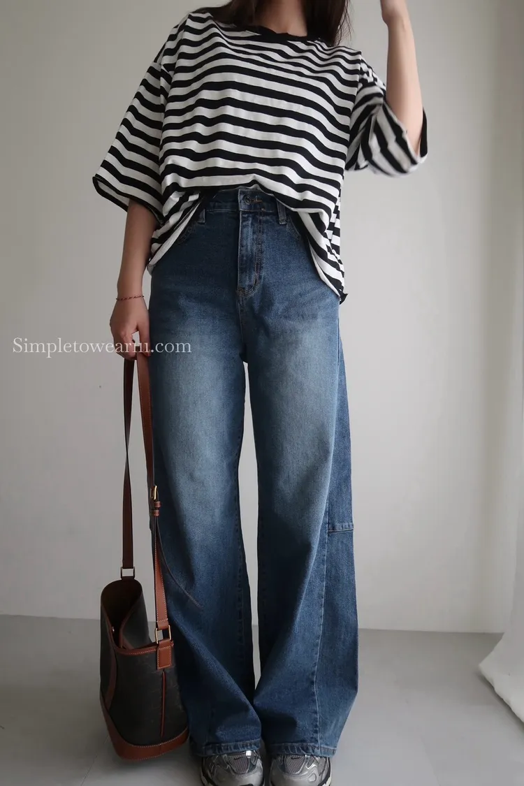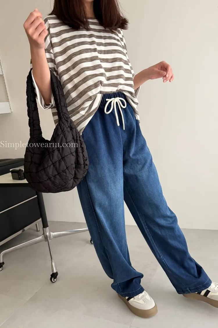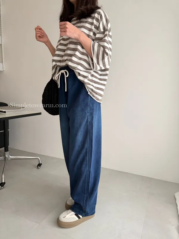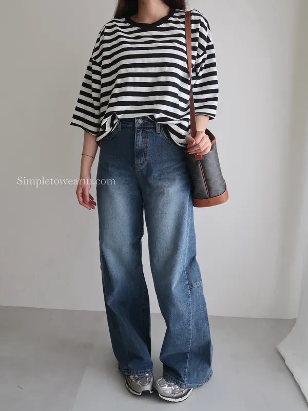 韓 粗節條紋五分袖TEE (卡其/黑)