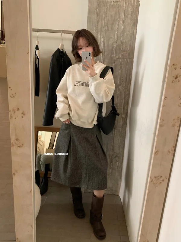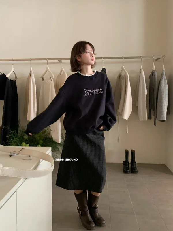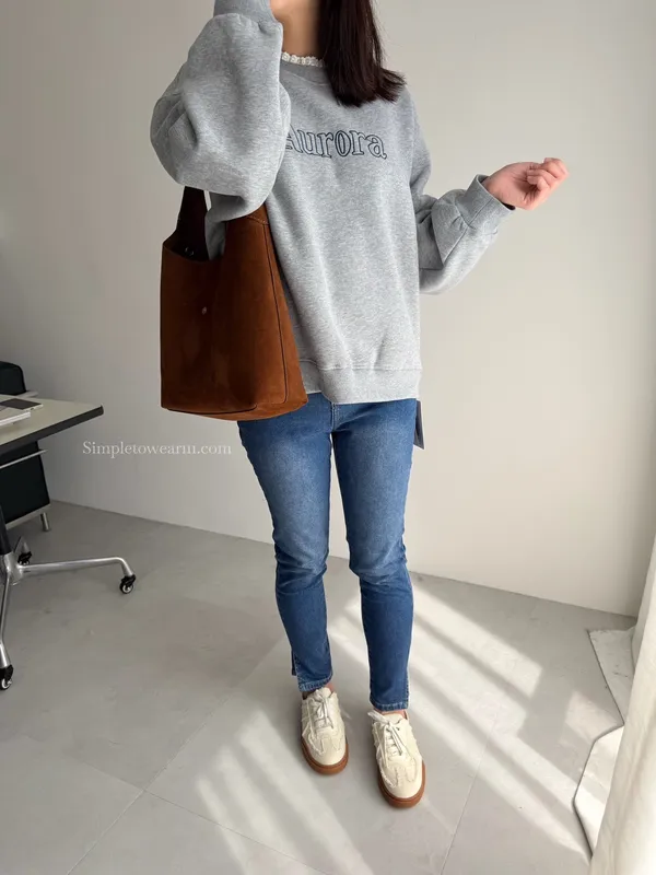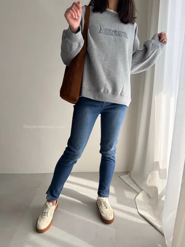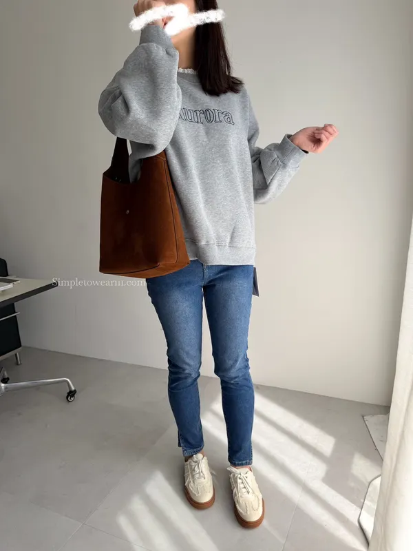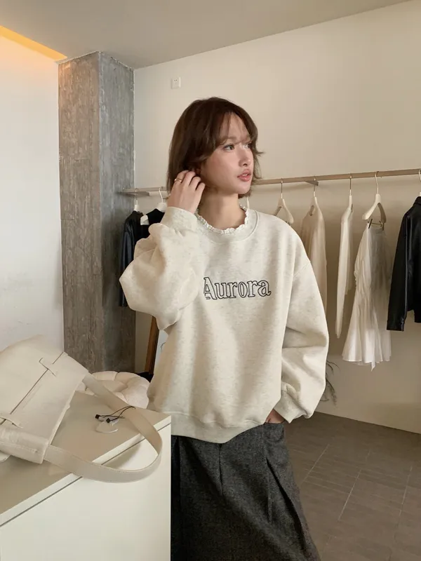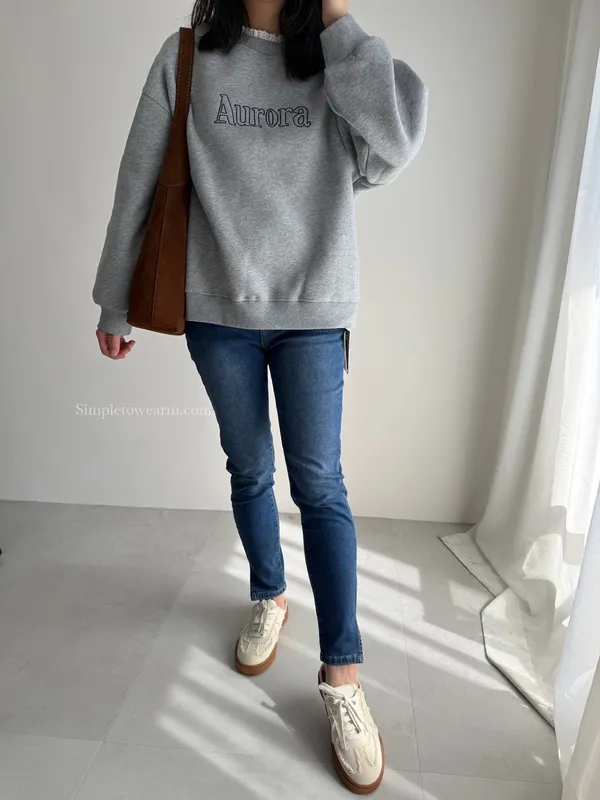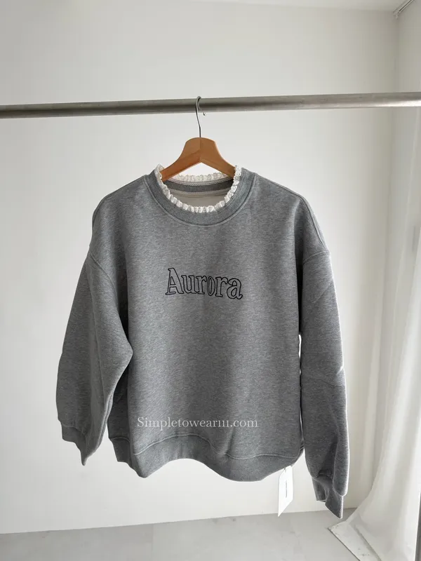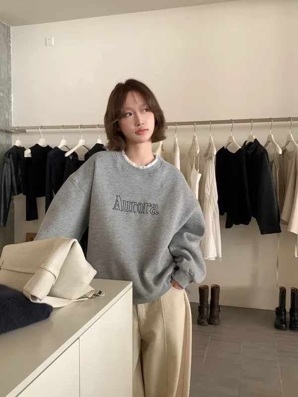 刷毛暖暖蕾絲領口大學TEE (灰/燕麥/深藍)