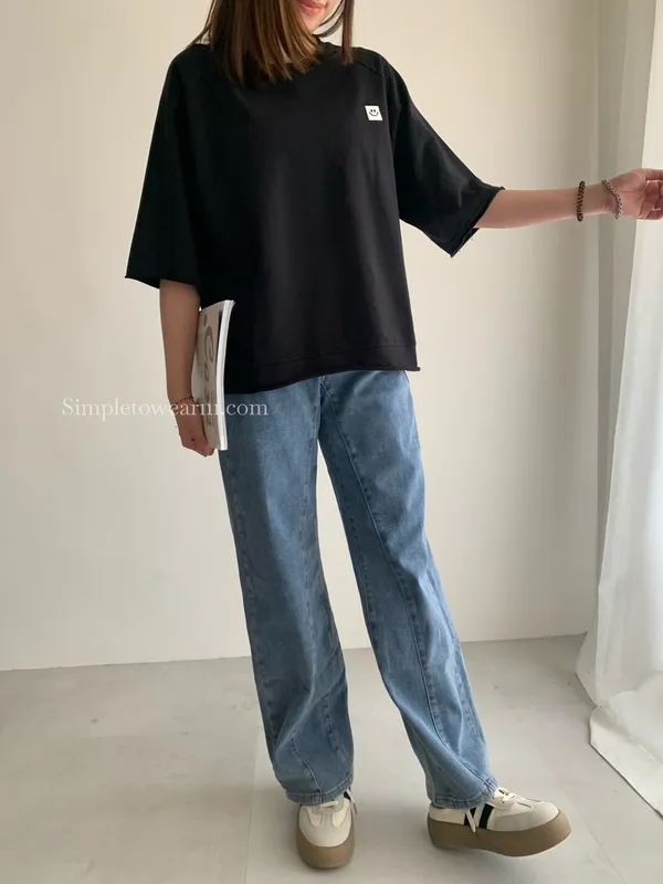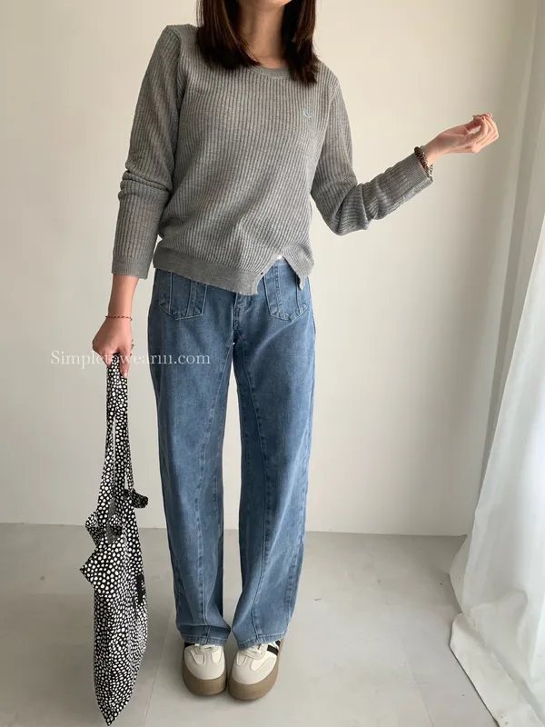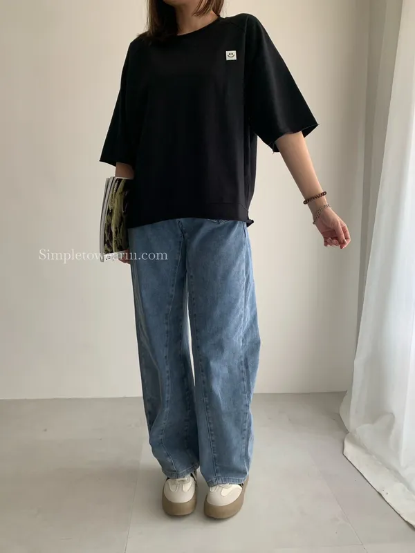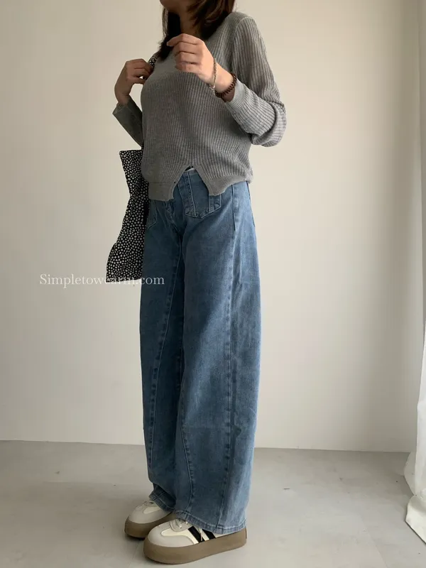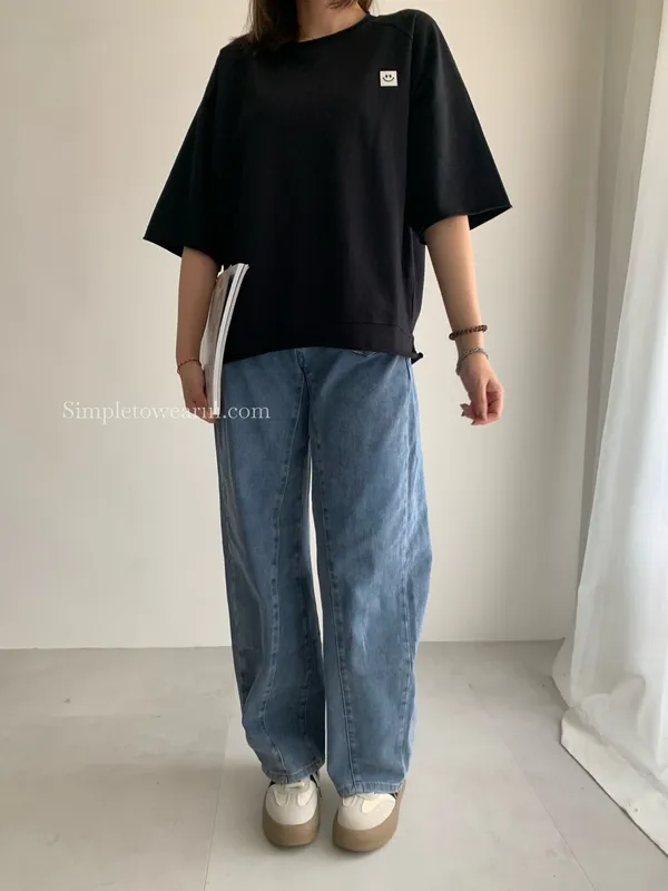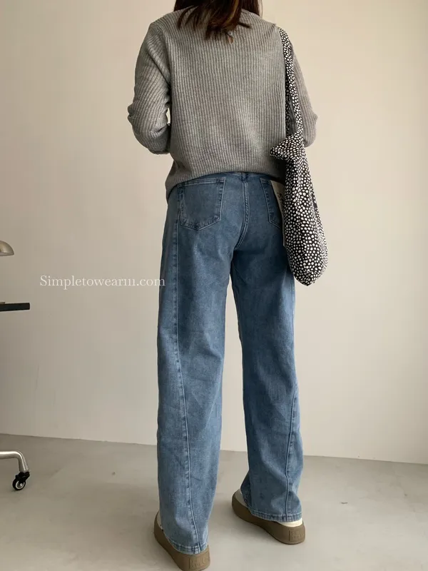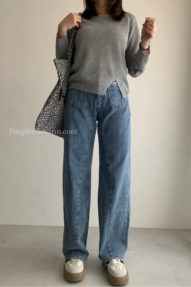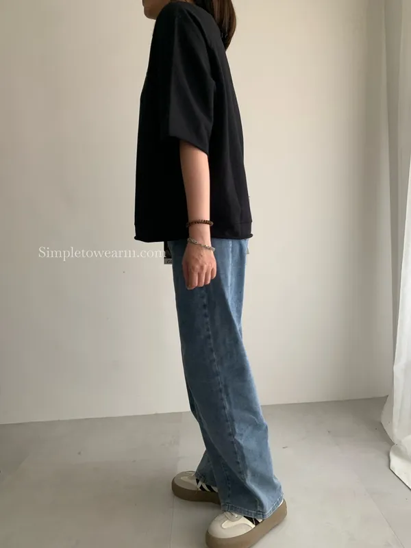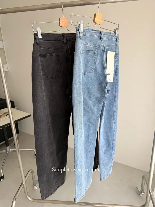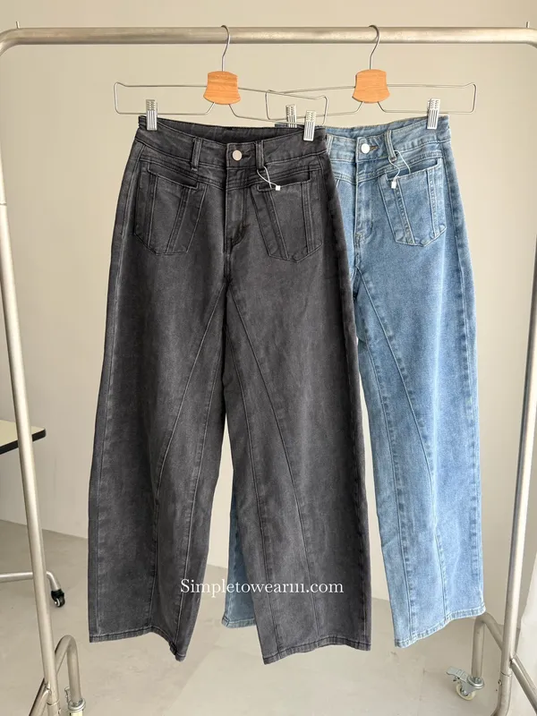 韓 口袋造型直筒寬褲 藍/黑 S~XL