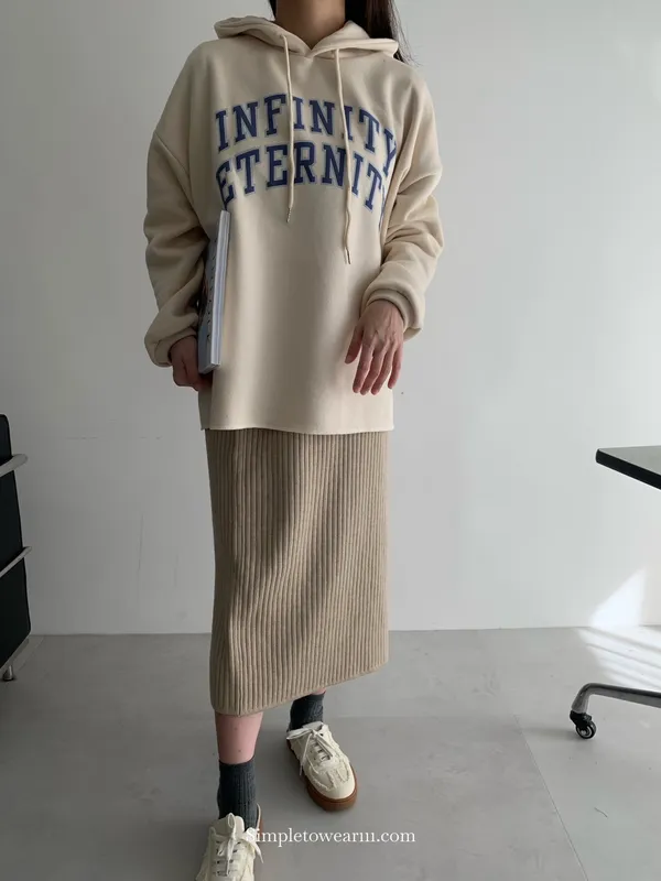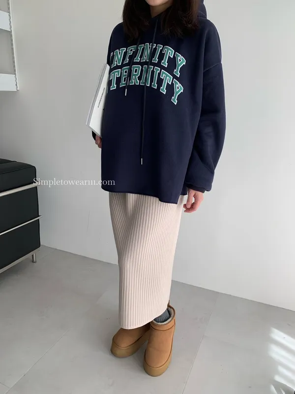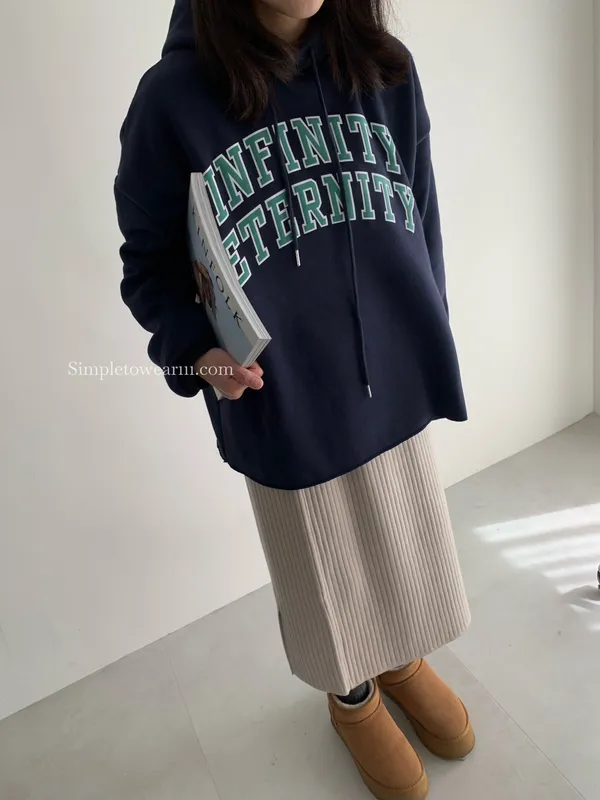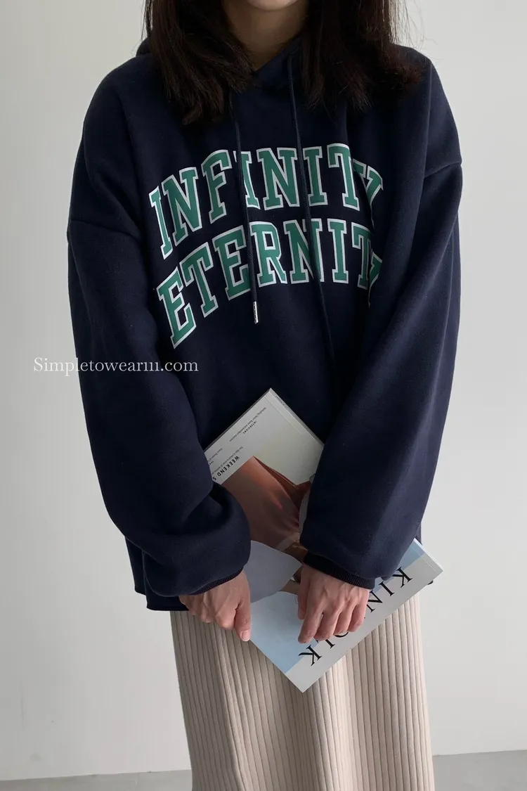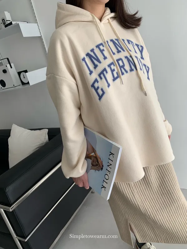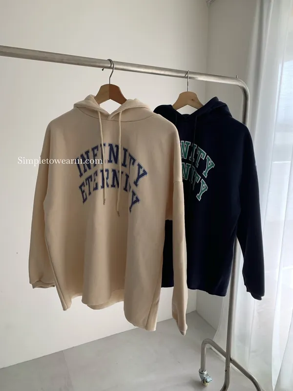 韓 INFINITY 刷毛連帽大學TEE (米杏/深藍)