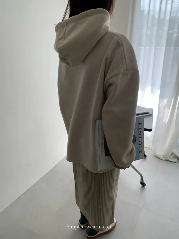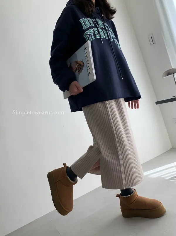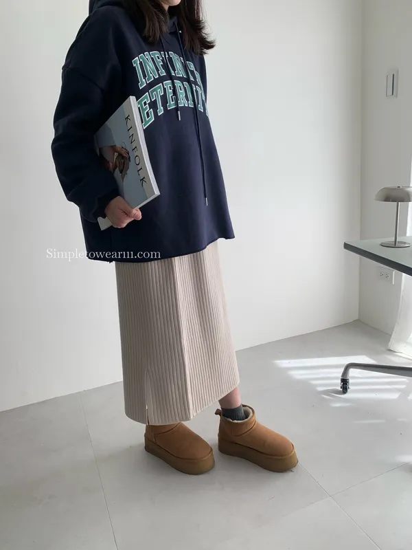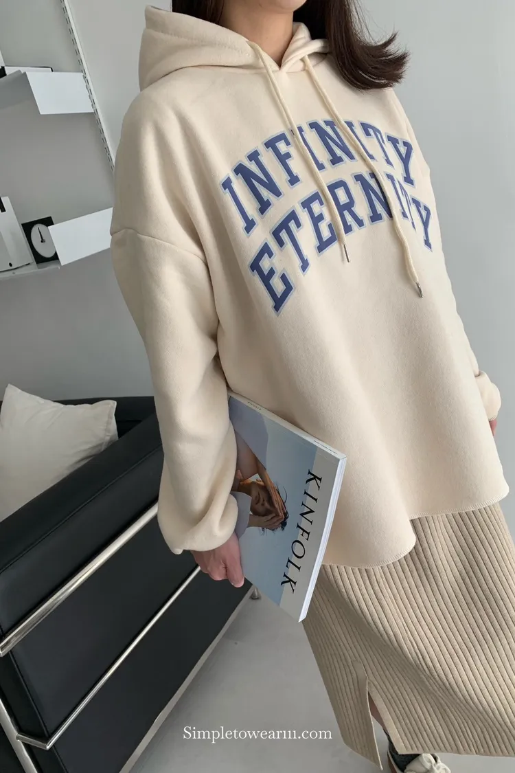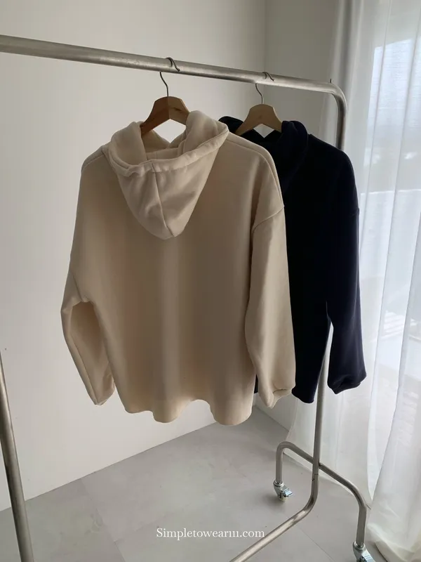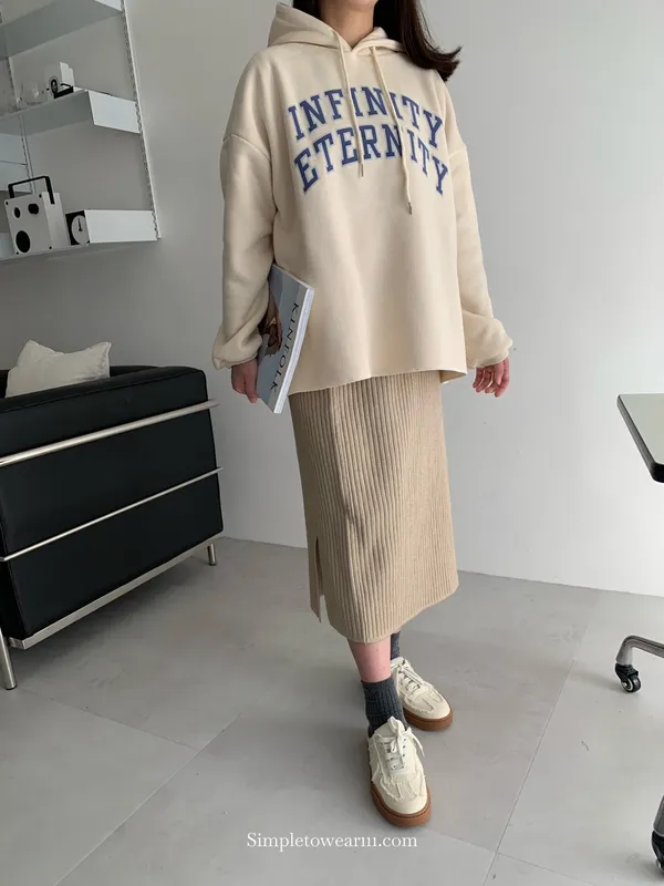 韓 INFINITY 刷毛連帽大學TEE (米杏/深藍)