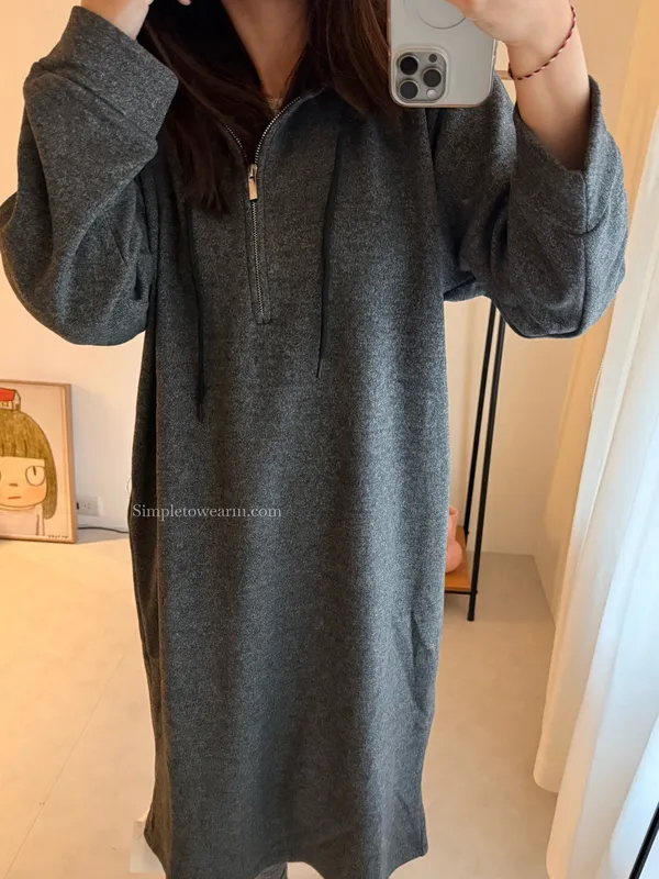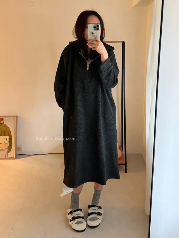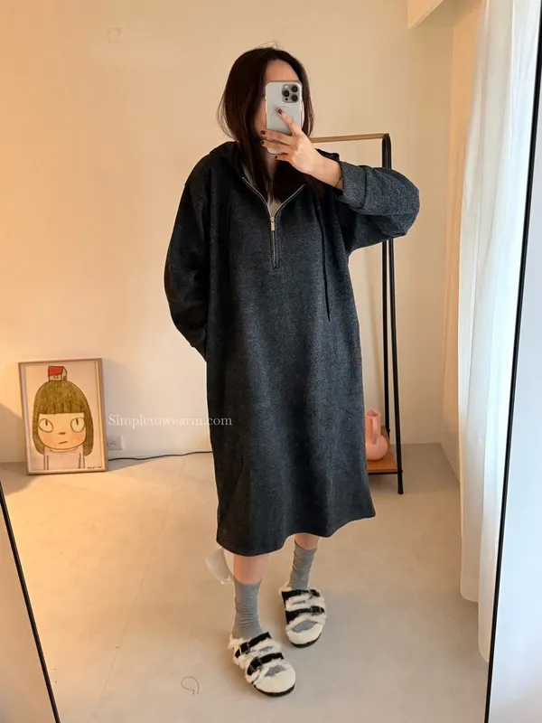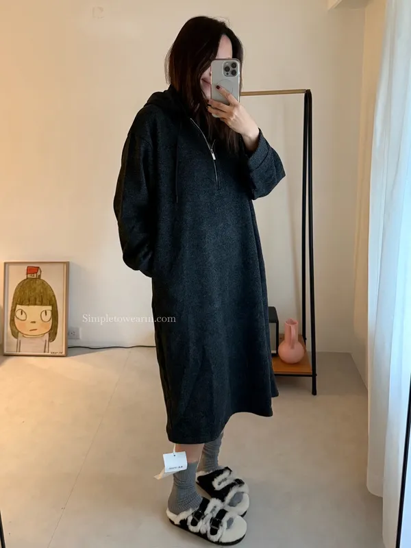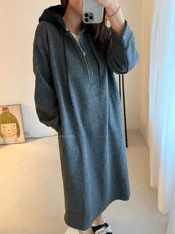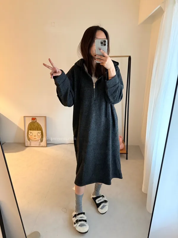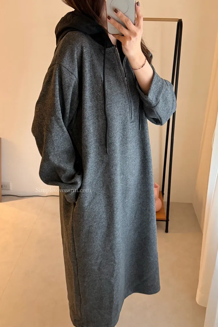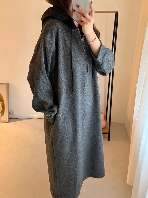 連帽厚磅內刷絨拉鍊長洋裝 (深灰/黑)