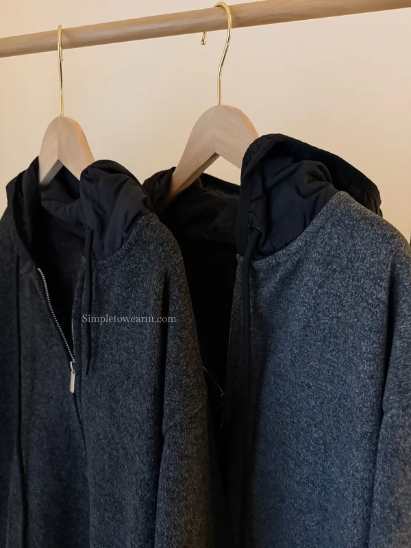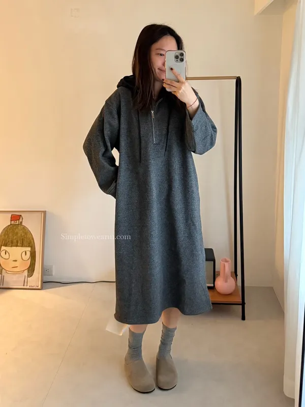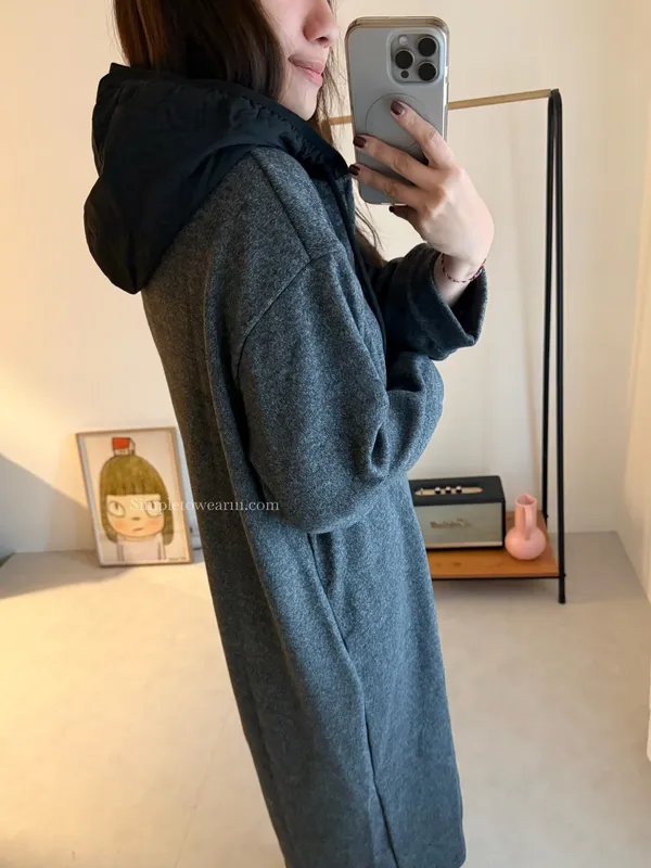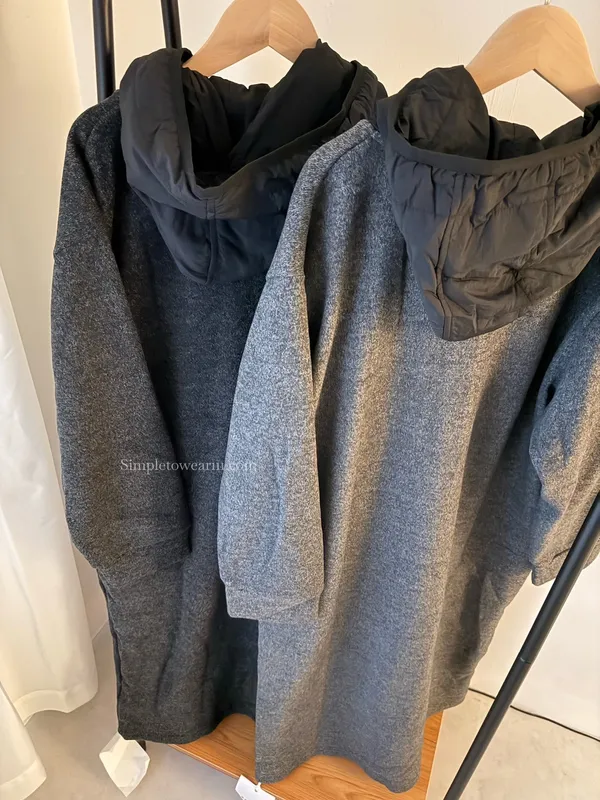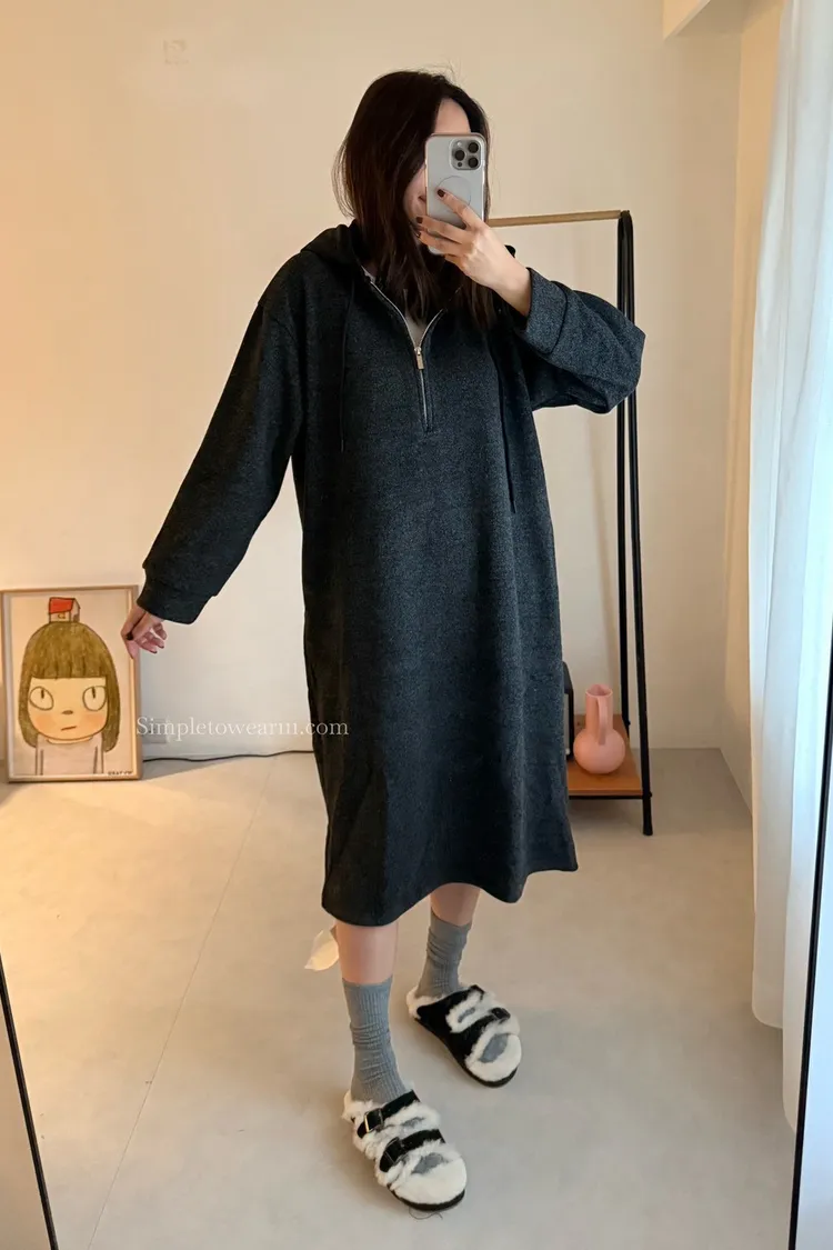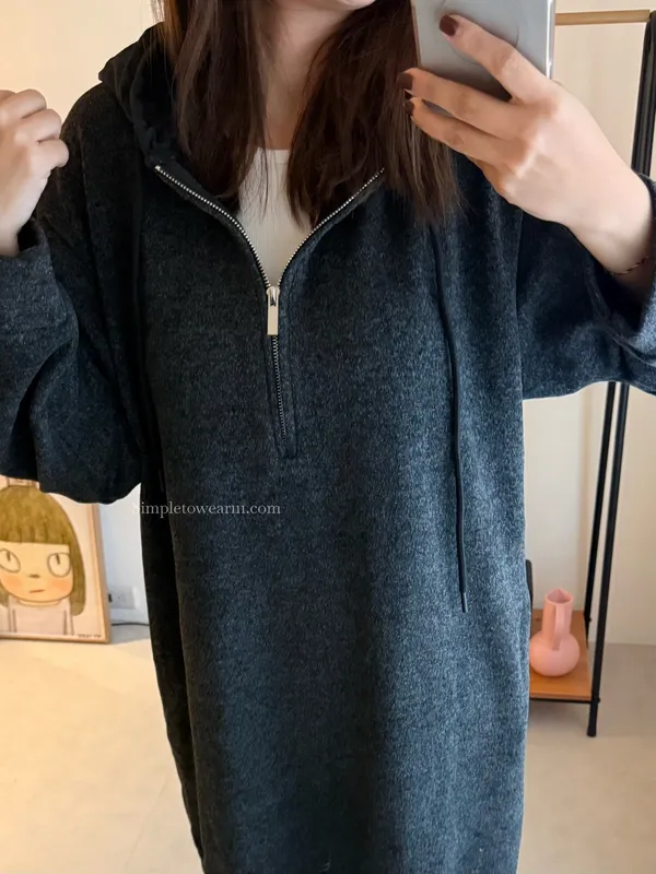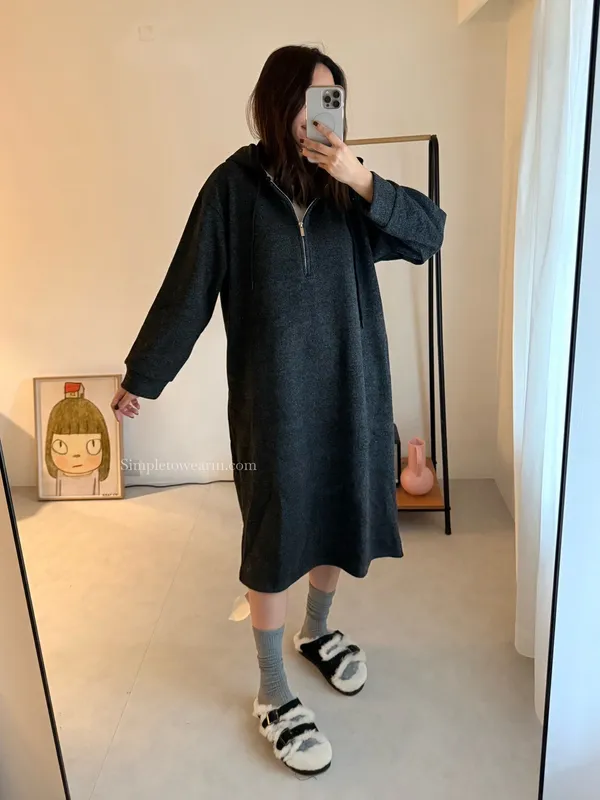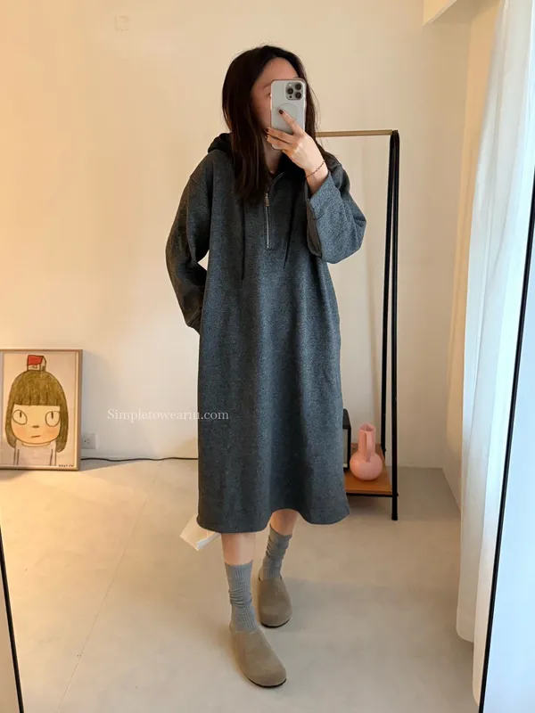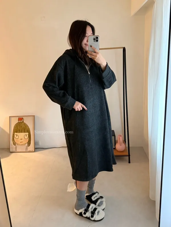連帽厚磅內刷絨拉鍊長洋裝 (深灰/黑)